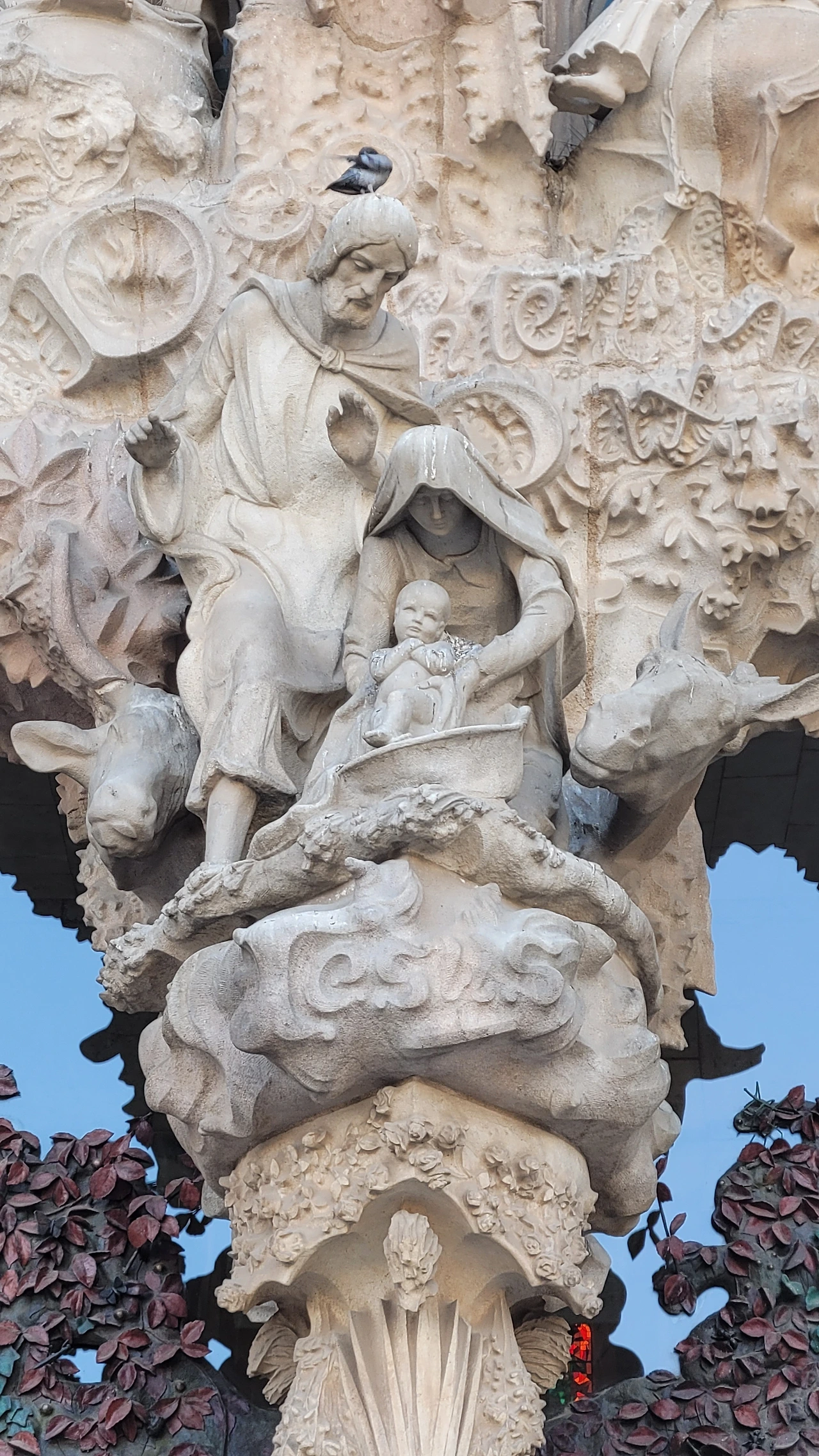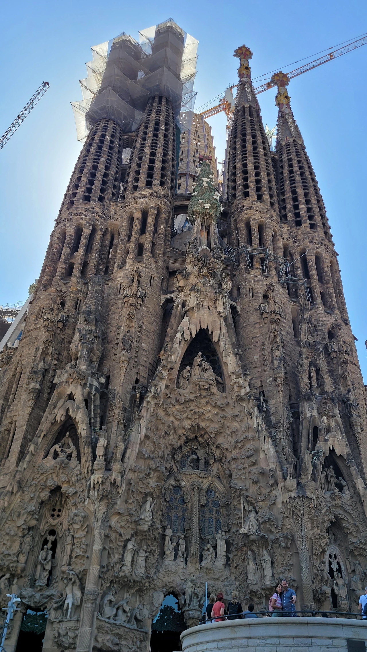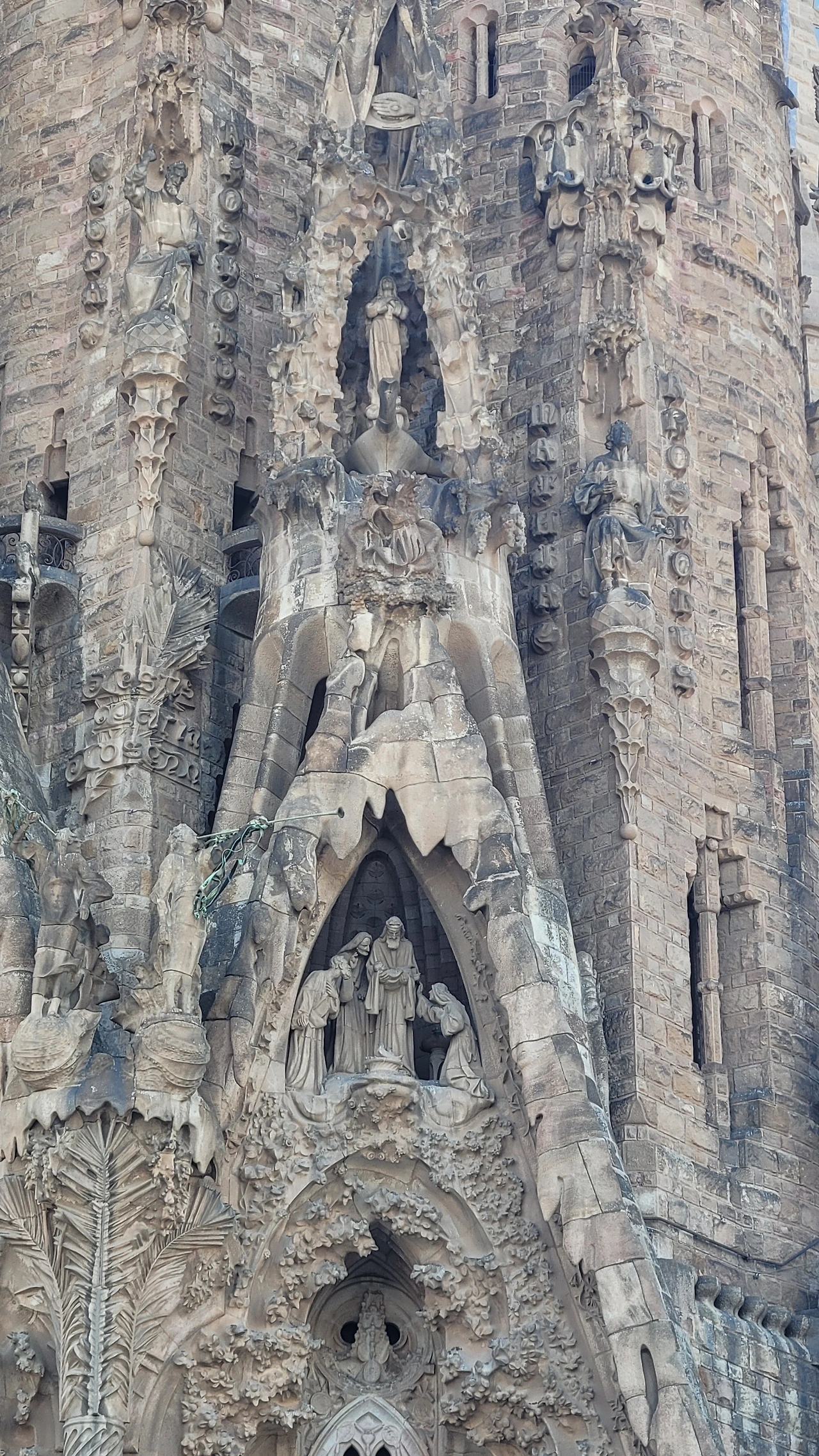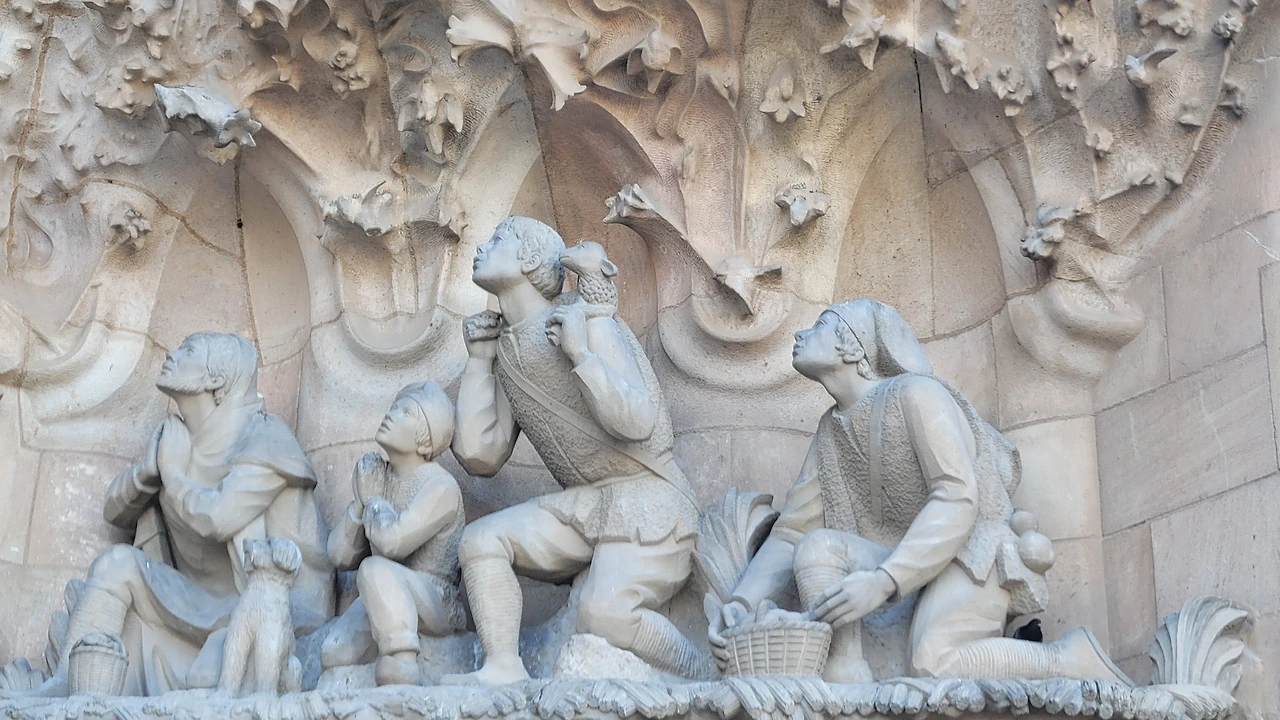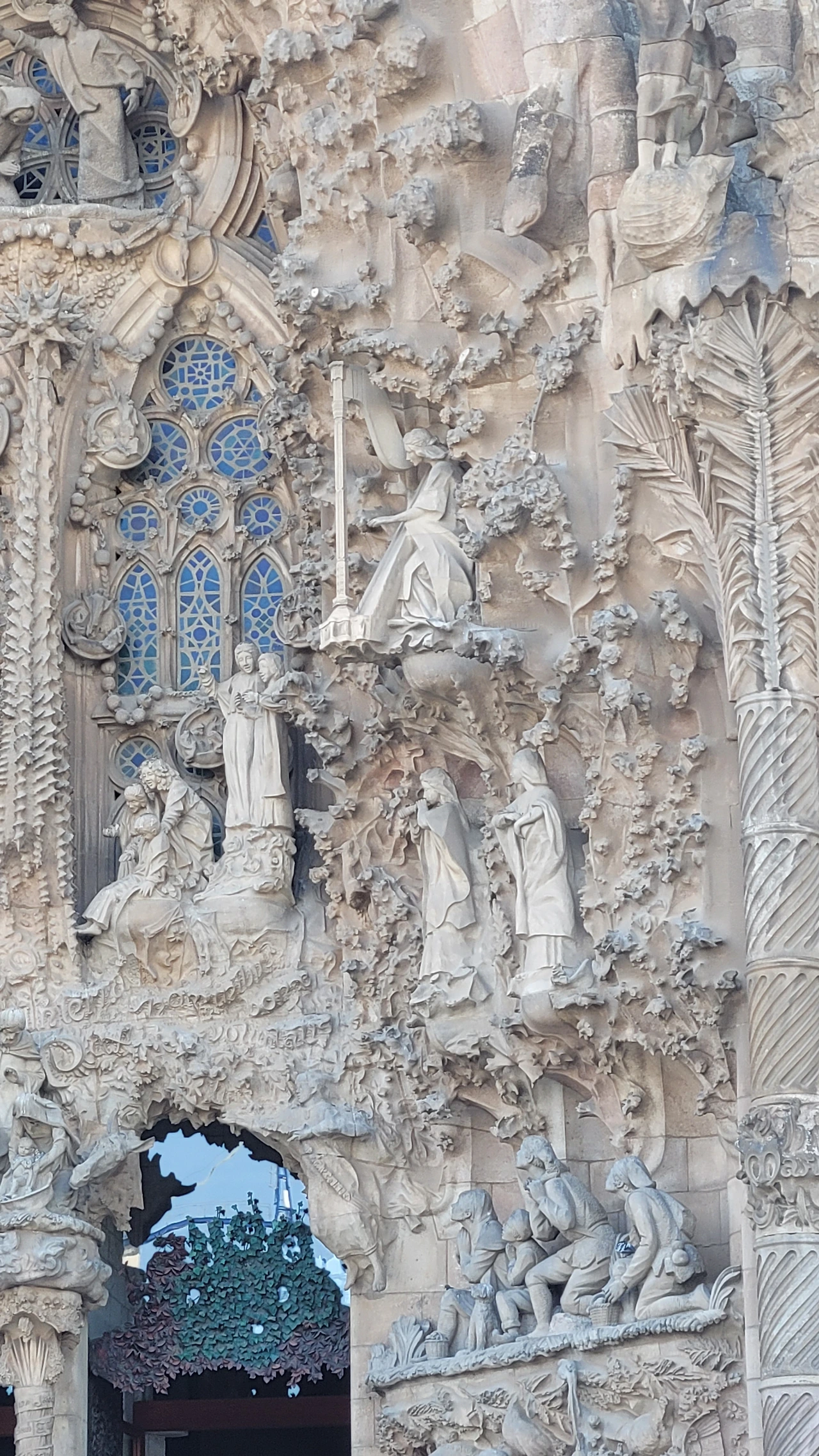 마침내 성당 가까이 다가갔다. 수많은 조각들로 뒤덮인 파사드가 눈에 들어온다. 성당의 전면을 장식하는 외벽인 파사드는 탄생의 파사드, 수난의 파사드, 영광의 파사드로 총 세 개가 있다. 그중 탄생의 파사드는 가우디가 완성한 유일한 파사드로 예수의 탄생과 유년기를 묘사한 조각들로 장식이 되어 있다. 조각 하나하나가 생생한 몸짓을 담았다. 실제로 가우디는 조각의 이미지에 맞는 실제 인물을 찾아내 모델로 활용하였으며 석고로 모형을 떠서 조각을 완성했다고 한다. 그래서인지 인물들의 표정과 몸짓이 전혀 어색하지 않고 자연스럽다. 볼거리가 많다 보니 올려다보느라 목이 아플 정도다.