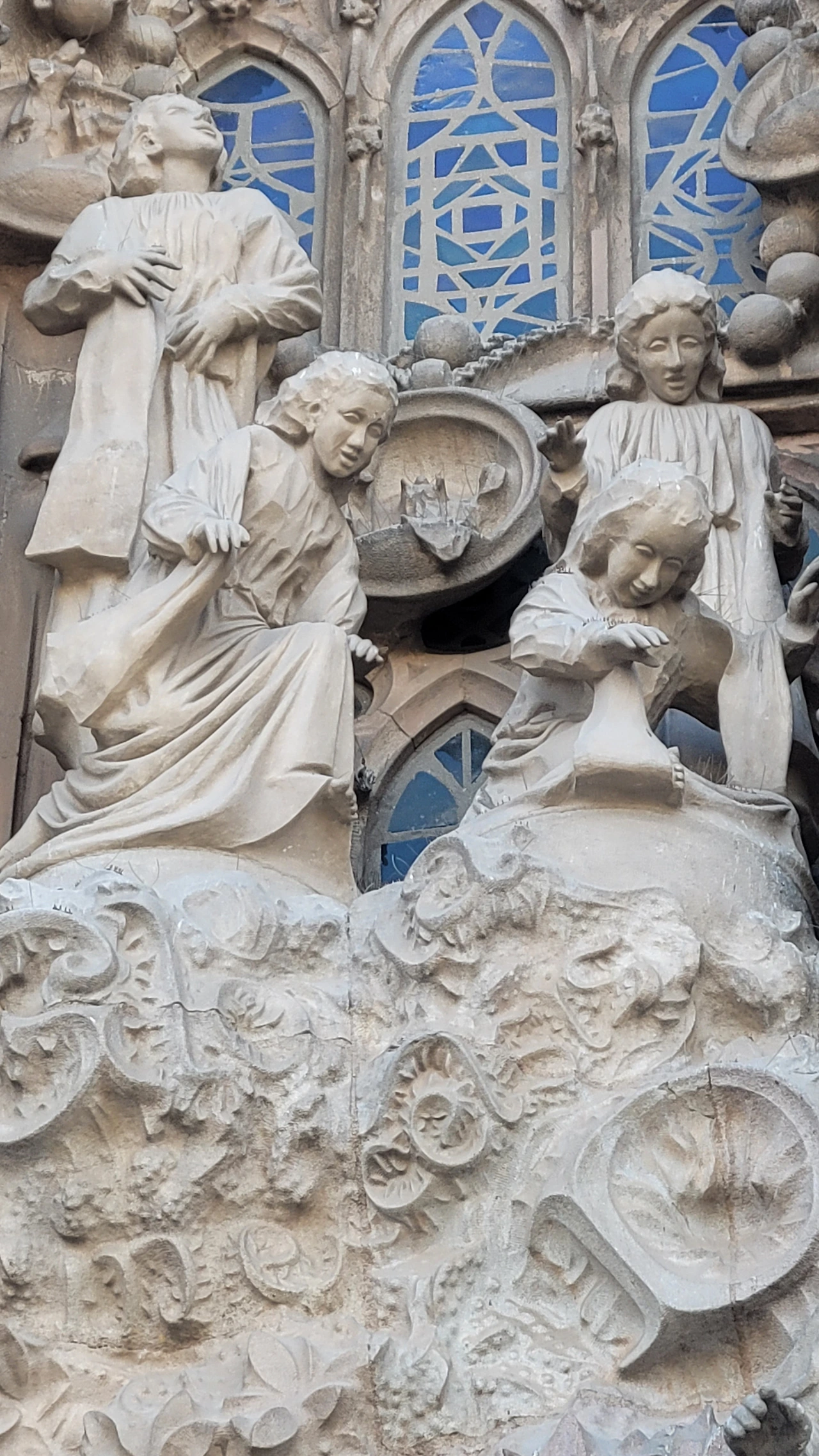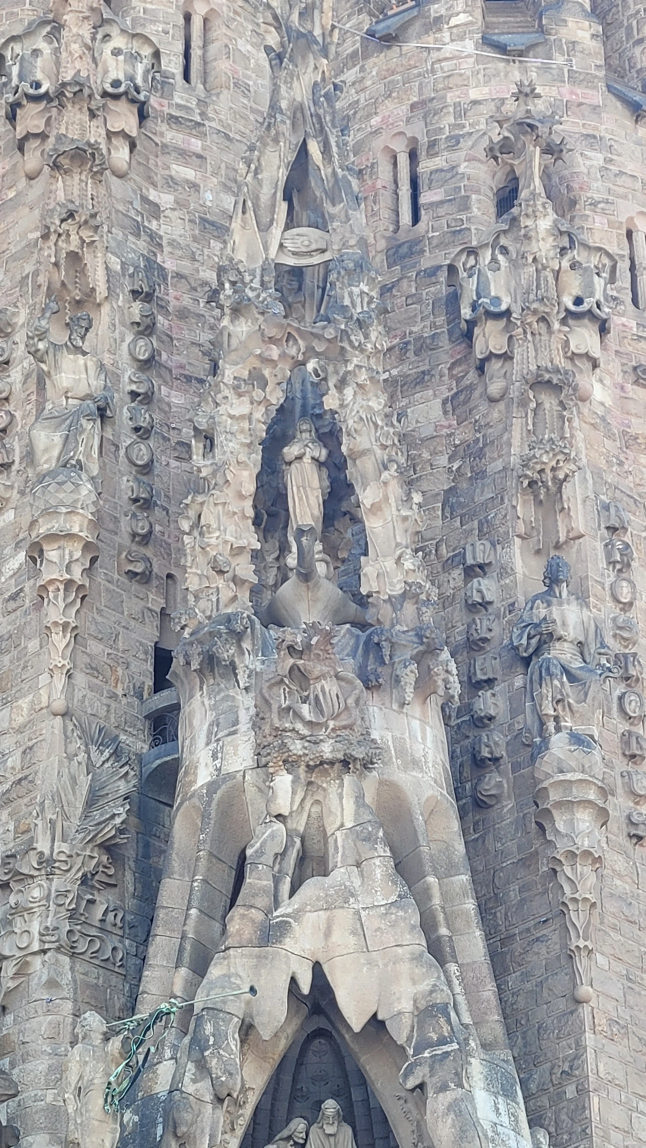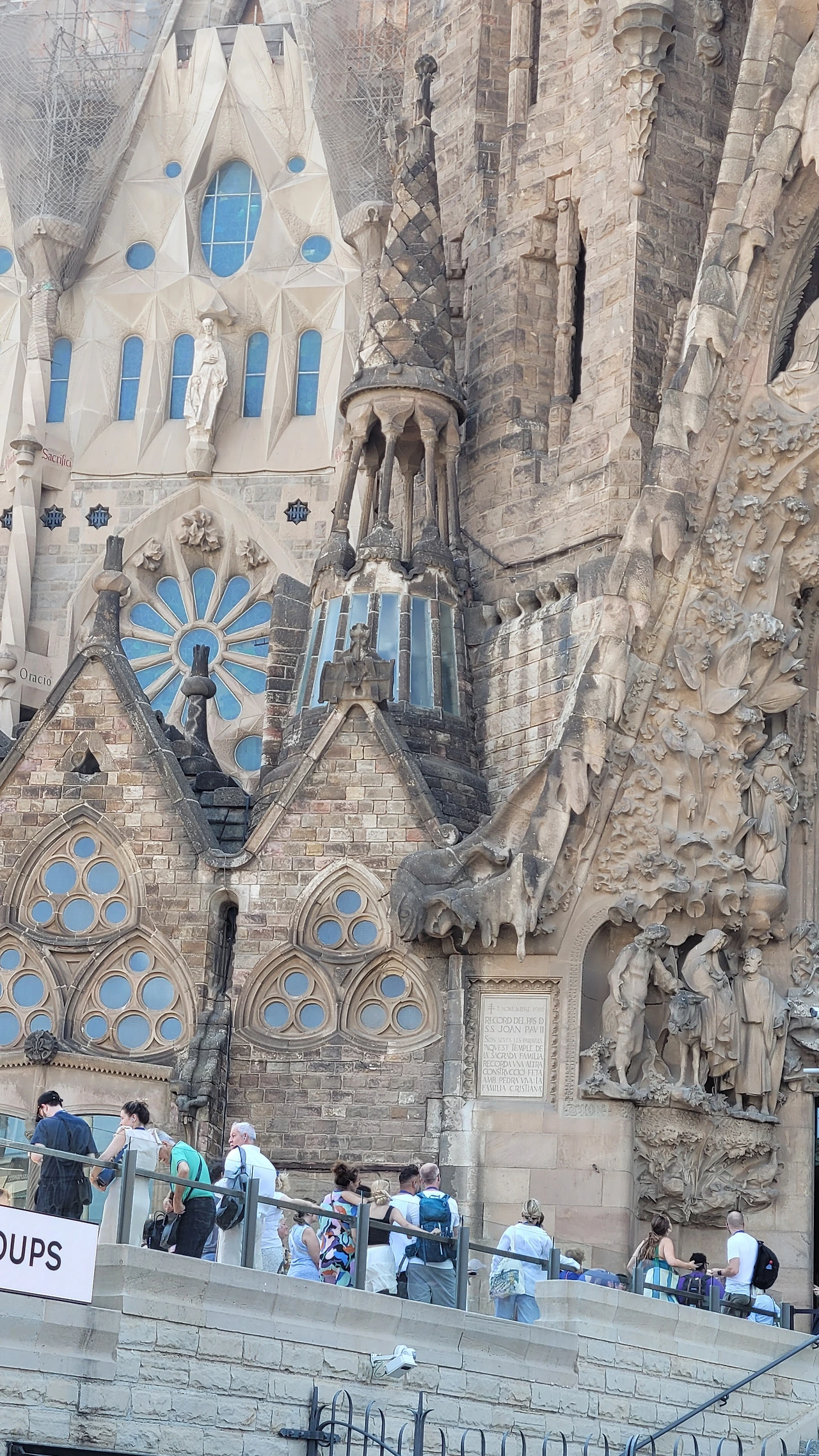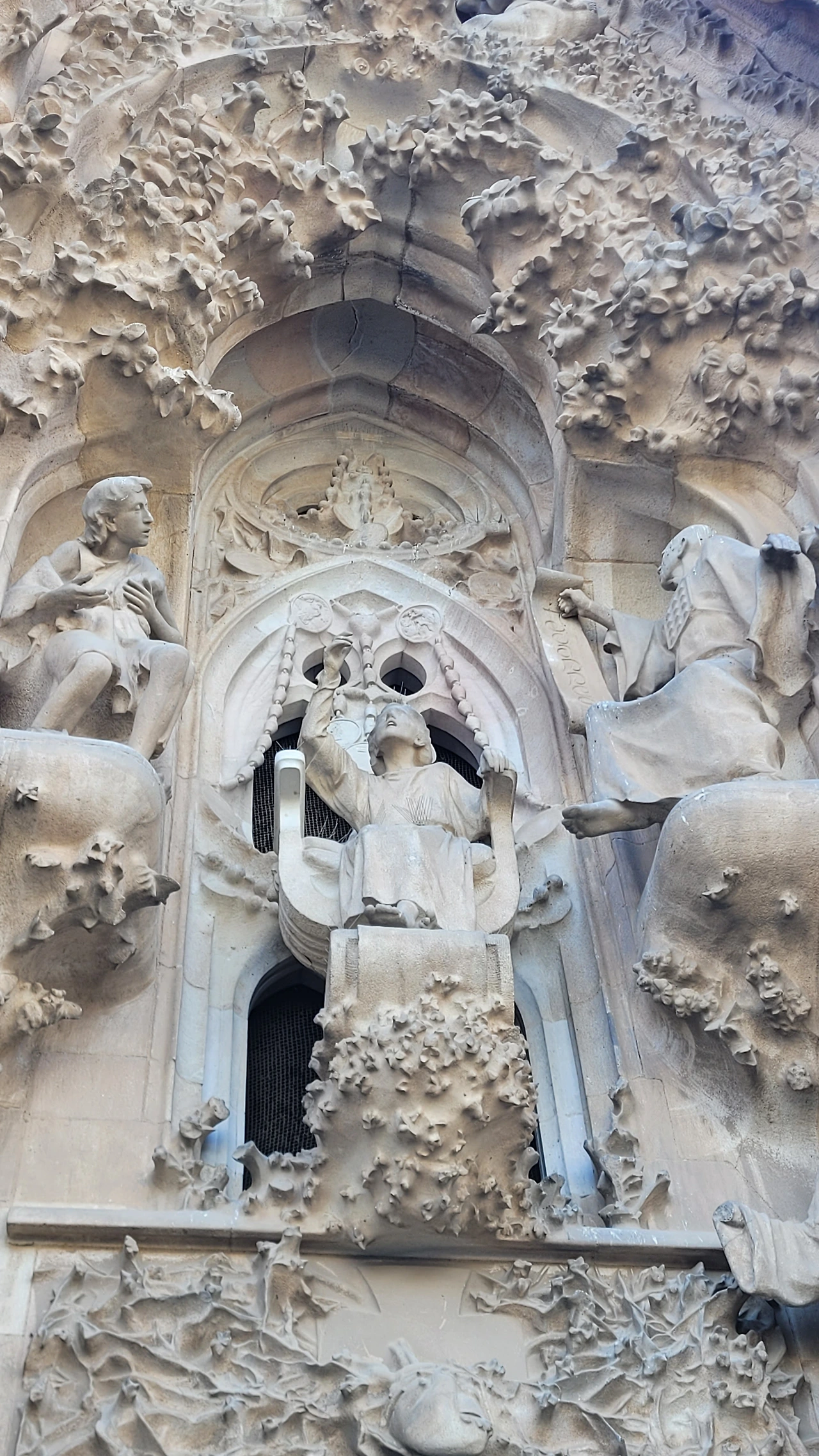 마침내 성당 가까이 다가갔다. 수많은 조각들로 뒤덮인 파사드가 눈에 들어온다. 성당의 전면을 장식하는 외벽인 파사드는 탄생의 파사드, 수난의 파사드, 영광의 파사드로 총 세 개가 있다. 그중 탄생의 파사드는 가우디가 완성한 유일한 파사드로 예수의 탄생과 유년기를 묘사한 조각들로 장식이 되어 있다. 조각 하나하나가 생생한 몸짓을 담았다. 실제로 가우디는 조각의 이미지에 맞는 실제 인물을 찾아내 모델로 활용하였으며 석고로 모형을 떠서 조각을 완성했다고 한다. 그래서인지 인물들의 표정과 몸짓이 전혀 어색하지 않고 자연스럽다. 볼거리가 많다 보니 올려다보느라 목이 아플 정도다.
