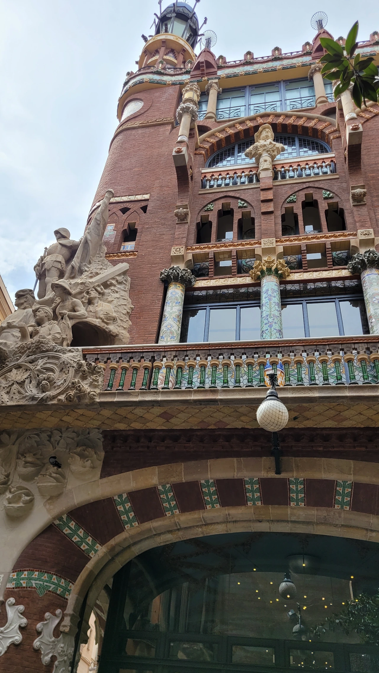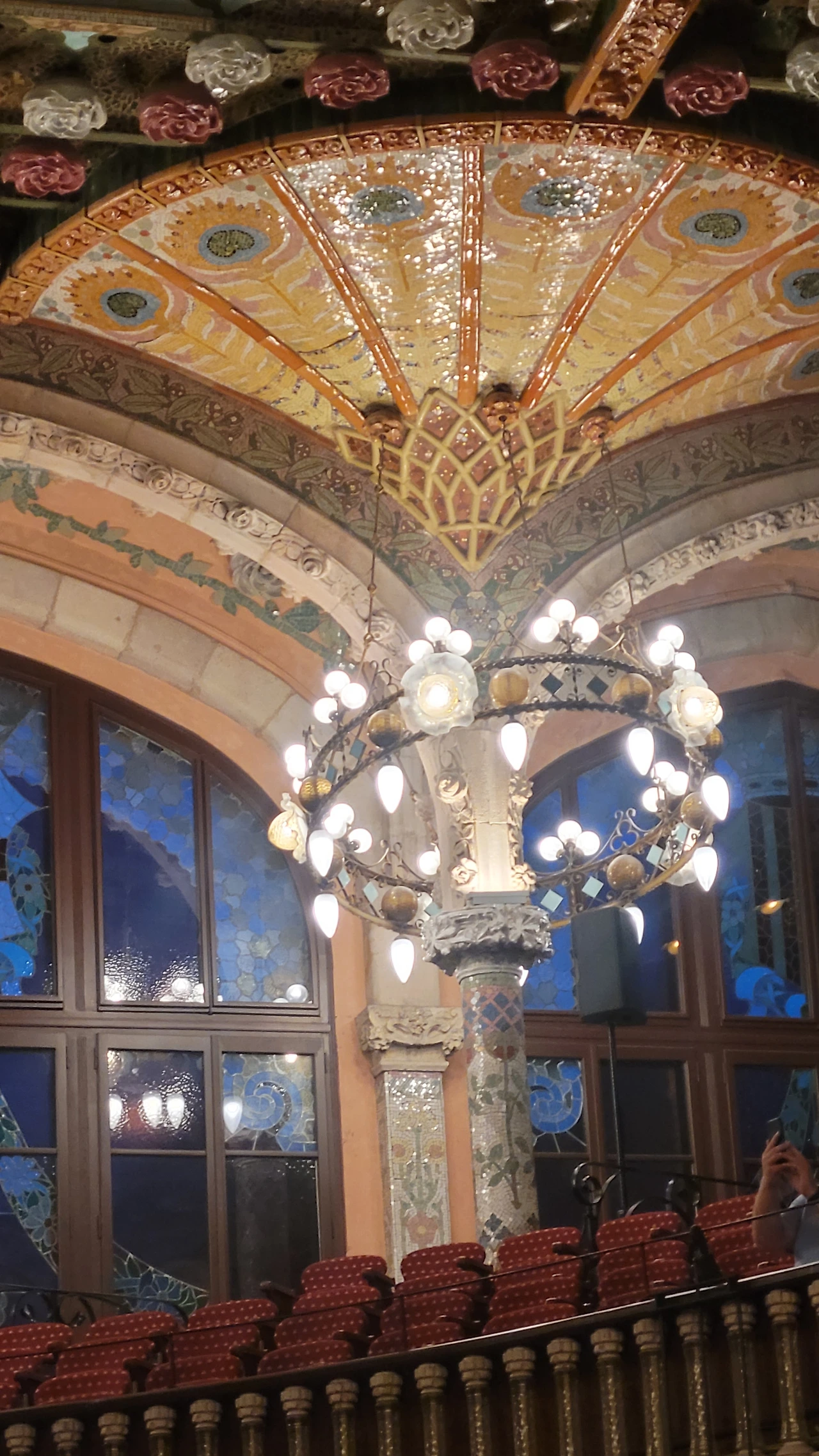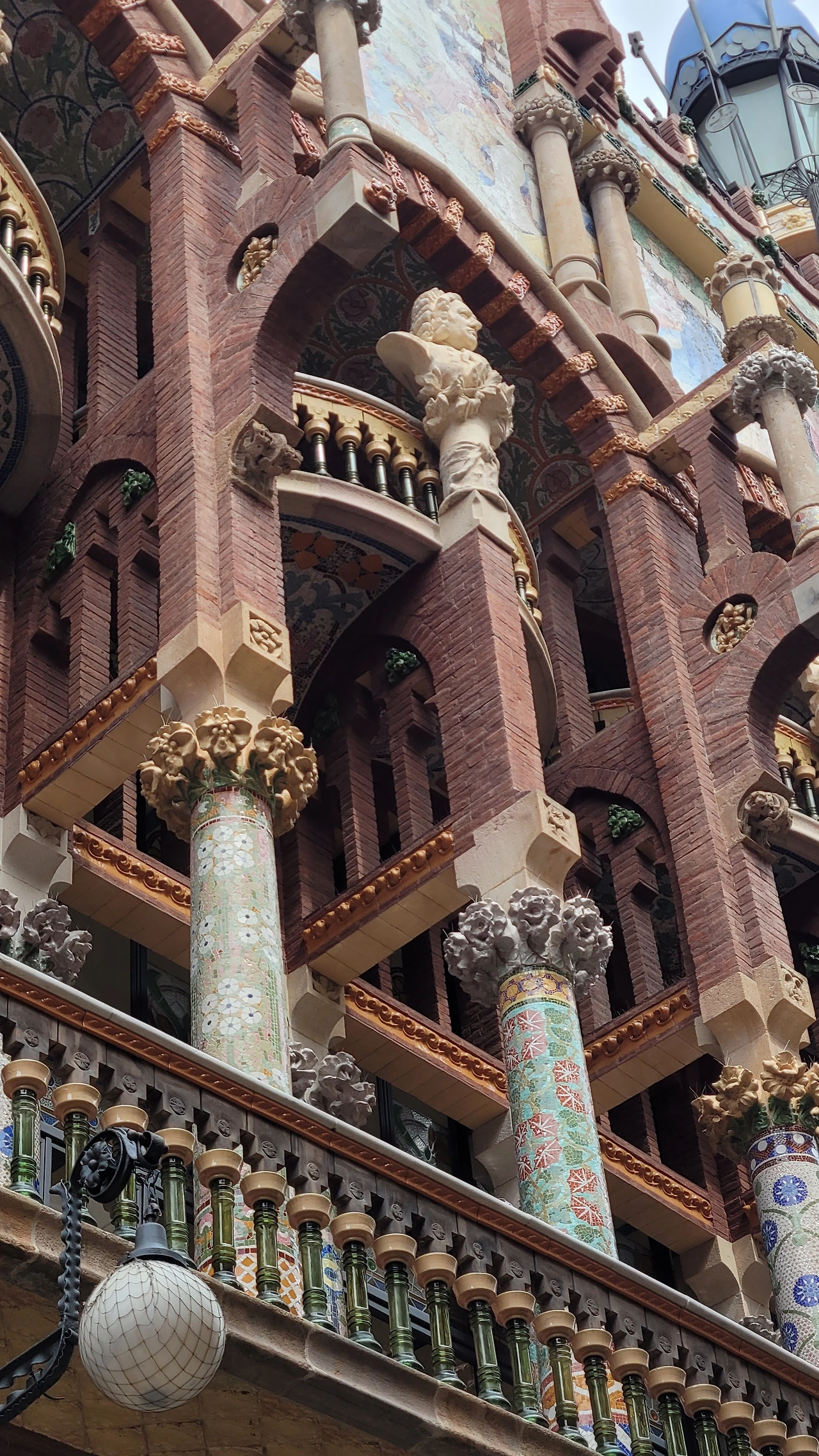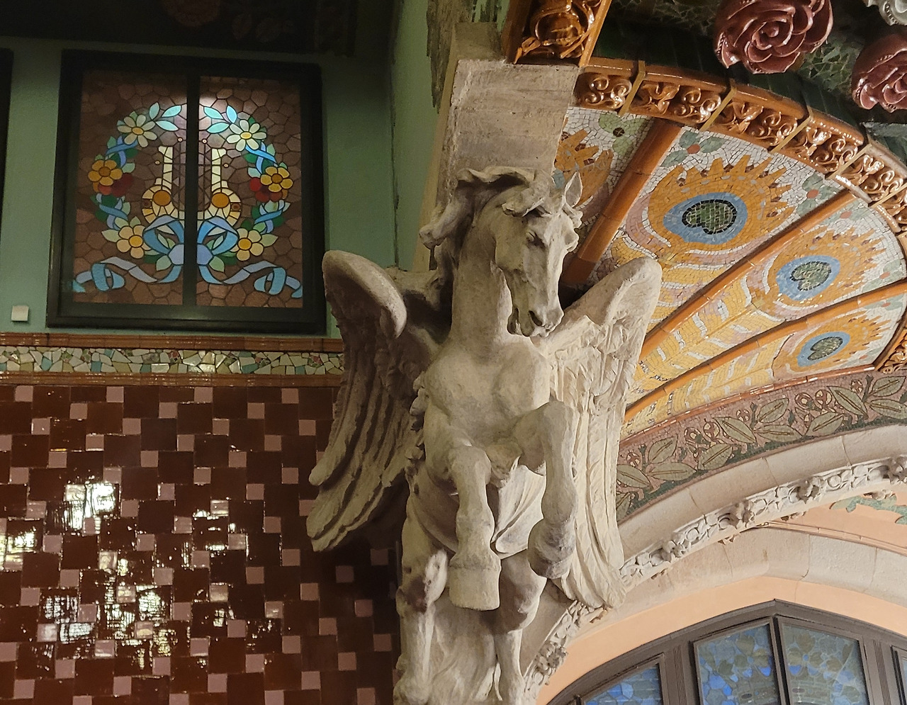 카탈라나 음악당은 건축한 그가 왜 꽃의 건축가로 불리는지 단 번에 알아볼 수 있는 화려한 외형을 자랑한다. 어린 여자 아이들이 좋아하는 장식이 많이 달린 공주님 스타일의 드레스 같은 느낌이라고 할까. 붉은 벽돌로 지어진 건물에 기둥들은 하나 같이 알록달록한 채색 문양이 그려져 있는 데 기둥마다 다르고 복잡한 장식도 한 가지가 아니라 다채롭게 되어 있다. 기둥도 단순한 기둥이 아니다. 기둥에 다른 작은 기둥을 붙여 장식의 요소를 더했다. 보이는 천정에도 풀과 꽃으로 빈 공간 하나 없이 그림으로 채워져 있다. 아치에도 단순함은 존재하지 않는다. 장식적인 요소가 가미되지 않는 공간이 하나도 보이지 않는다. 그것도 층마다 장식과 색상이 다 다르다. 모퉁이의 조각도 혀를 내두를 정도로 세심하게 조각이 되어있고 조각에서도 화려함이 느껴진다. 그야말로 신나게 원 없이 꾸며 놓은 장식의 끝판왕이다.