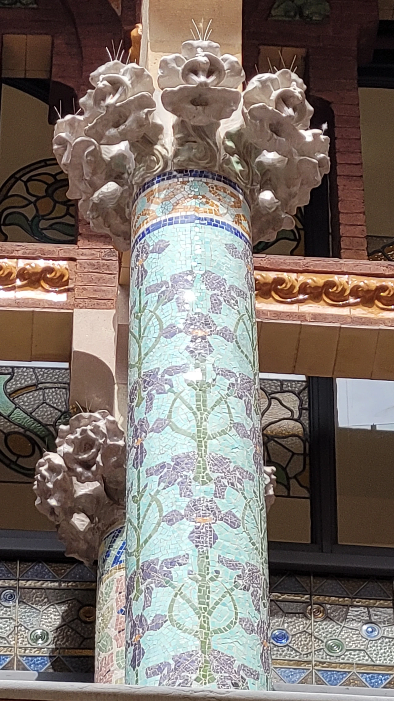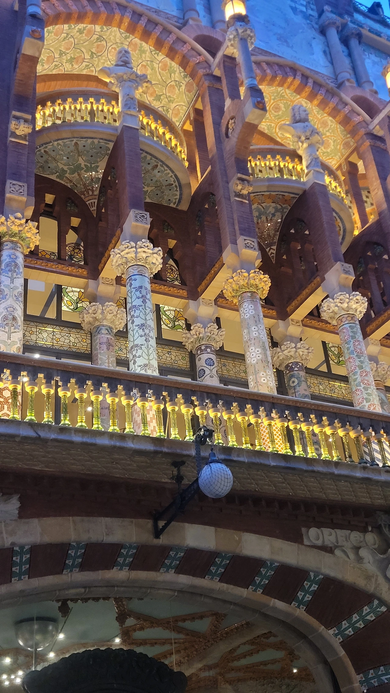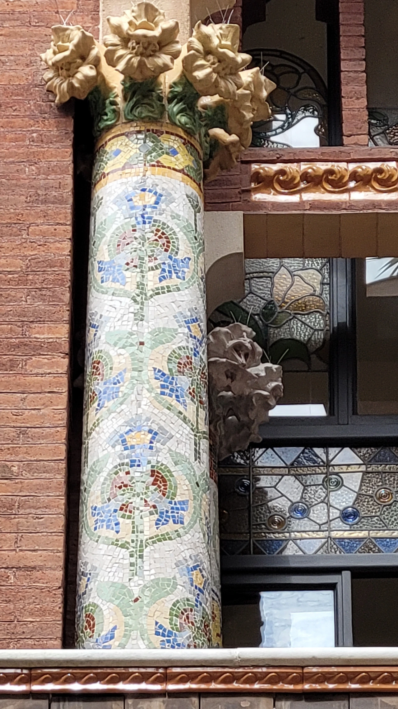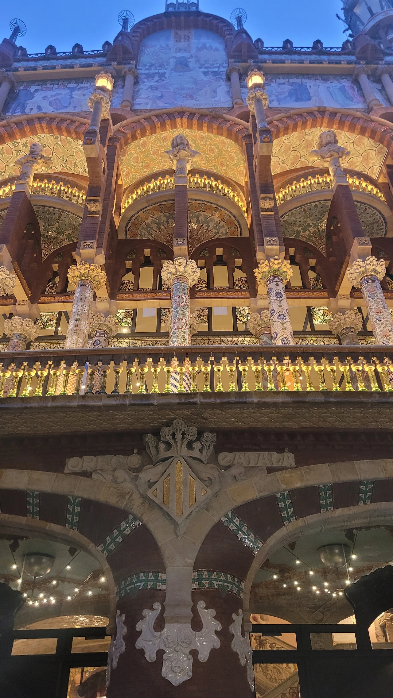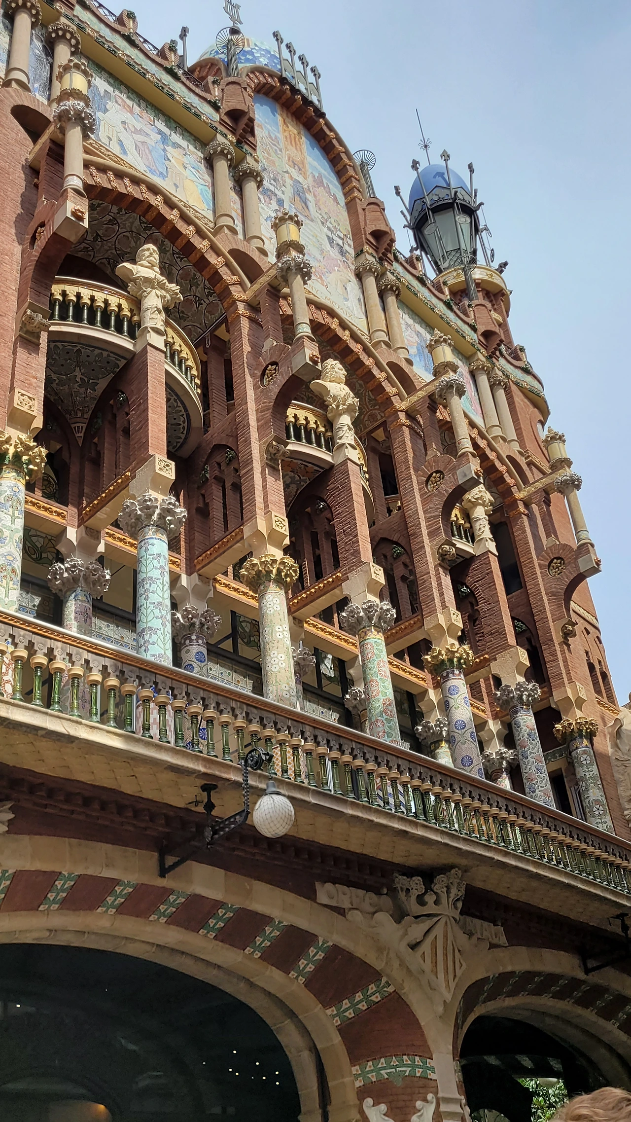 카탈라나 음악당은 건축한 그가 왜 꽃의 건축가로 불리는지 단 번에 알아볼 수 있는 화려한 외형을 자랑한다. 어린 여자 아이들이 좋아하는 장식이 많이 달린 공주님 스타일의 드레스 같은 느낌이라고 할까. 붉은 벽돌로 지어진 건물에 기둥들은 하나 같이 알록달록한 채색 문양이 그려져 있는 데 기둥마다 다르고 복잡한 장식도 한 가지가 아니라 다채롭게 되어 있다. 기둥도 단순한 기둥이 아니다. 기둥에 다른 작은 기둥을 붙여 장식의 요소를 더했다. 보이는 천정에도 풀과 꽃으로 빈 공간 하나 없이 그림으로 채워져 있다. 아치에도 단순함은 존재하지 않는다. 장식적인 요소가 가미되지 않는 공간이 하나도 보이지 않는다. 그것도 층마다 장식과 색상이 다 다르다. 모퉁이의 조각도 혀를 내두를 정도로 세심하게 조각이 되어있고 조각에서도 화려함이 느껴진다. 그야말로 신나게 원 없이 꾸며 놓은 장식의 끝판왕이다.