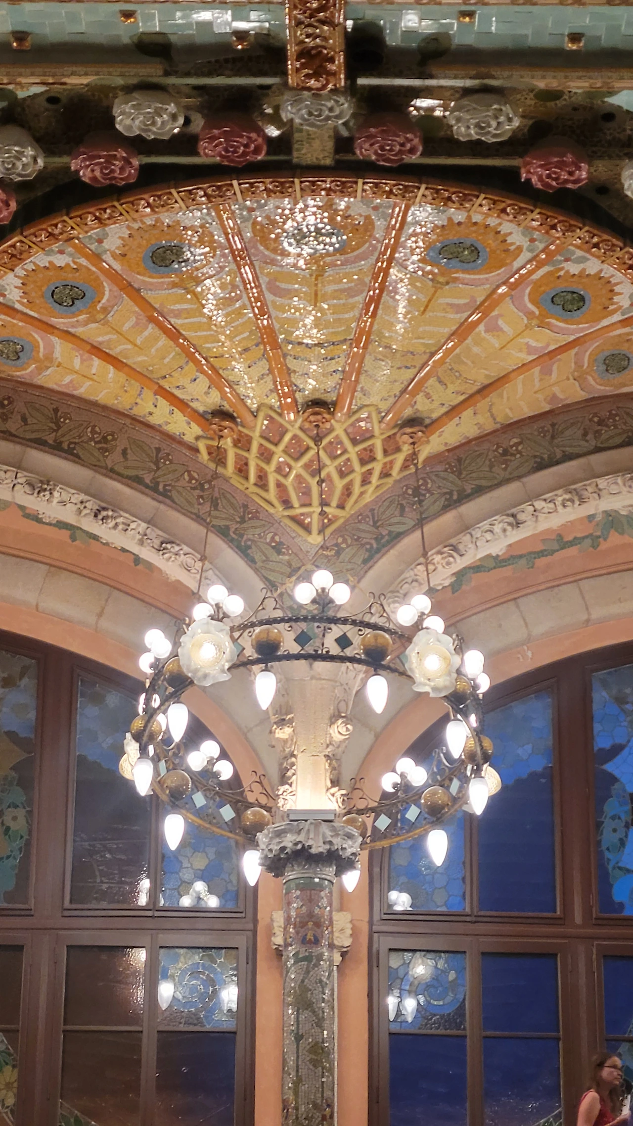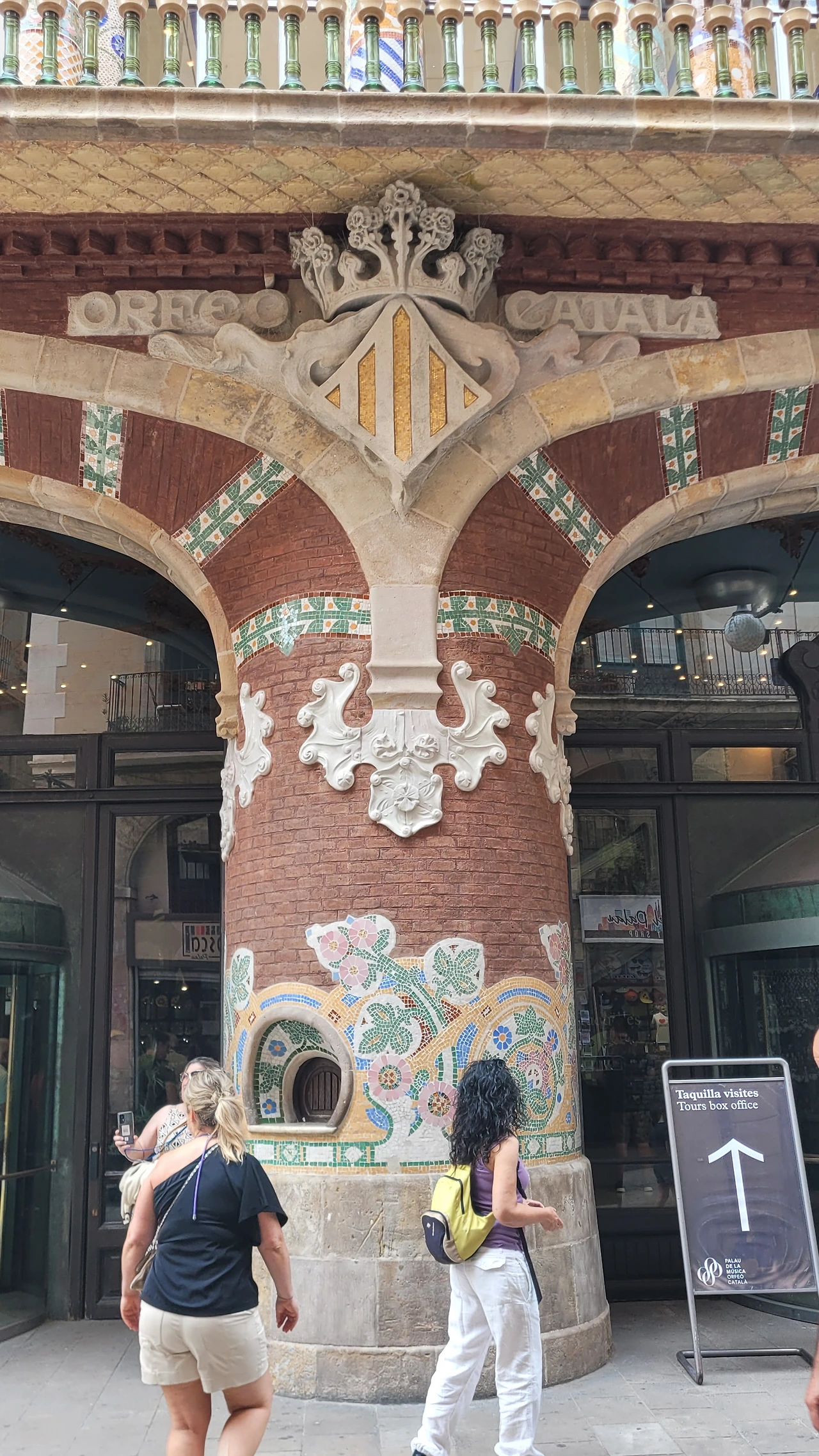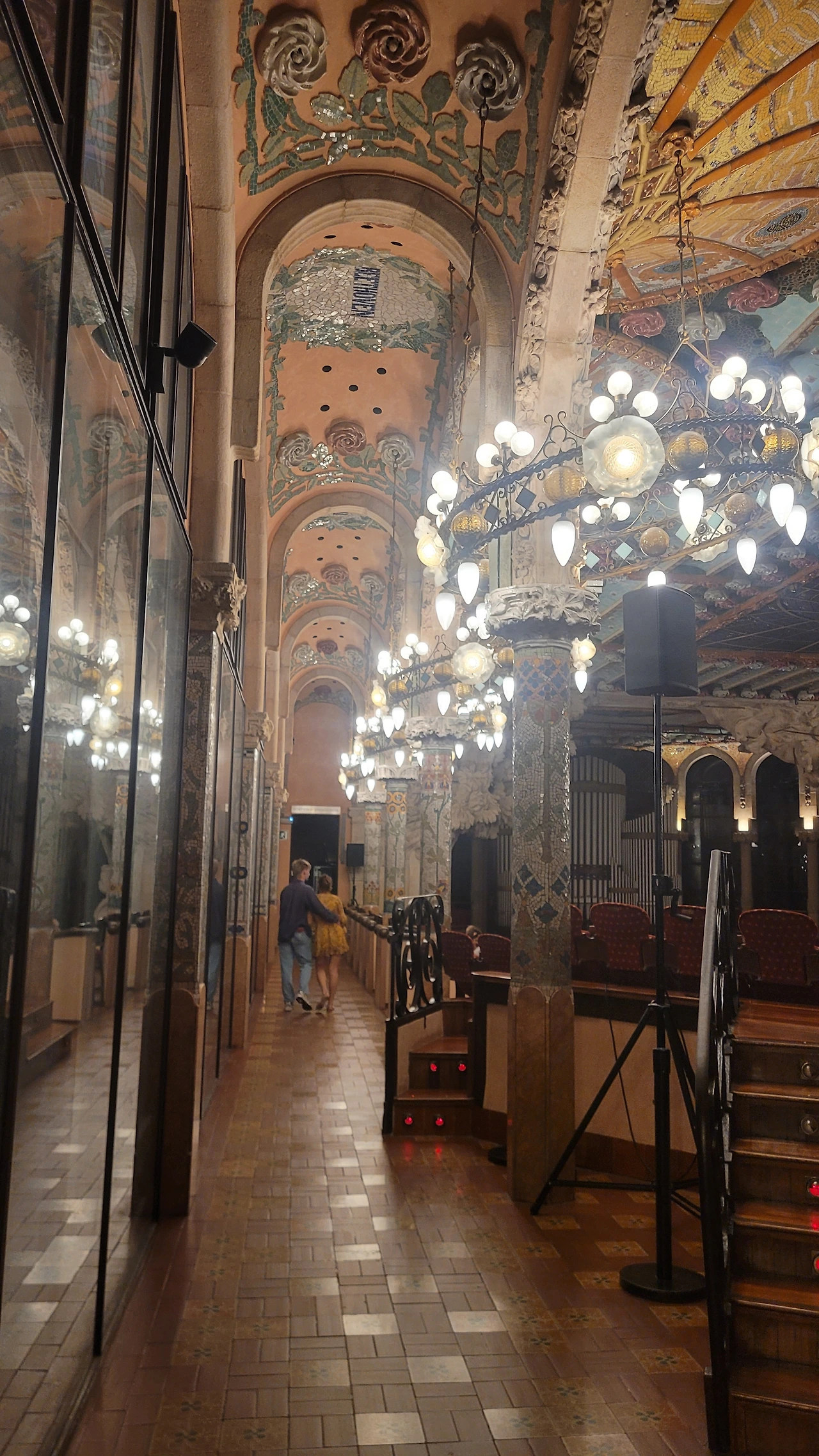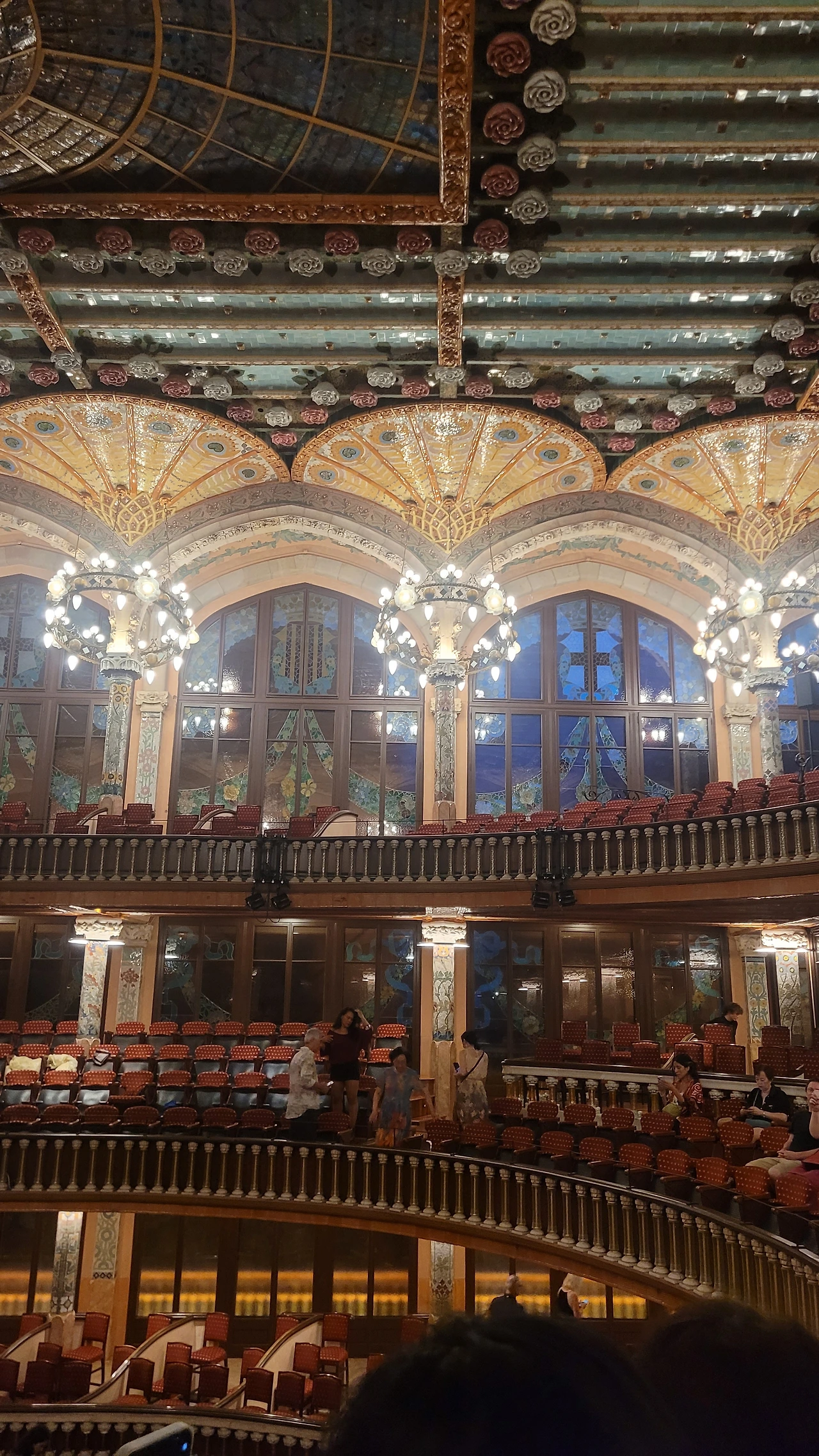 카탈라나 음악당은 건축한 그가 왜 꽃의 건축가로 불리는지 단 번에 알아볼 수 있는 화려한 외형을 자랑한다. 어린 여자 아이들이 좋아하는 장식이 많이 달린 공주님 스타일의 드레스 같은 느낌이라고 할까. 붉은 벽돌로 지어진 건물에 기둥들은 하나 같이 알록달록한 채색 문양이 그려져 있는 데 기둥마다 다르고 복잡한 장식도 한 가지가 아니라 다채롭게 되어 있다. 기둥도 단순한 기둥이 아니다. 기둥에 다른 작은 기둥을 붙여 장식의 요소를 더했다. 보이는 천정에도 풀과 꽃으로 빈 공간 하나 없이 그림으로 채워져 있다. 아치에도 단순함은 존재하지 않는다. 장식적인 요소가 가미되지 않는 공간이 하나도 보이지 않는다. 그것도 층마다 장식과 색상이 다 다르다. 모퉁이의 조각도 혀를 내두를 정도로 세심하게 조각이 되어있고 조각에서도 화려함이 느껴진다. 그야말로 신나게 원 없이 꾸며 놓은 장식의 끝판왕이다.