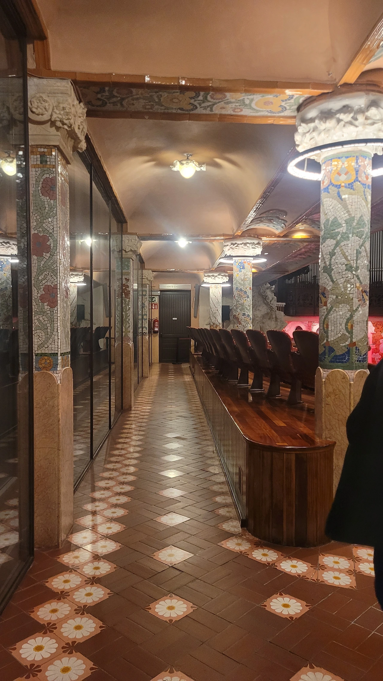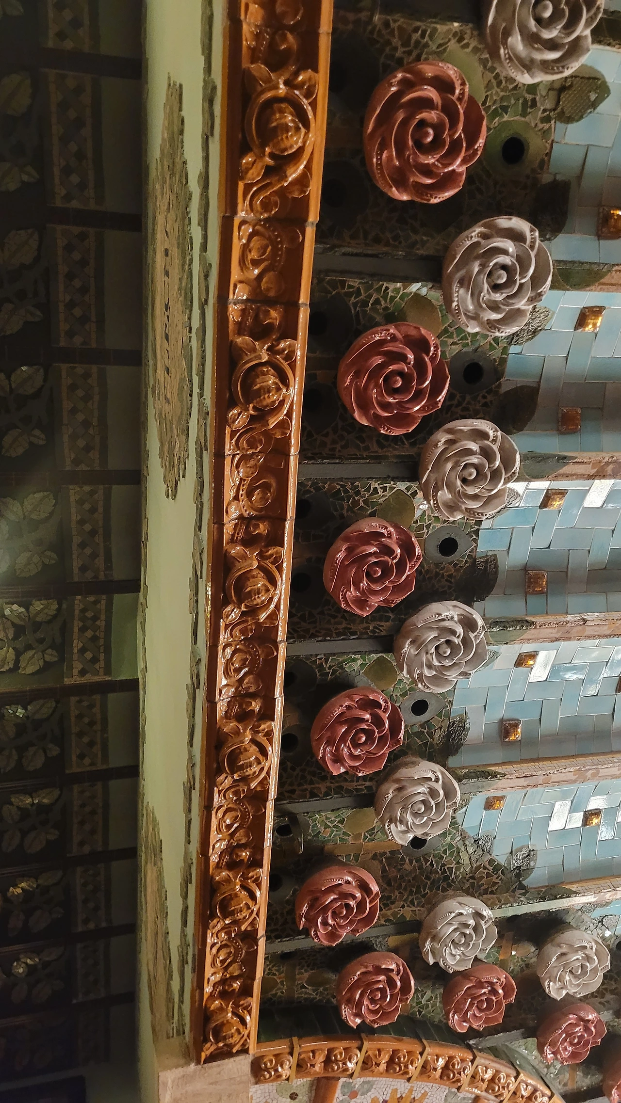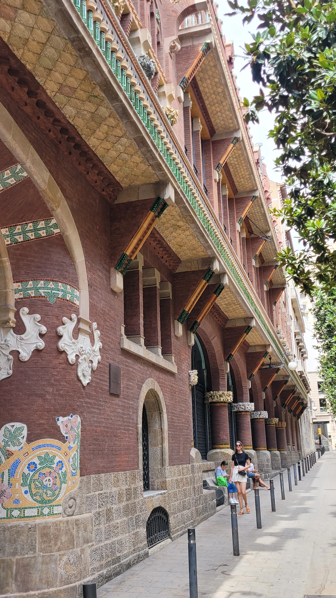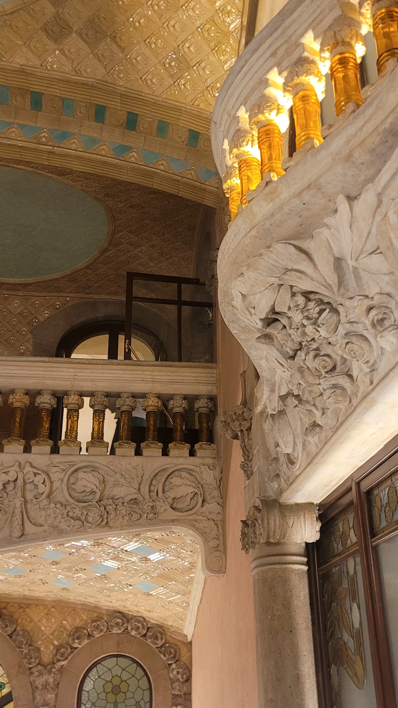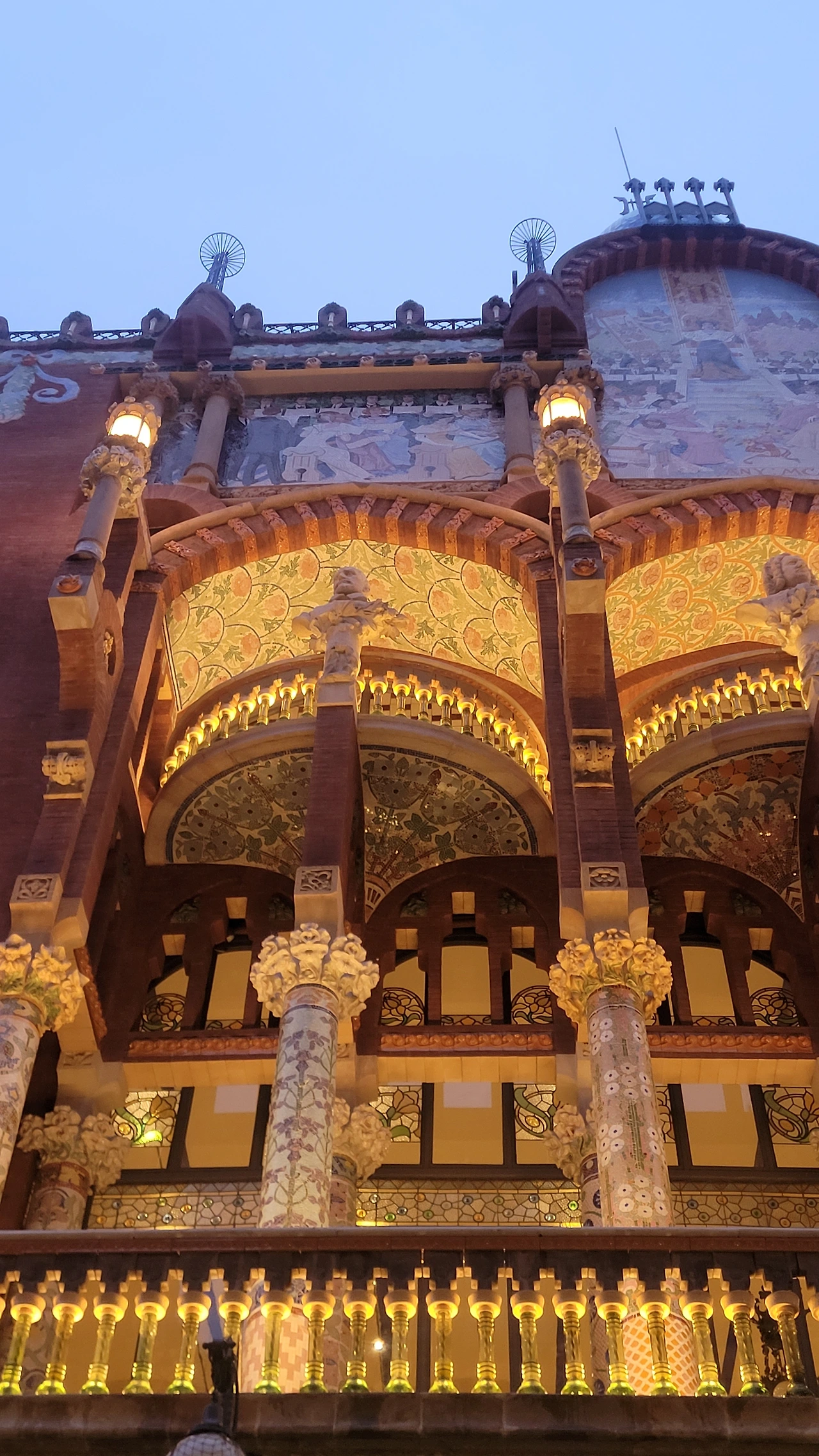카탈라나 음악당은 건축한 그가 왜 꽃의 건축가로 불리는지 단 번에 알아볼 수 있는 화려한 외형을 자랑한다. 어린 여자 아이들이 좋아하는 장식이 많이 달린 공주님 스타일의 드레스 같은 느낌이라고 할까. 붉은 벽돌로 지어진 건물에 기둥들은 하나 같이 알록달록한 채색 문양이 그려져 있는 데 기둥마다 다르고 복잡한 장식도 한 가지가 아니라 다채롭게 되어 있다. 기둥도 단순한 기둥이 아니다. 기둥에 다른 작은 기둥을 붙여 장식의 요소를 더했다. 보이는 천정에도 풀과 꽃으로 빈 공간 하나 없이 그림으로 채워져 있다. 아치에도 단순함은 존재하지 않는다. 장식적인 요소가 가미되지 않는 공간이 하나도 보이지 않는다. 그것도 층마다 장식과 색상이 다 다르다. 모퉁이의 조각도 혀를 내두를 정도로 세심하게 조각이 되어있고 조각에서도 화려함이 느껴진다. 그야말로 신나게 원 없이 꾸며 놓은 장식의 끝판왕이다.