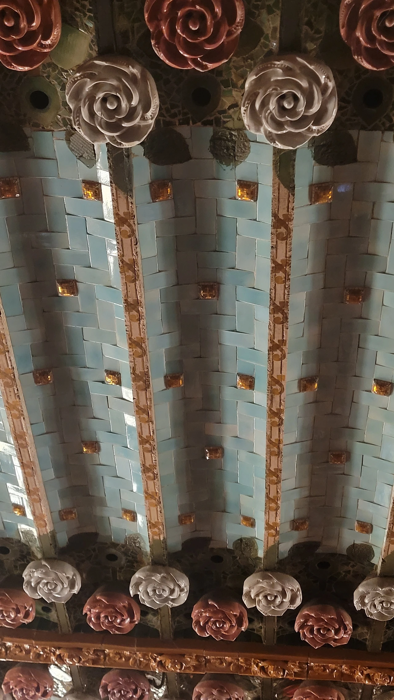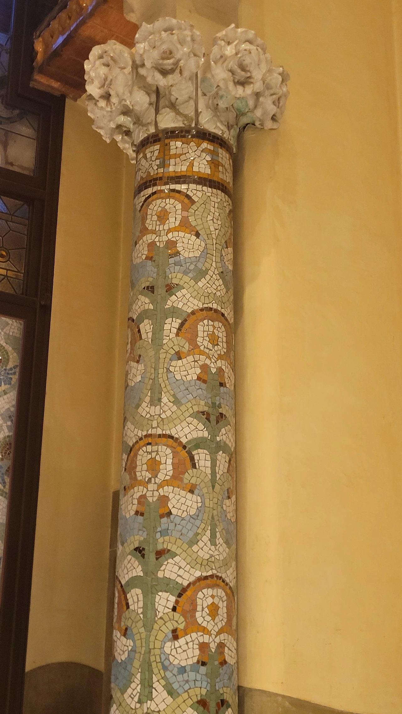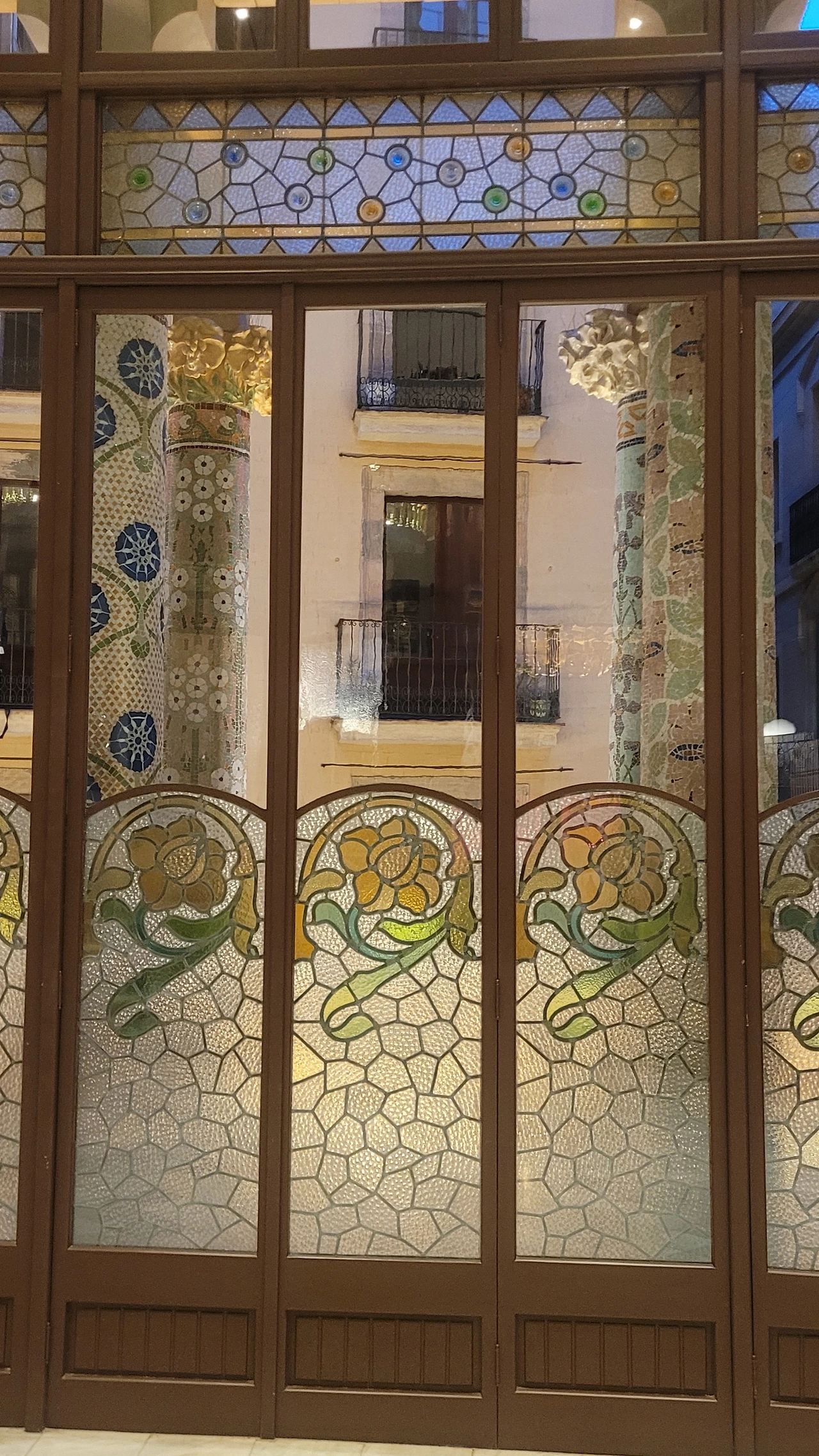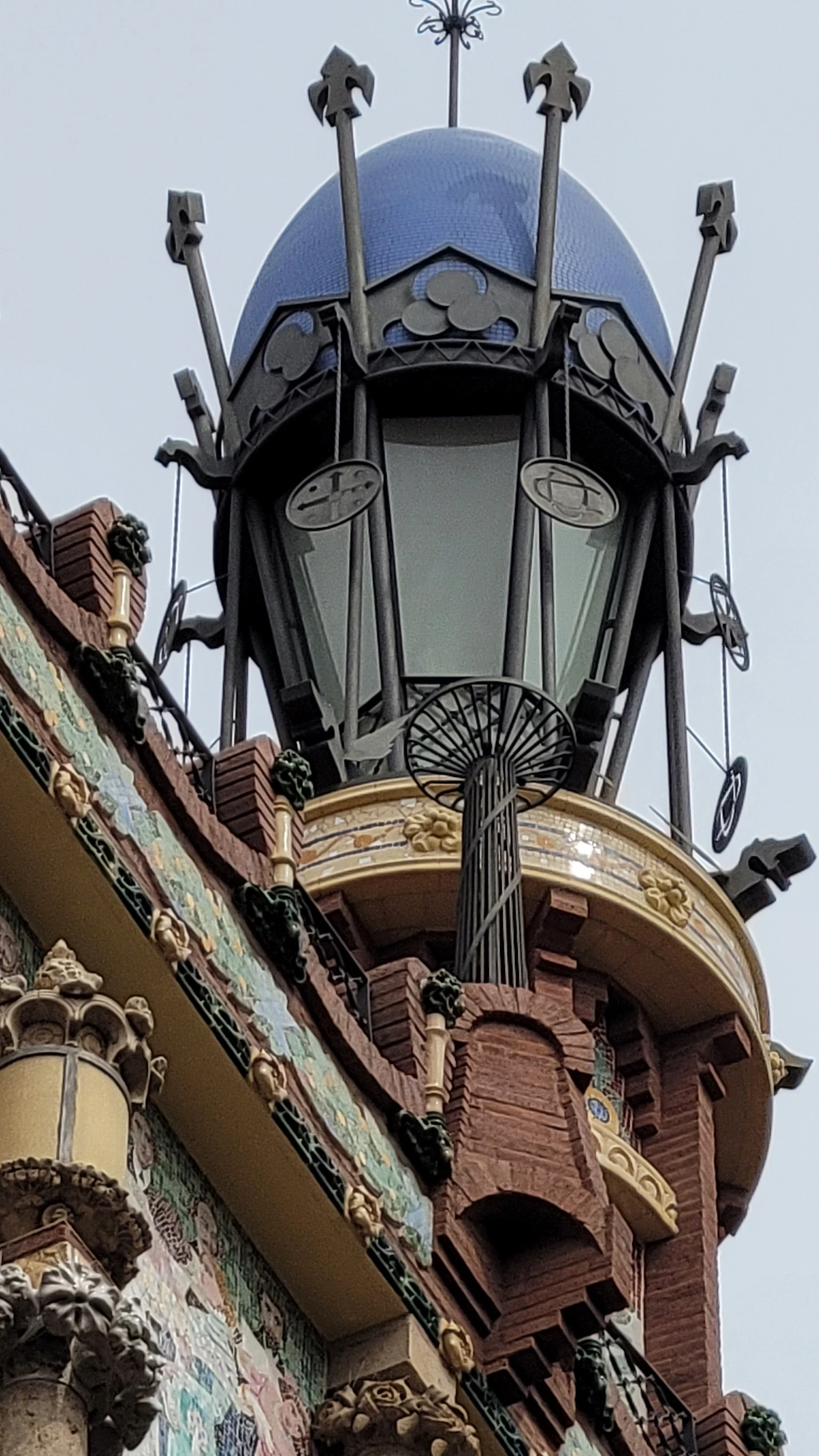 카탈라나 음악당은 건축한 그가 왜 꽃의 건축가로 불리는지 단 번에 알아볼 수 있는 화려한 외형을 자랑한다. 어린 여자 아이들이 좋아하는 장식이 많이 달린 공주님 스타일의 드레스 같은 느낌이라고 할까. 붉은 벽돌로 지어진 건물에 기둥들은 하나 같이 알록달록한 채색 문양이 그려져 있는 데 기둥마다 다르고 복잡한 장식도 한 가지가 아니라 다채롭게 되어 있다. 기둥도 단순한 기둥이 아니다. 기둥에 다른 작은 기둥을 붙여 장식의 요소를 더했다. 보이는 천정에도 풀과 꽃으로 빈 공간 하나 없이 그림으로 채워져 있다. 아치에도 단순함은 존재하지 않는다. 장식적인 요소가 가미되지 않는 공간이 하나도 보이지 않는다. 그것도 층마다 장식과 색상이 다 다르다. 모퉁이의 조각도 혀를 내두를 정도로 세심하게 조각이 되어있고 조각에서도 화려함이 느껴진다. 그야말로 신나게 원 없이 꾸며 놓은 장식의 끝판왕이다.