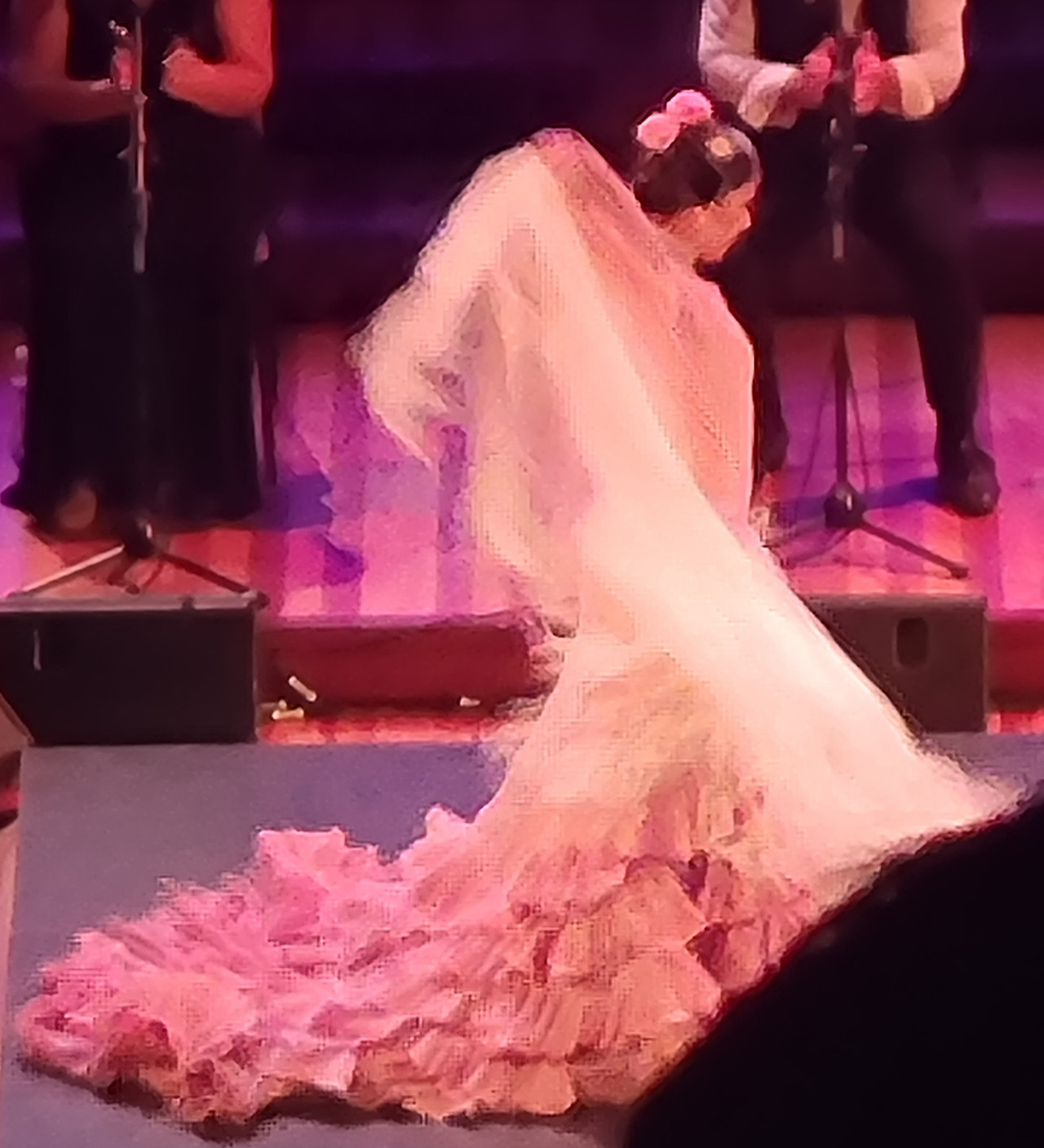 이어진 독무에서는 복장이 길게 늘어진 흰 드레스였는데 자신의 몸 보다 두 배는 길어 보이는 주름 잡힌 레이스가 달린 옷으로 걷기에도 불편해 보였다. 그런 상황에도 춤은 물 흐르듯 자연스러웠다. 한 번도 옷을 밟지 않고 놀라운 순발력과 뒷발 치기 기술로 늘어진 옷자락이 공작꼬리처럼 활짝 펼쳐지는 진기한 상황을 연출하며 눈길을 사로잡는 멋진 공연이 이어졌다.