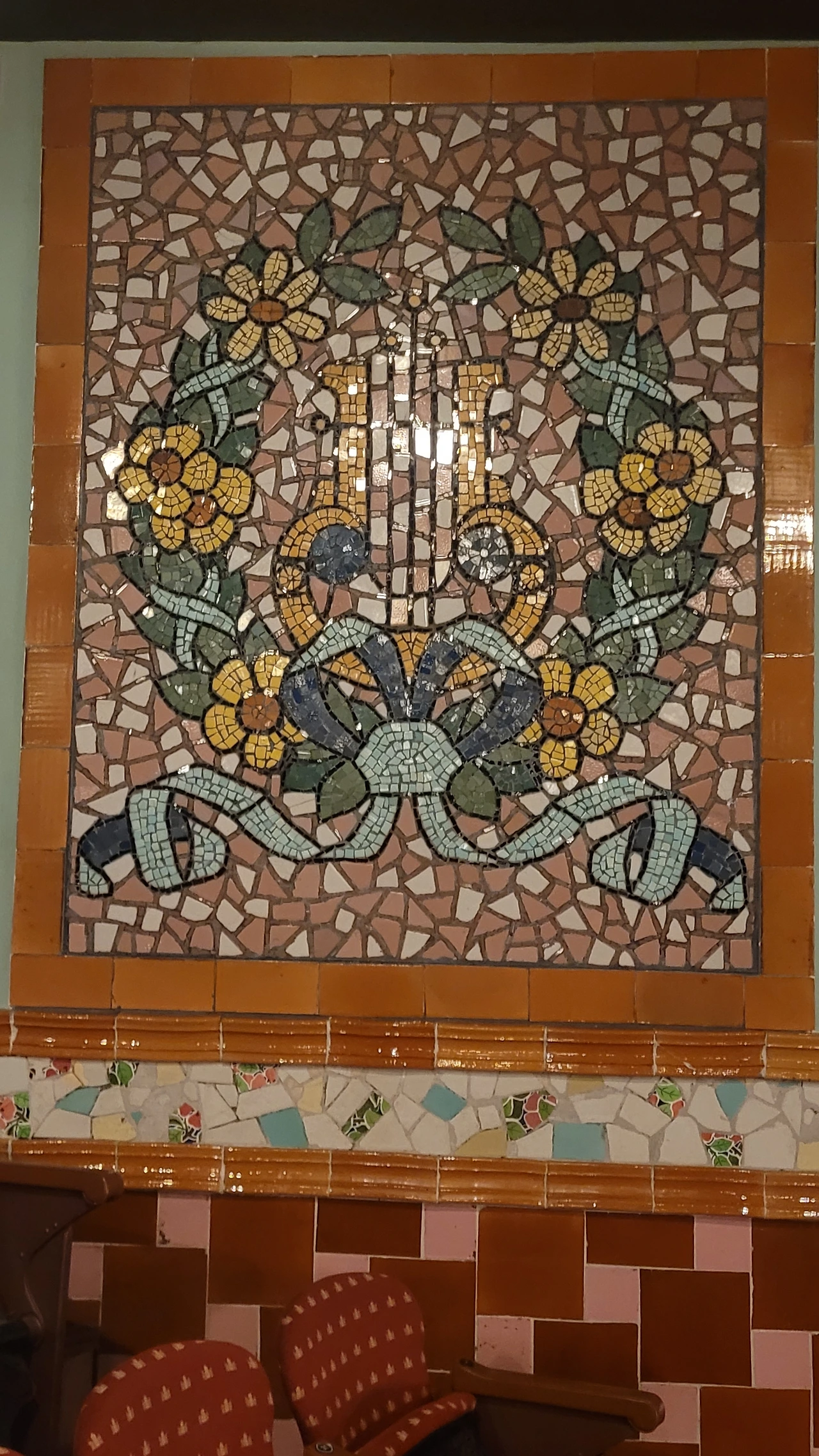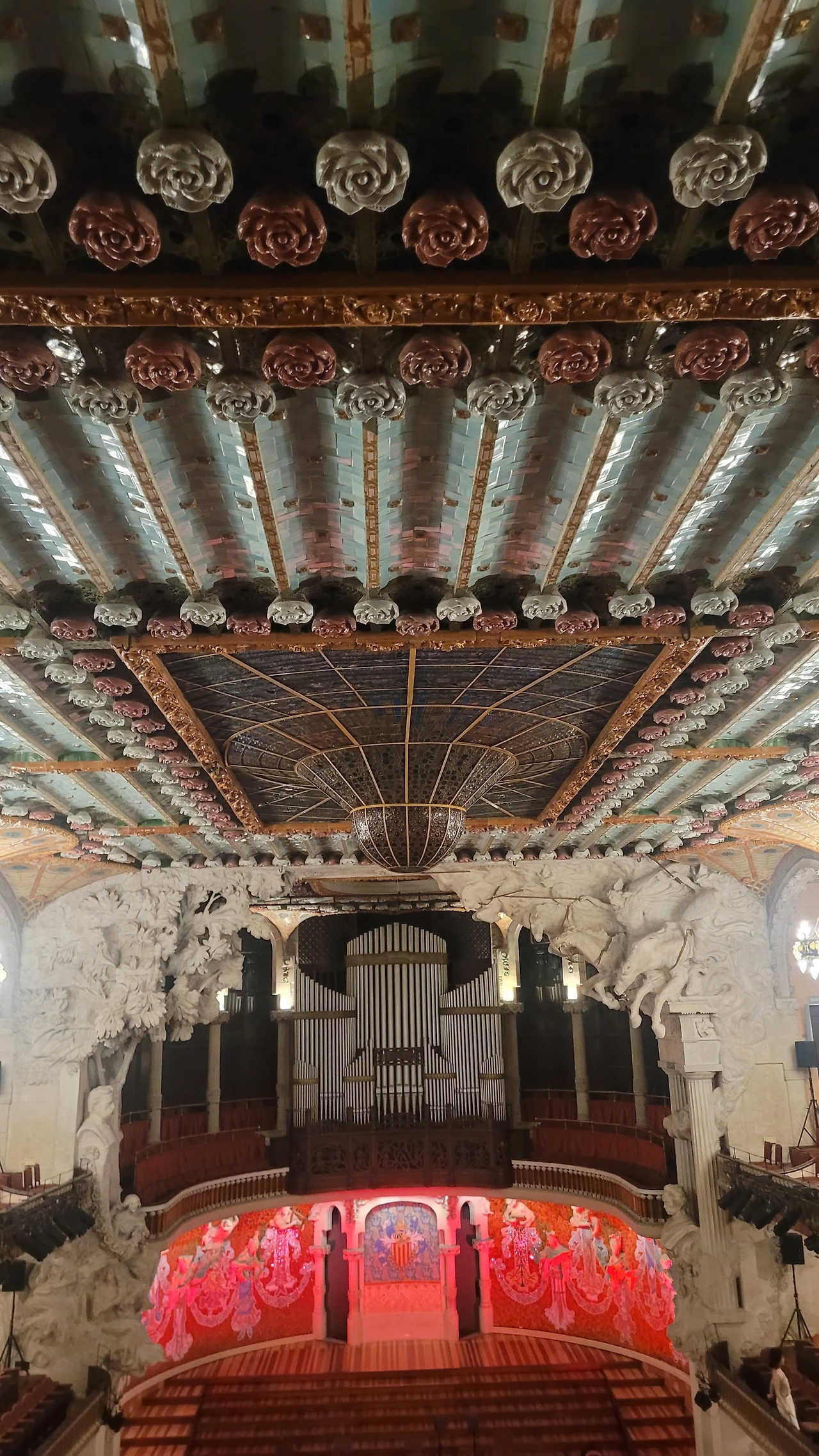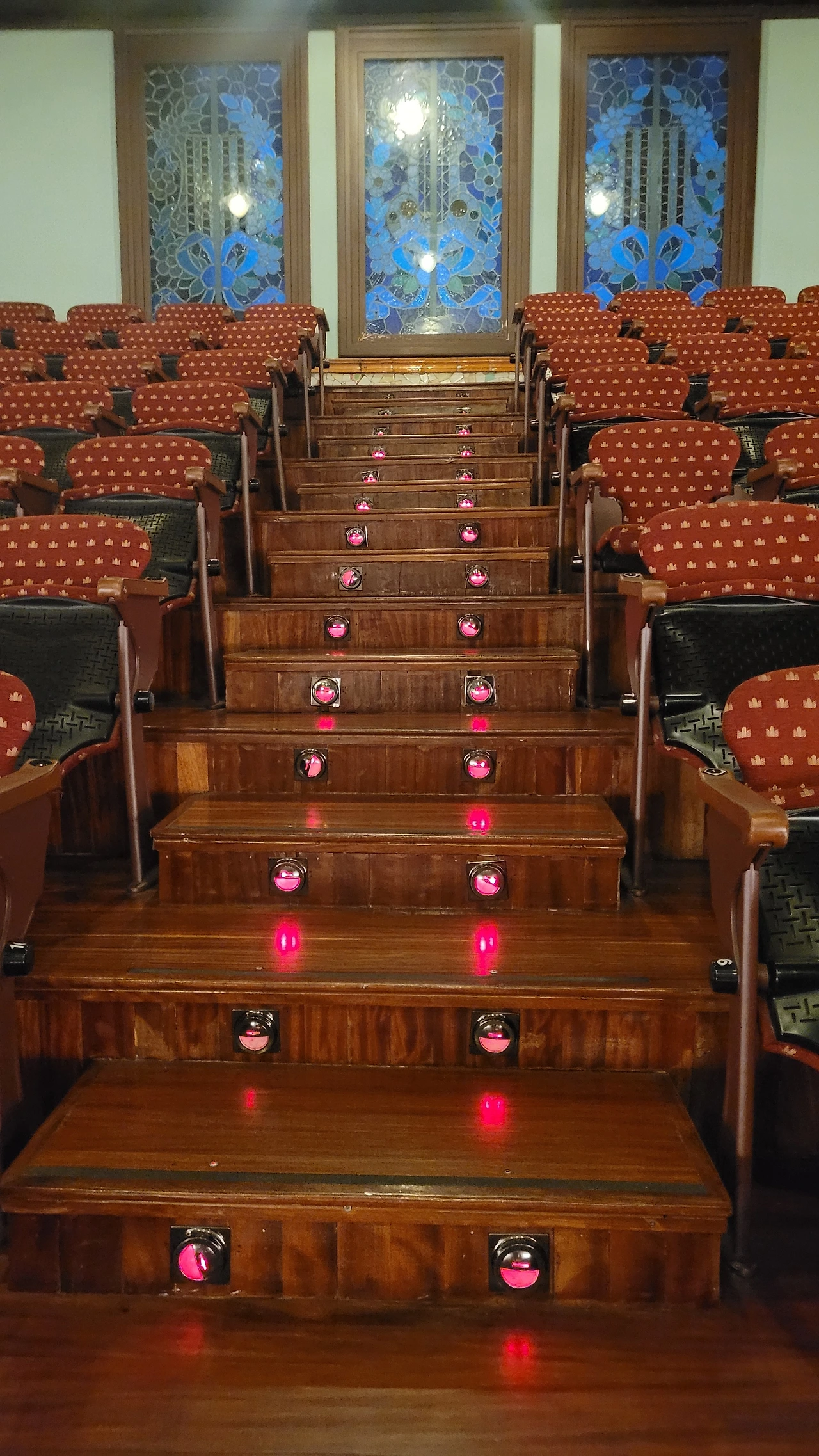 내부도 만만치 않다. 복고풍의 동양미가 가미된 입구에는 천장에도 줄줄이 장미가 새겨져 있다. 계단도 간단치 않다. 장식적인 요소들이 넘쳐난다. 꽃길을 걸어가는 느낌이 들 정도다. 음악당 내부는 더 강렬하다. 음악당 전체가 활짝 피어난 한 송이 꽃을 연상시킨다. 문양이 아로새겨진 붉은색의 좌석이 포진되어 있는 정면의 무대는 선홍빛 붉은빛이고 가장자리에는 아치가 줄지어 서 있고 음악당 실내를 밝히는 샹들리에는 꽃이 핀 듯 반짝인다. 실내 천장도 꽃밭이다. 꽃분홍과 붉은 장미꽃들이 빼곡하게 붙어 있고 사이사이로 푸른 타일과 금색 장식이 줄지어 눈을 현란하게 한다. 좌석사이의 계단에도 붉은 등이 줄지어 있고 벽면마다 복잡하고 다양한 문양의 스테인드 글라스가 자리를 잡았다. 층간에는 천마 조각도 날개를 펼치고 하늘을 향해 날고 있다. 더 이상은 장식을 할 수 없을 만큼 엄청난 분위기가 사람들을 압도한다.