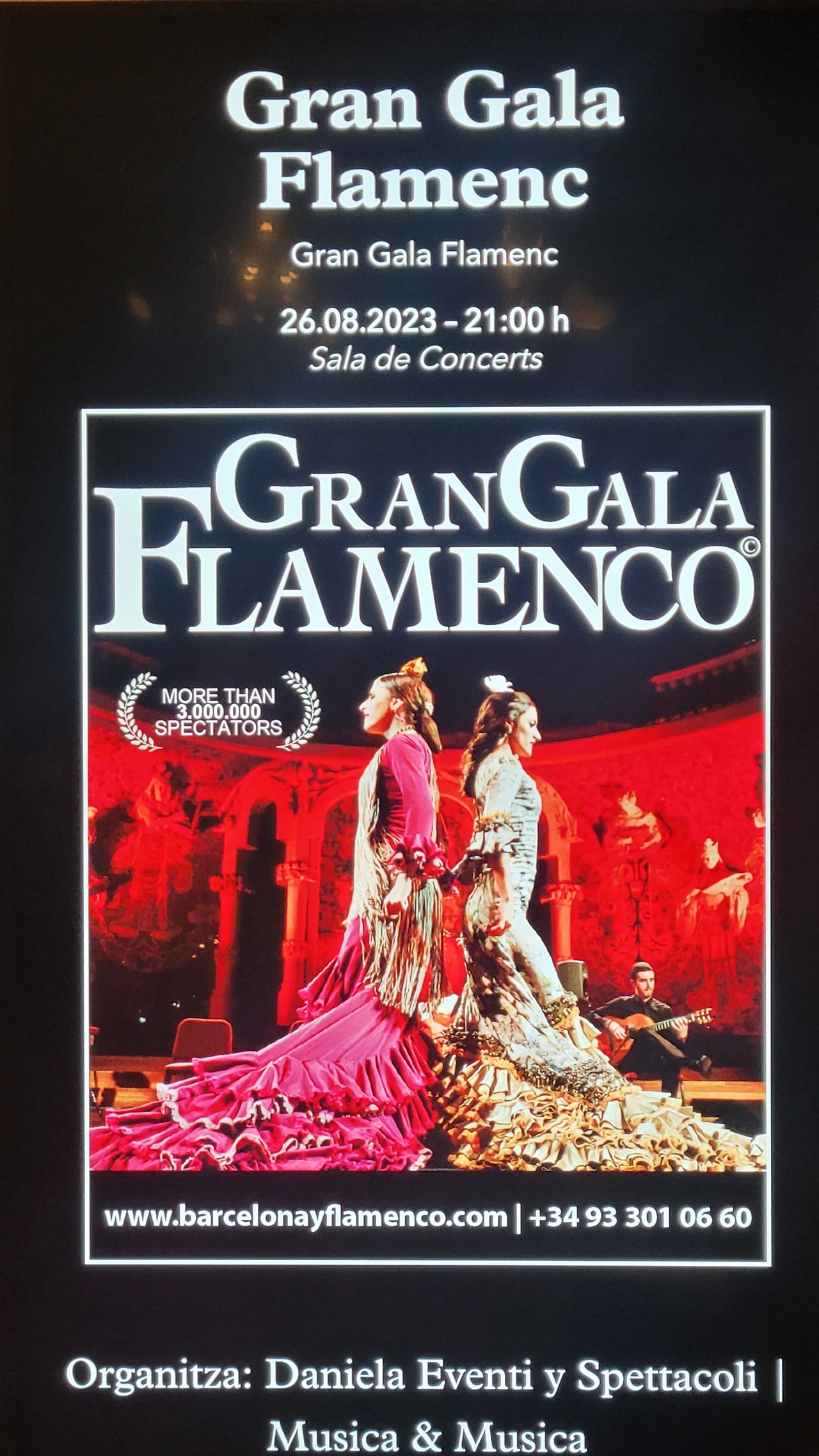 그토록 명성이 자자한 음악당에서 하는 공연을 보고 싶은 마음에 프로그램을 살펴보았다. 시간이 여유가 있는 날 오후에 마침 플라멩코 공연이 있었다. 플라멩코에 대한 지식은 별로 없지만 남미의 탱고와 비슷한 춤 공연이 아닐까 생각했다. 게다가 정열 하면 스페인을 떠올리지 않던가. 그래서 플라멩코도 아주 정열적인 춤일 거라는 예상을 했다. 전 여행지였던 영국에서 뮤지컬의 본 고장의 공연을 직관해 보려는 마음이 있었는데 당일 표를 구하지 못해 그러질 못했다. 스페인에서는 영국의 전철을 밟지 않으려 바로 예매를 했다.