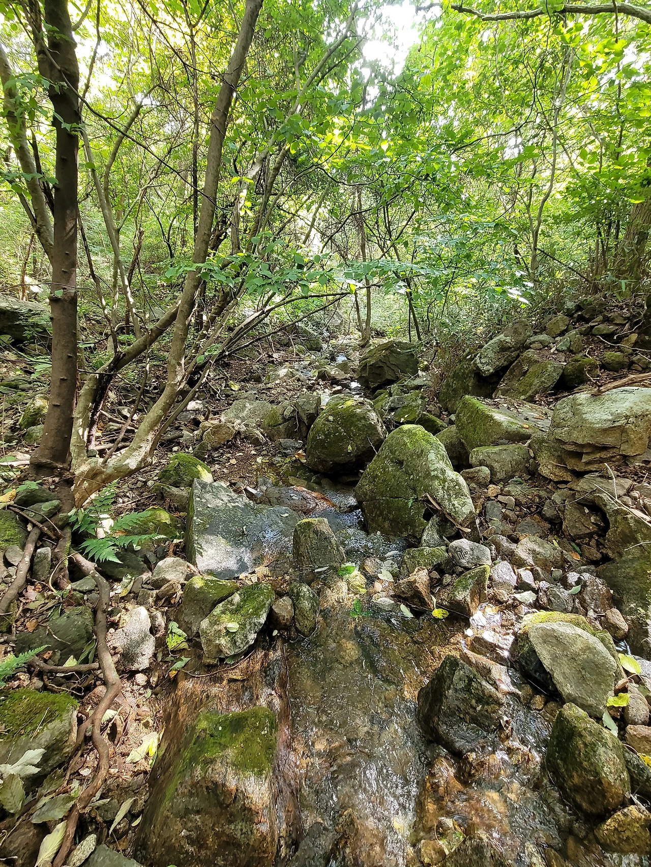그런 후에는 또 감감무소식이다. 원래 능이는 자라는 곳에 무리 지어 나는데 아무리 찾아도 보이질 않았다. 점심시간이 되어 시장기를 반찬 삼아 점심을 먹었다. 산에서 먹는 음식은 무엇을 먹어도 맛이 있다. 점심을 마치고 다시 힘을 내서 다른 봉우리를 향해 진군을 했다. 동서의 뒤를 힘겹게 따르며 오르내리기를 한동안 하다 보니 준비한 물도 다 먹어버렸다. 하는 수없이 흐르는 계곡물을 마셨는데 오히려 가져온 물맛보다 더 시원하고 맛이 있었다.