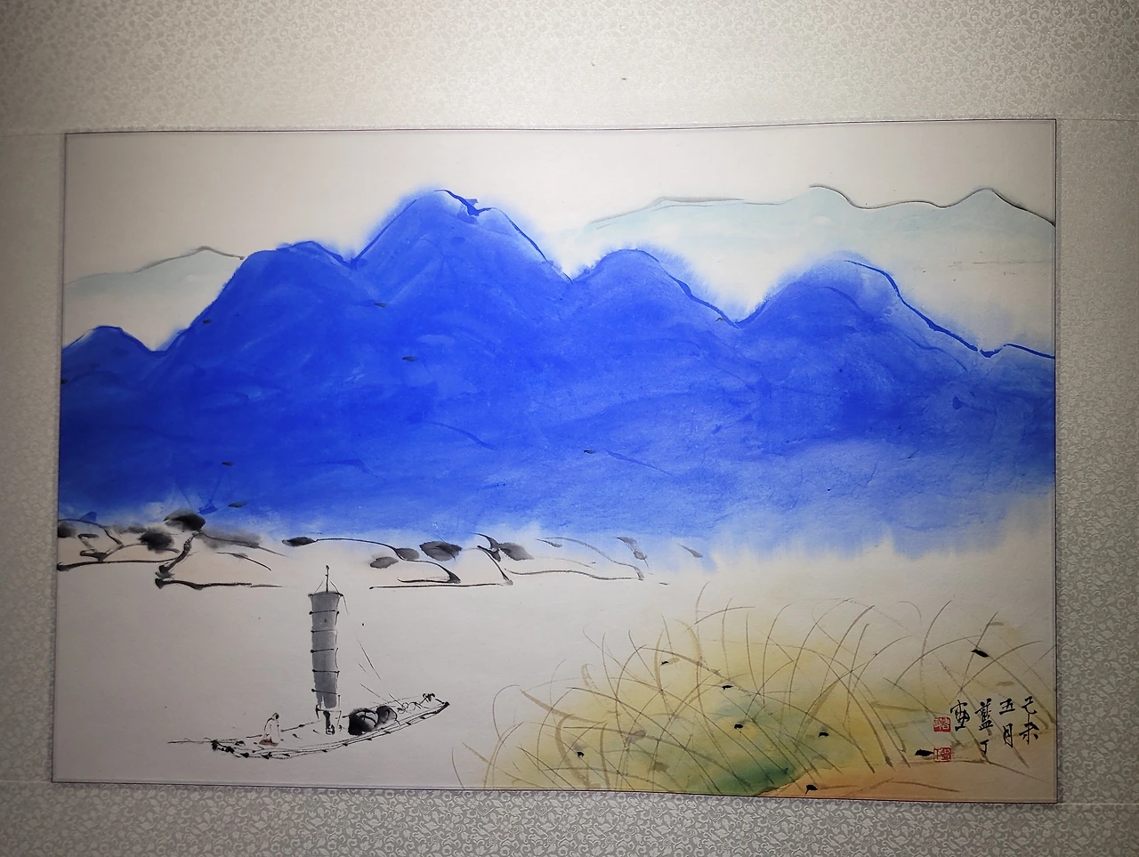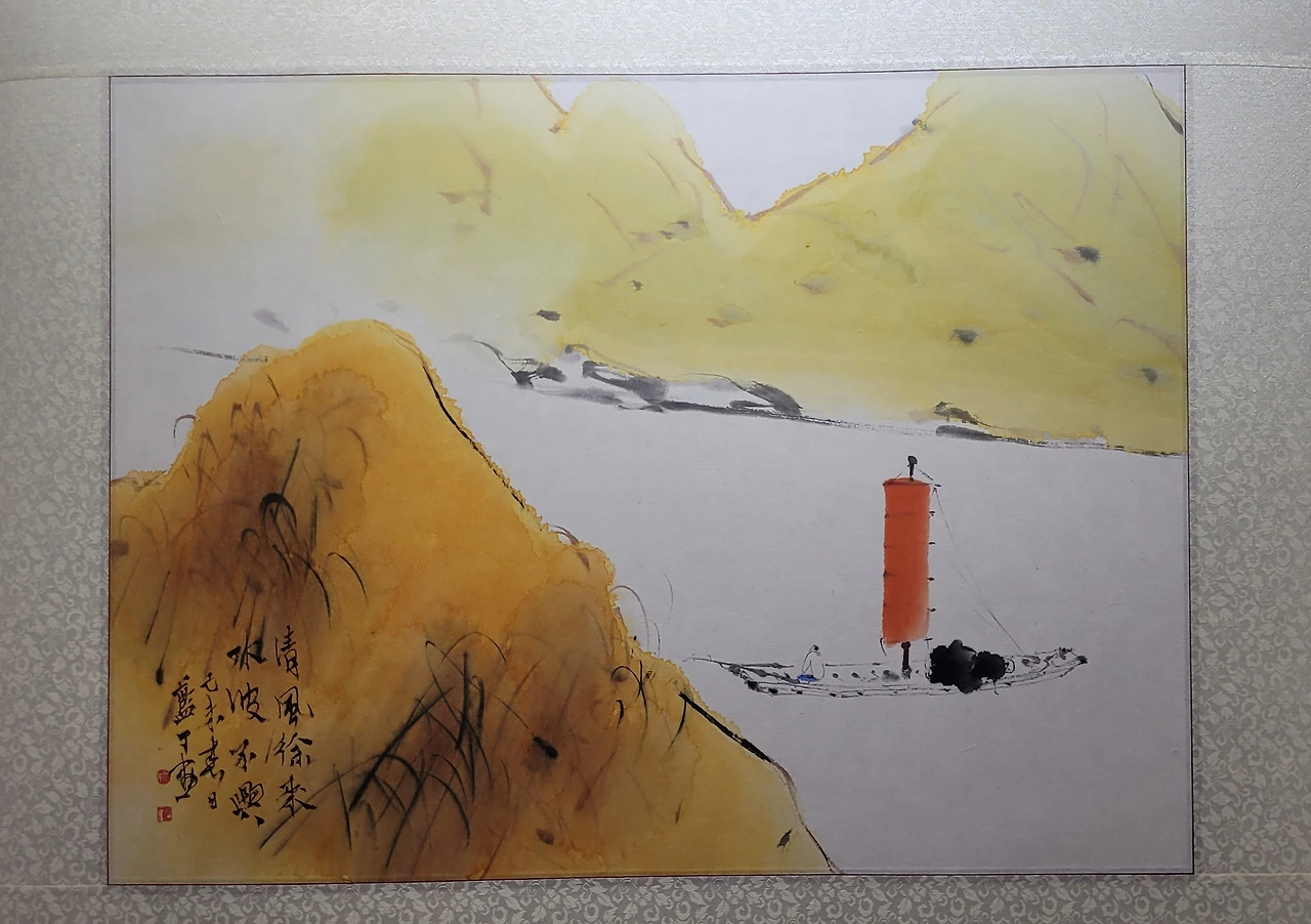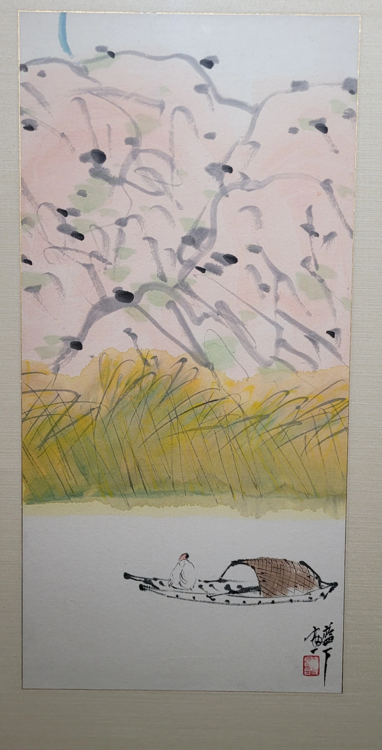 그림에 남색이 보이지 않는 작품도 보인다. 쓱쓱 그리듯 자유로운 필치와 간결한 색상이 담겼다. 강물의 조각배에는 한 남자가 앉아있는 데 분위기가 한가롭고 평화롭다. 그림에서 강이 그림에서 차지하는 부분이 작은데도 불구하고 채색을 하지 않고 여백으로 남겨 공간을 확장시킨다.
