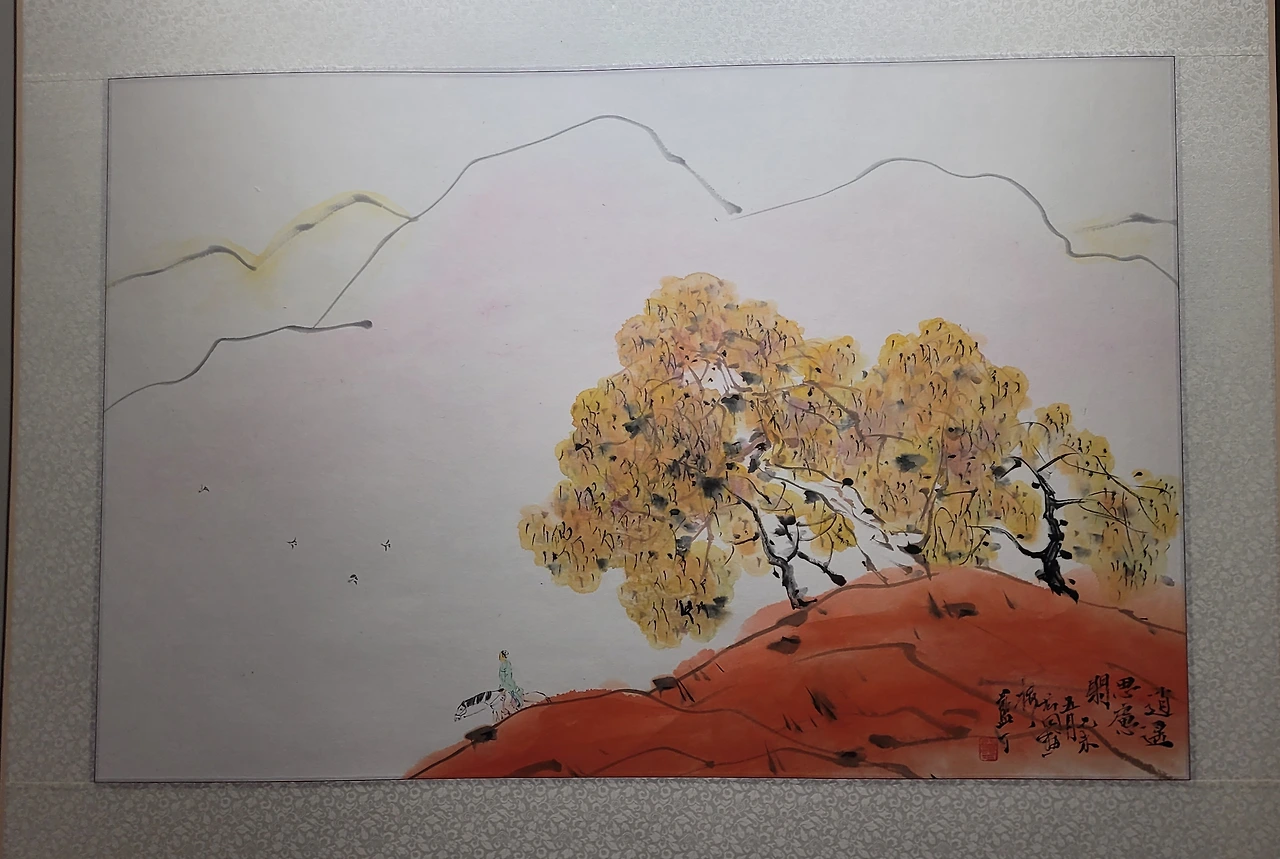 가을 풍경이 물씬 풍겨 나는 작품도 보인다. 추색을 담은 붉은 색감이 화려하게 물든 단풍을 떠올리게 한다. 그림에는 자연을 즐기는 한 사람이 등장하여 그림에 생명을 담는다.