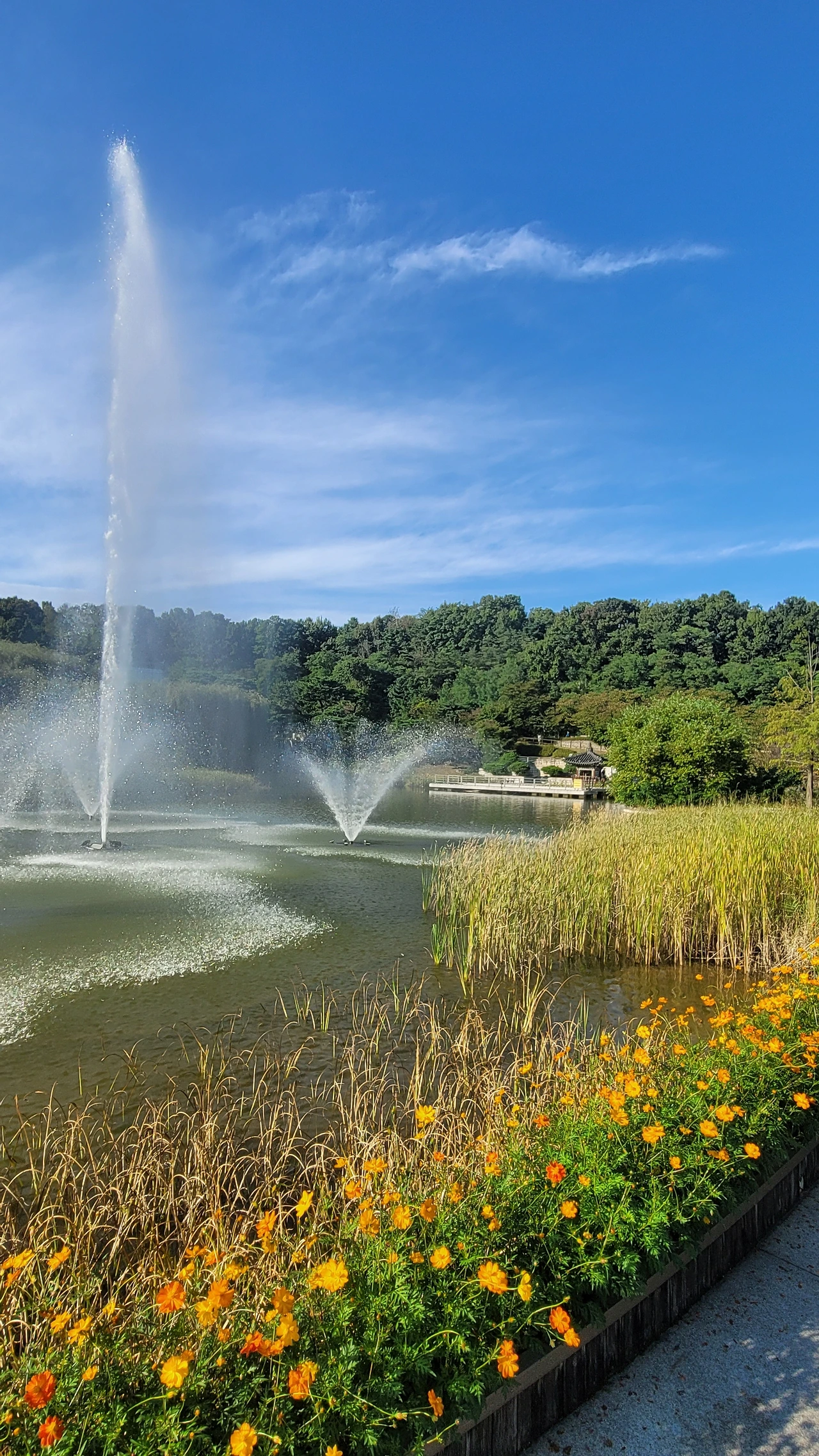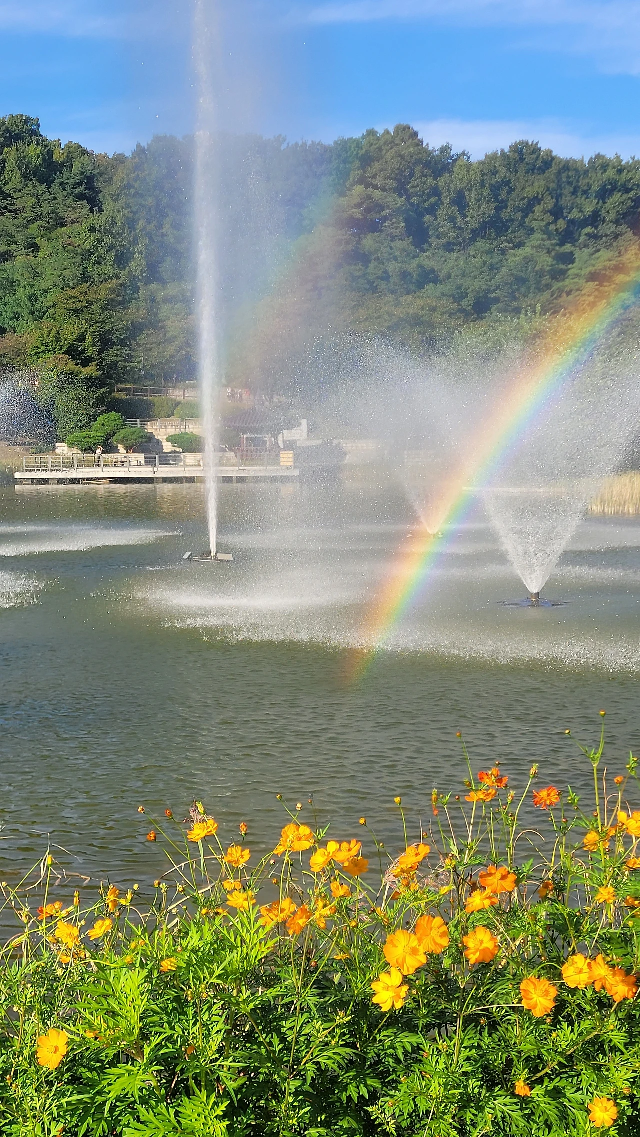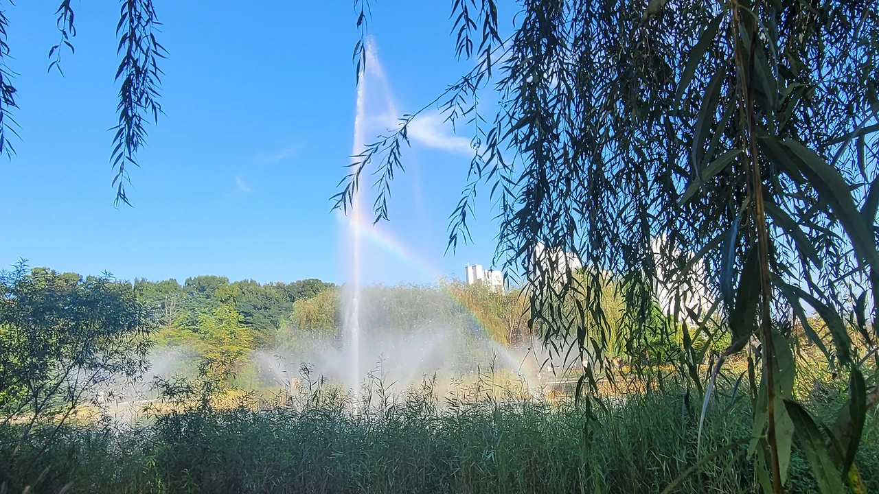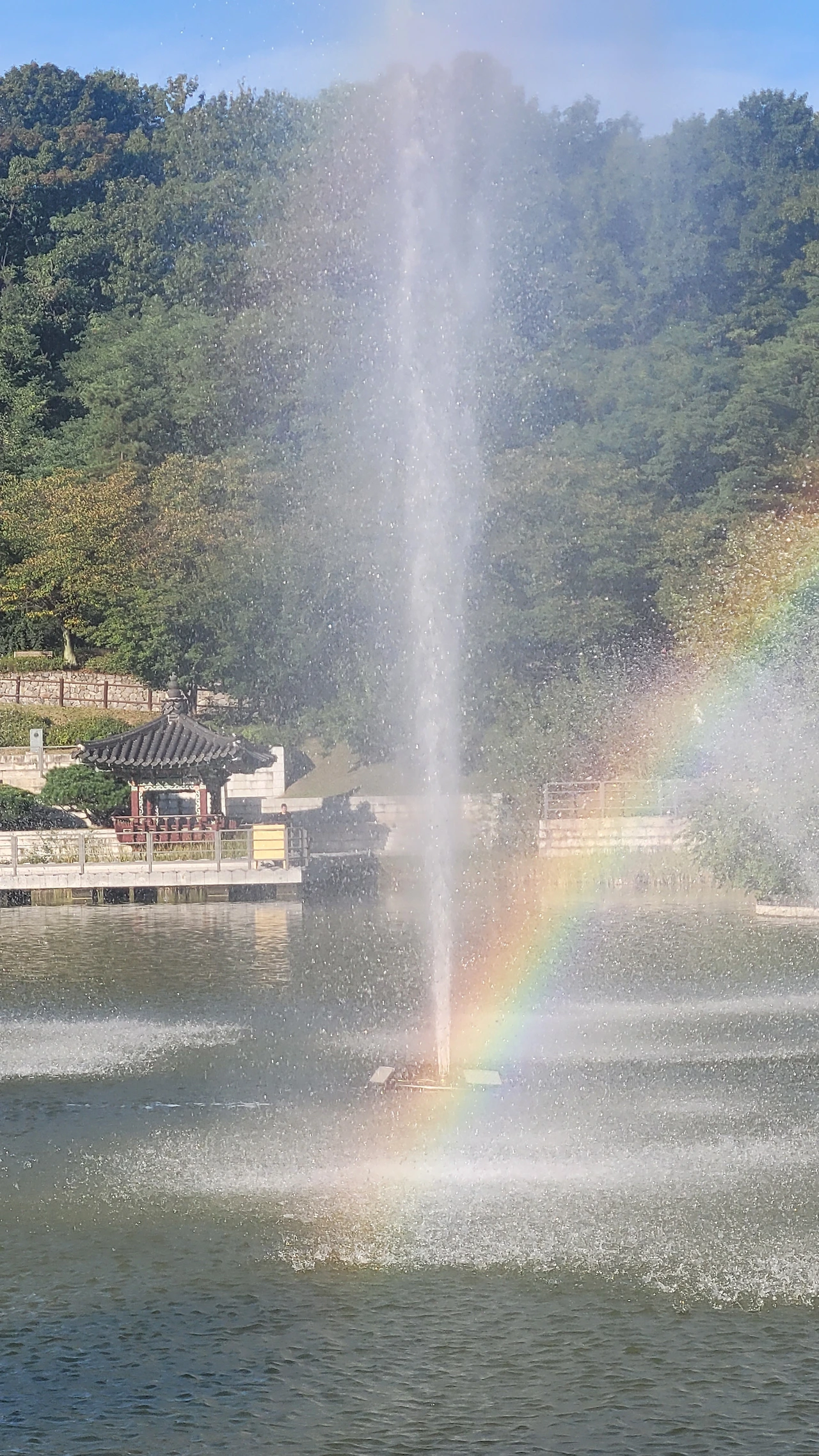 공원 안에 있는 연못 월영지에 분수가 하늘 높이 솟아오른다. 시원하게뿜어내는 물줄기에 화려한 무지개가 피어난다. 마음이 뻥 뚫리는 풍경이다.
