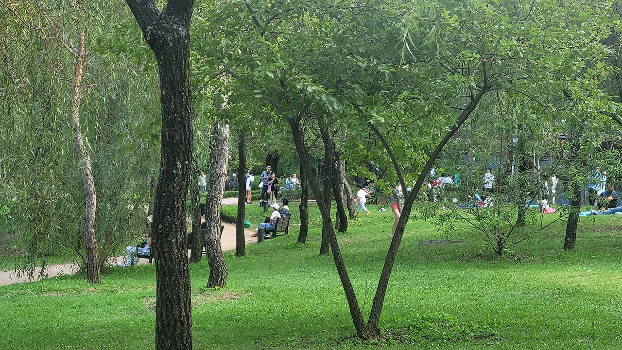 버드나무 가지가 늘어진 잔디밭에 자리를 잡았다. 매트를 펼치고 앉아 시원한 경치를 눈에 담는다. 하늘을 보니 구름이 깔린 하늘에 연 하나가 떠 있다.