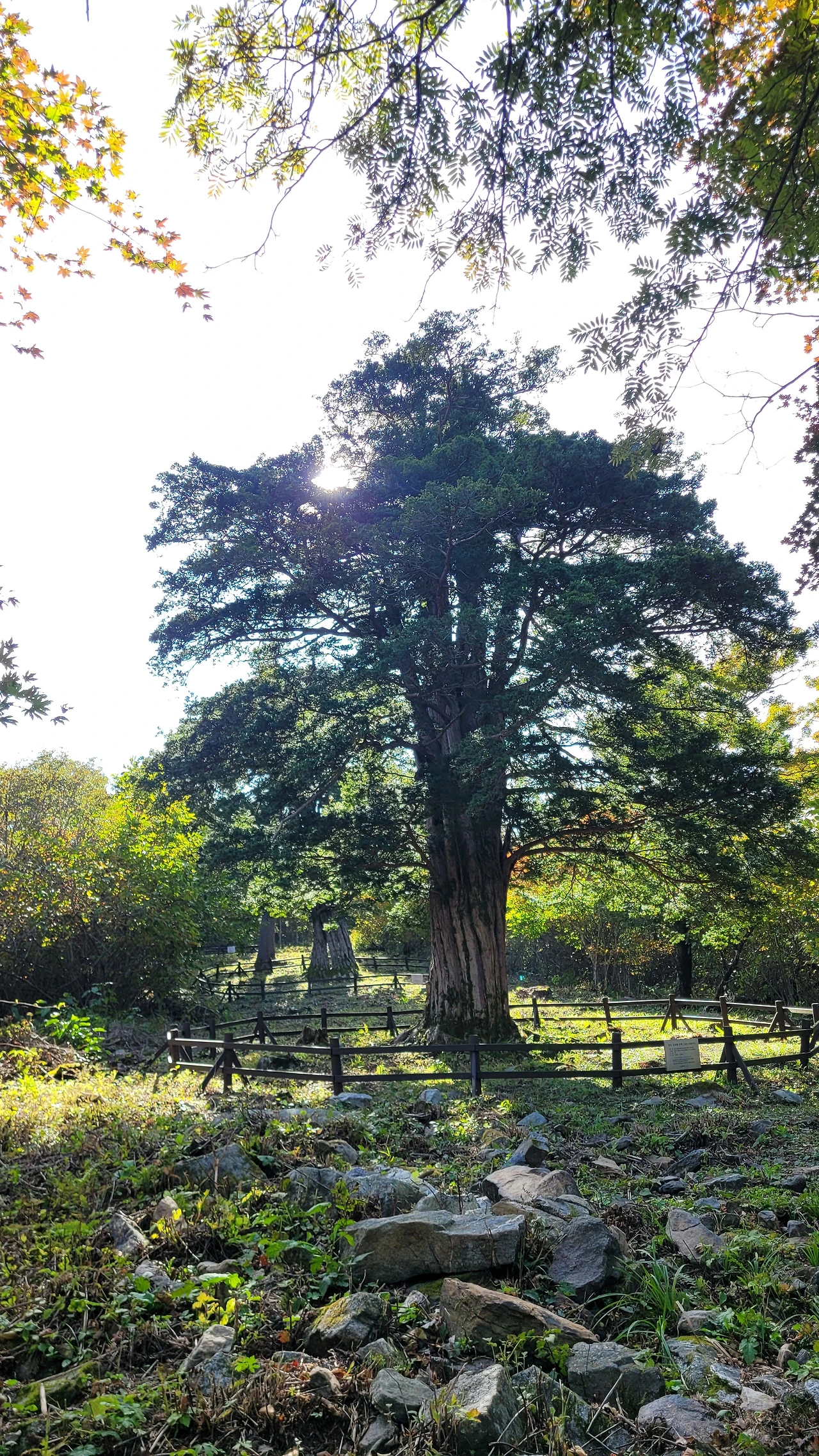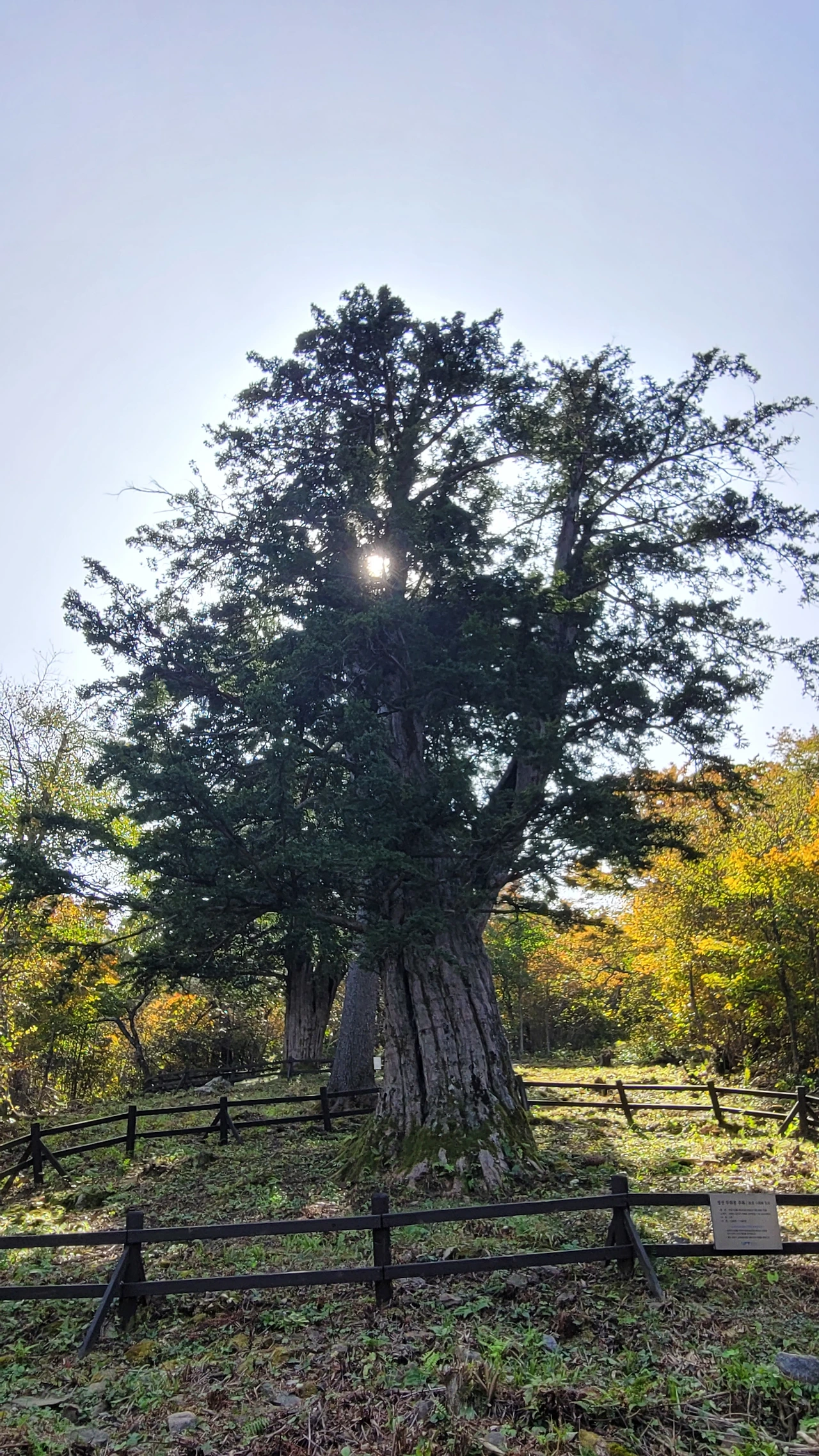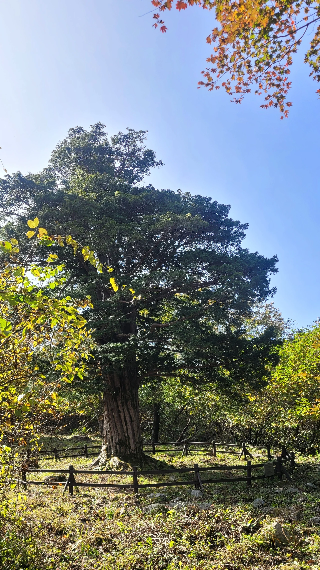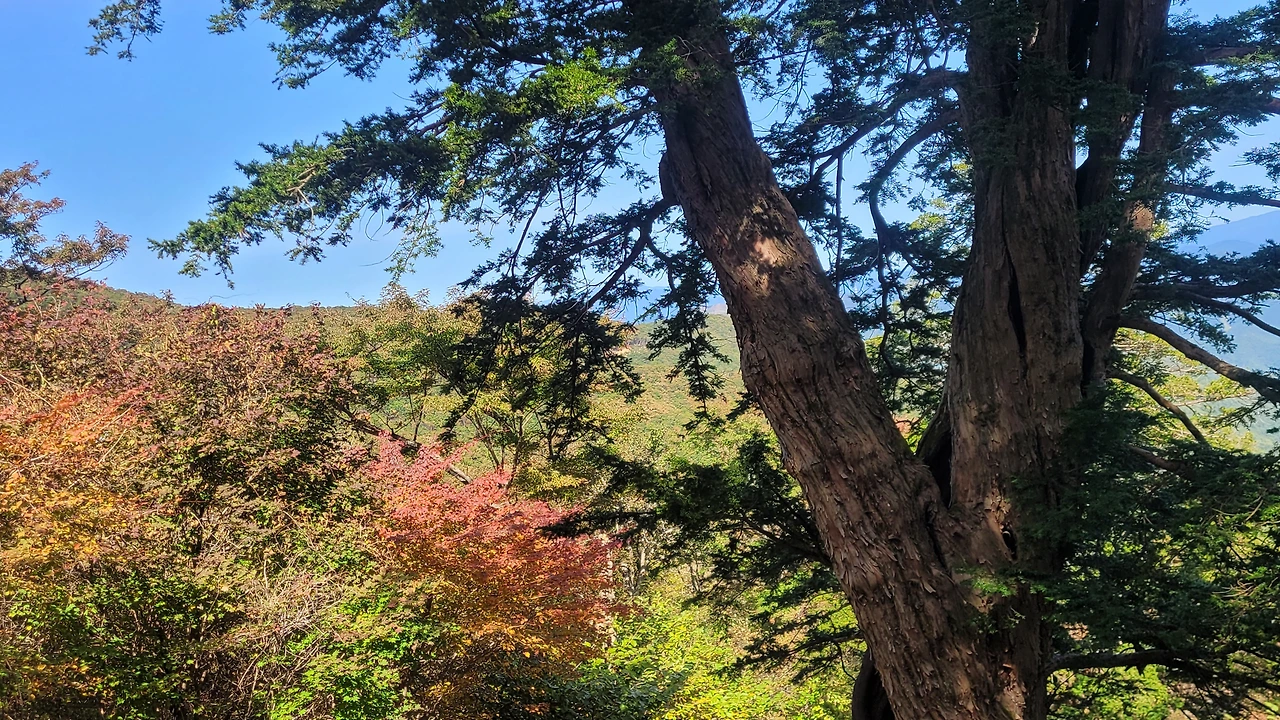 뒤틀리며 위로 오르는 수피는 번째 주목과 다른 느낌을 준다. 중심이 텅 비었지만 꿋꿋하게 삶을 살아가는 불굴의 의지에 숙연해진다. 다 가졌지만 늘 부족한 작은 것들을 찾아내 불평하는 나의 삶이 투영되어 부끄럽다. 늘 푸른 가지를 드리운 옆에 붉게 물들어 가는 단풍이 대조를 이루며 풍경을 만들고 있다.