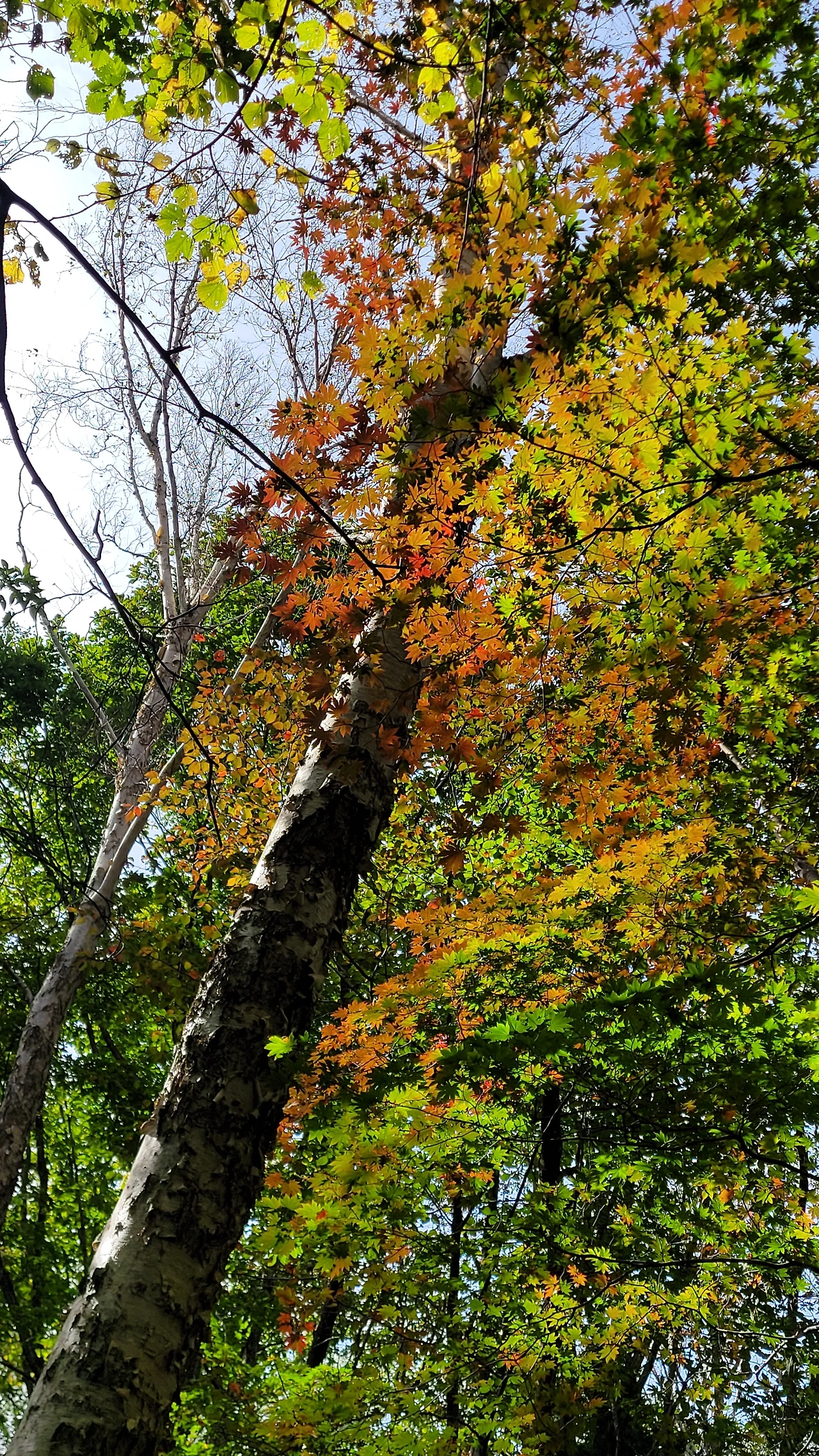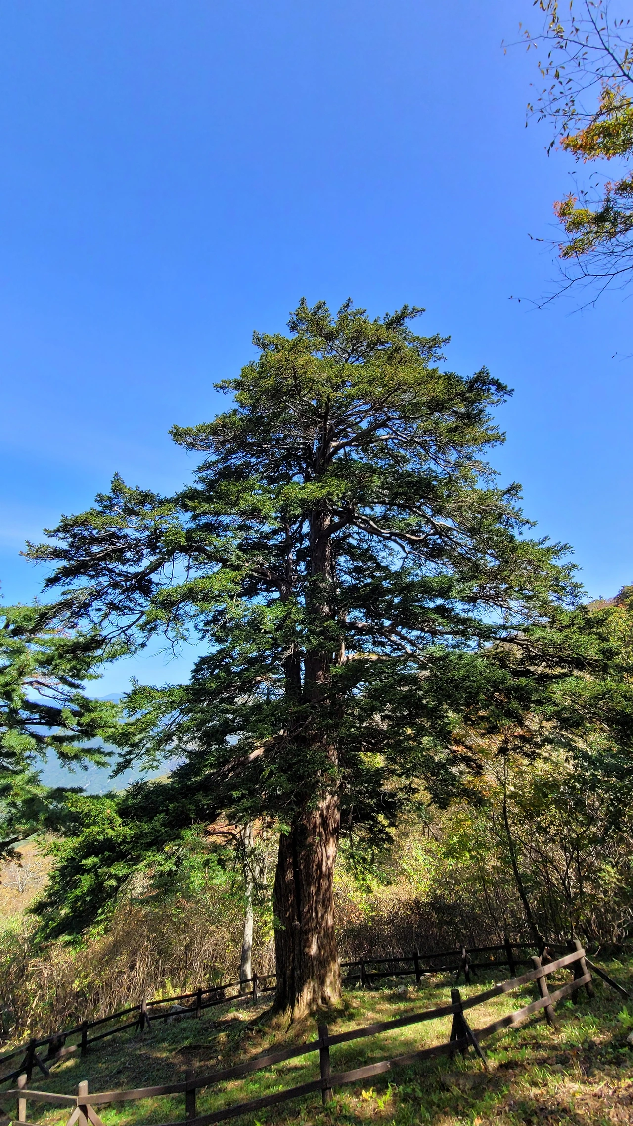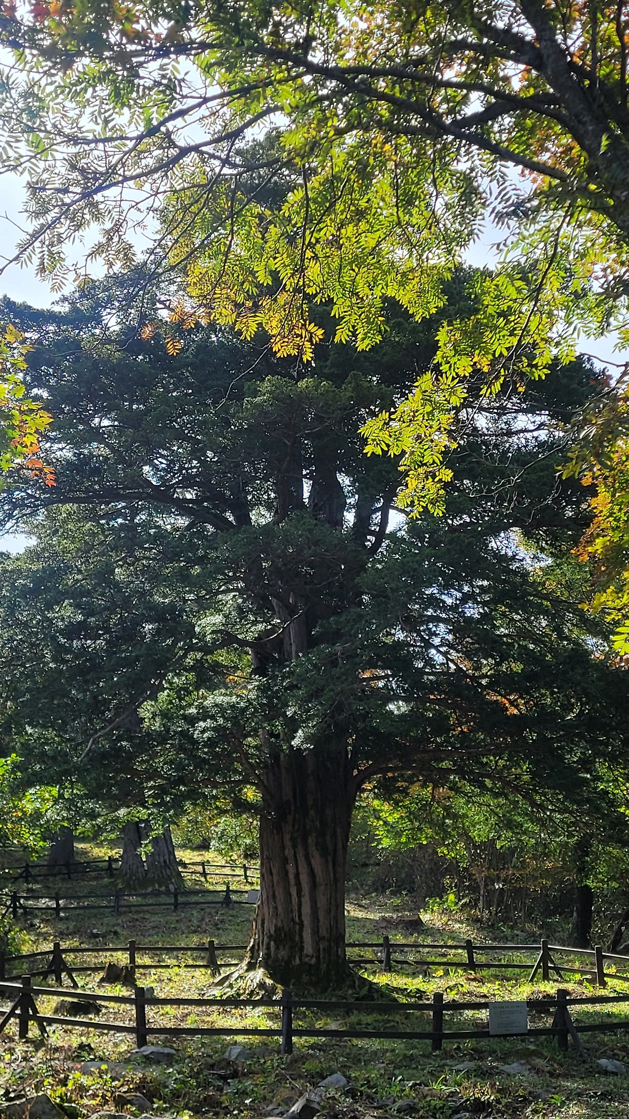 뒤틀리며 위로 오르는 수피는 번째 주목과 다른 느낌을 준다. 중심이 텅 비었지만 꿋꿋하게 삶을 살아가는 불굴의 의지에 숙연해진다. 다 가졌지만 늘 부족한 작은 것들을 찾아내 불평하는 나의 삶이 투영되어 부끄럽다. 늘 푸른 가지를 드리운 옆에 붉게 물들어 가는 단풍이 대조를 이루며 풍경을 만들고 있다.