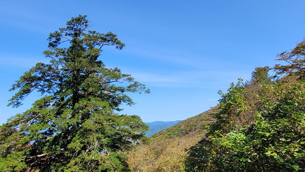 마지막 한 그루도 똑같이 당당한 위엄을 지녔다. 산마루 아래 세 그루가 줄 지어 기나긴 세월 동안 지금까지 건강한 삶을 이어온 사실이 너무 경이롭다. 이웃한 벗들이 있기에 숱한 시간들을 참고 견딘 것은 아닐까? 그 자리에 서서 숲이 산으로 이어지는 위로 푸른 하늘이 펼쳐졌다. 다행스러운 점은 산꼭대기가 아닌 중턱에 자리를 잡아 그곳이 아늑한 보금자리가 되었다는 것이다.