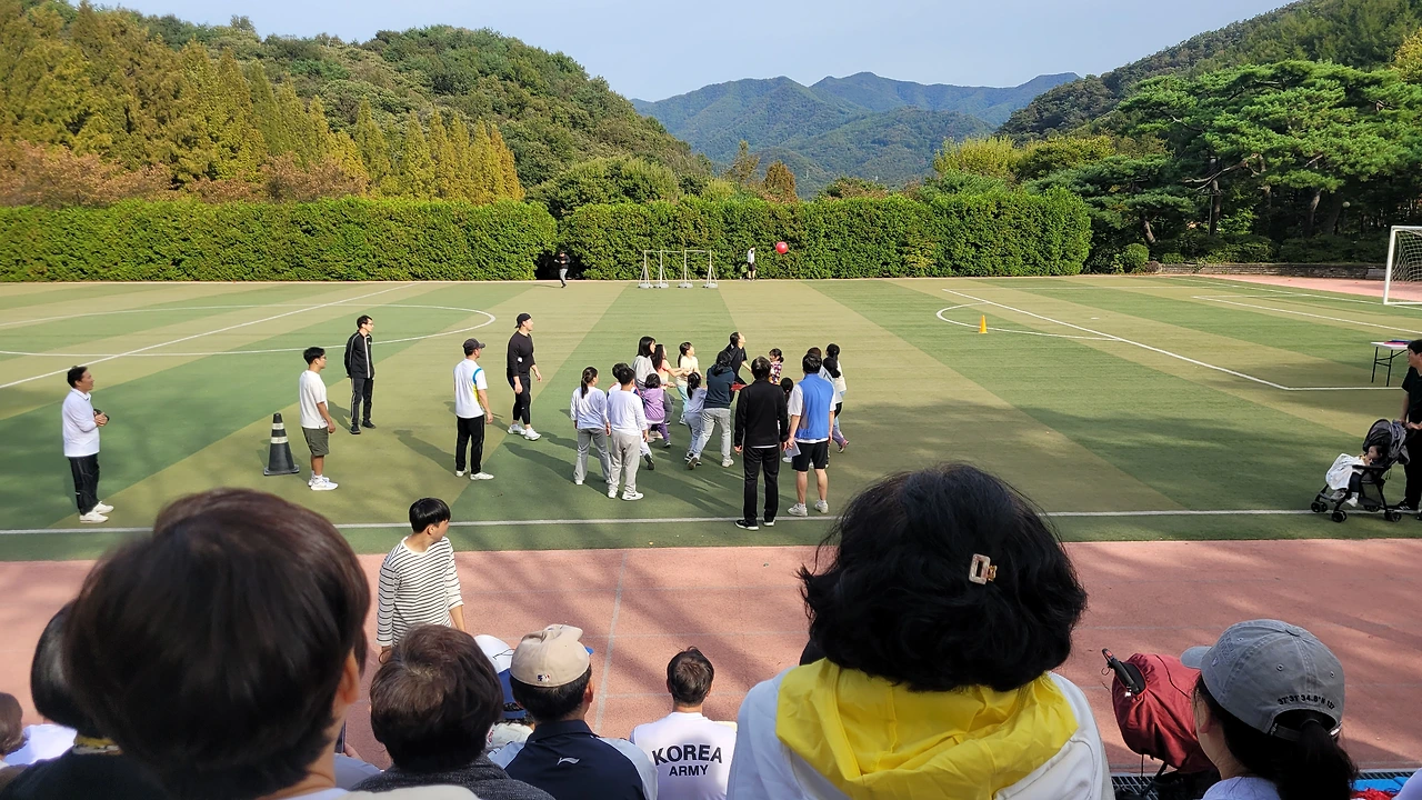 이 체육대회에는 특별한 프로그램이 있다. 그것은 1.6킬로미터를 달려서 그 기록으로 체력을 점검한다. 이 시간에는 아이들을 포함해 모두가 참여한다. 좀 쌀쌀한 감이 없지 않지만 오전에 구름이 잔뜩 끼어 따가운 햇살이 숨은 덕분에 달리기 하는데 딱 좋은 날씨였다.