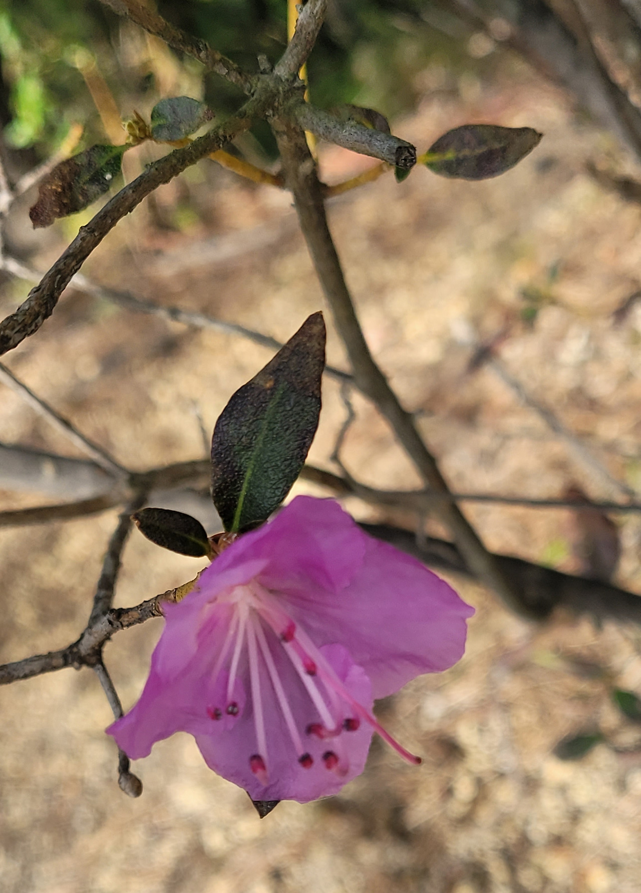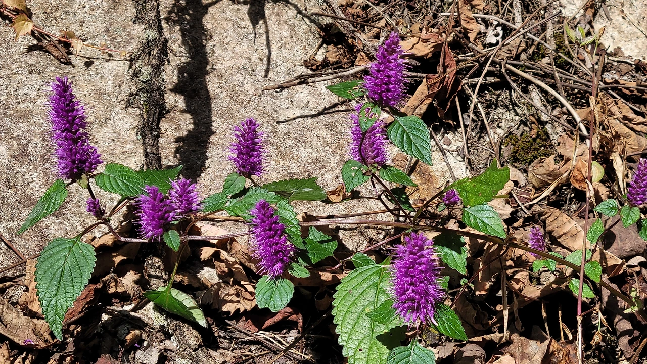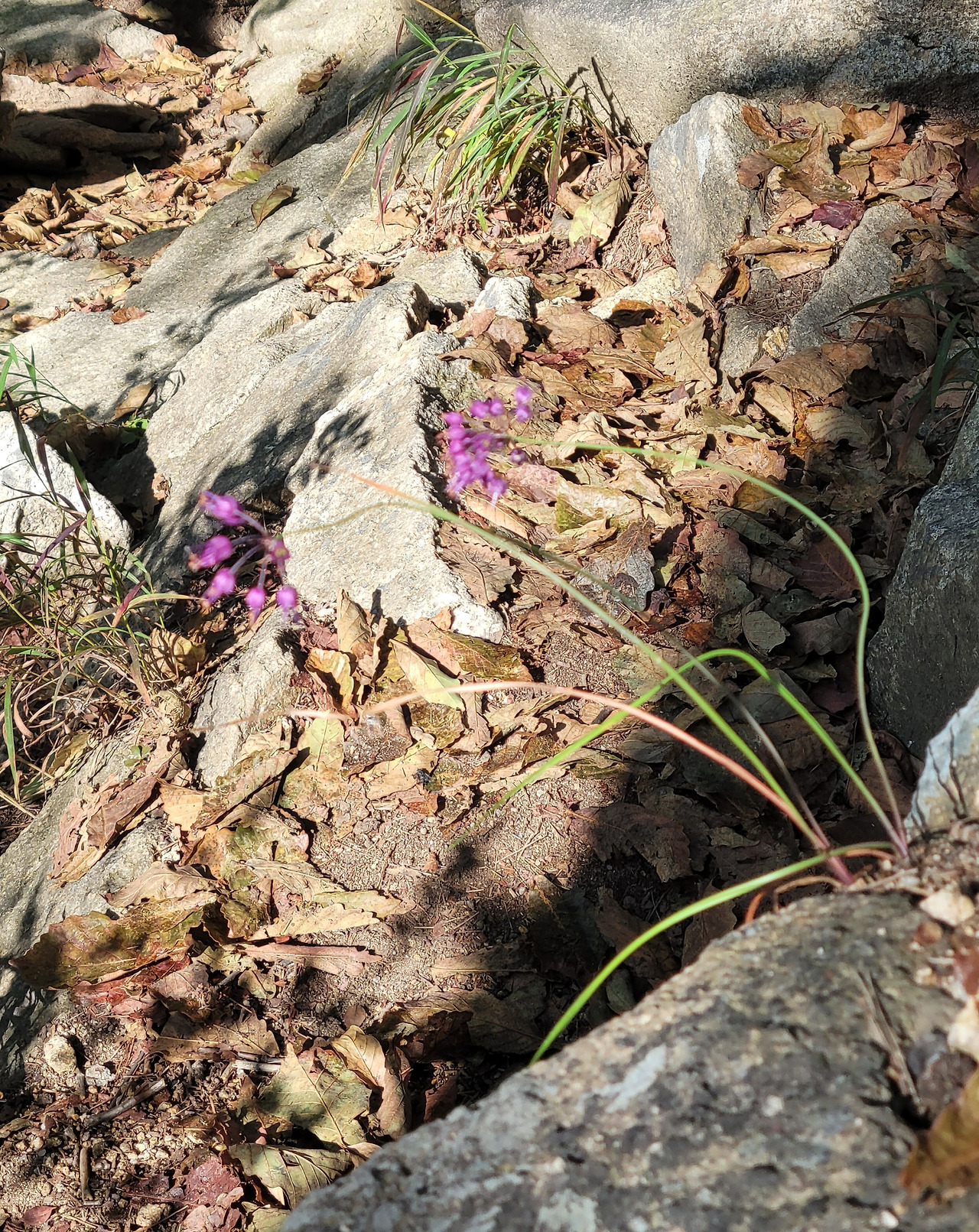 꽃을 이미 피워버린 풀꽃들은 한 해의 결실을 맺고 떠날 준비를 하고 있는 데, 반갑게도 한창 꽃을 피운 아이들도 있다. 물봉선이 입구에 얼굴을 내밀고 철없는 진달래도 계절을 잊고 꽃망울을 피웠다. 가장 자주 눈에 띄는 꽃은 산부추다. 가녀린 잎 사이로 꽃대를 내밀고 앙증맞은 보라색 꽃송이가 우산처럼 당차게 피었다. 입구부터 산마루까지 심심하다 싶으면 까꿍 하듯이 눈이 마주쳐 지친 발걸음을 격려해 준다.