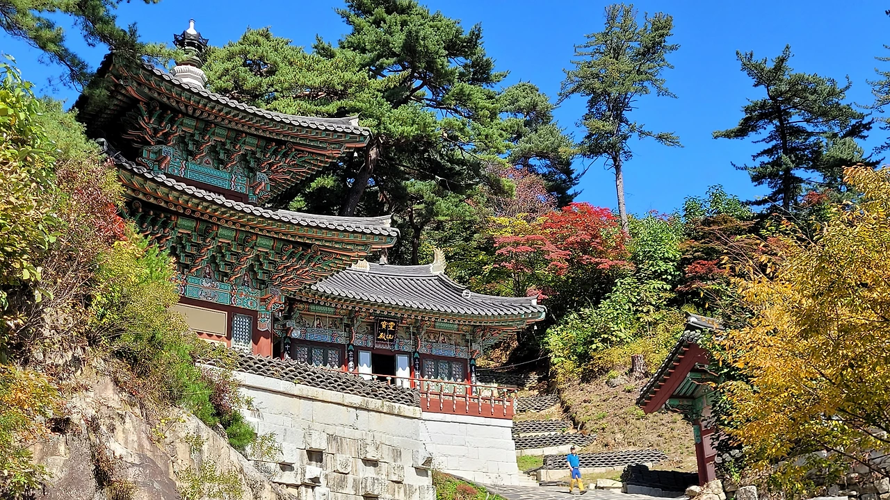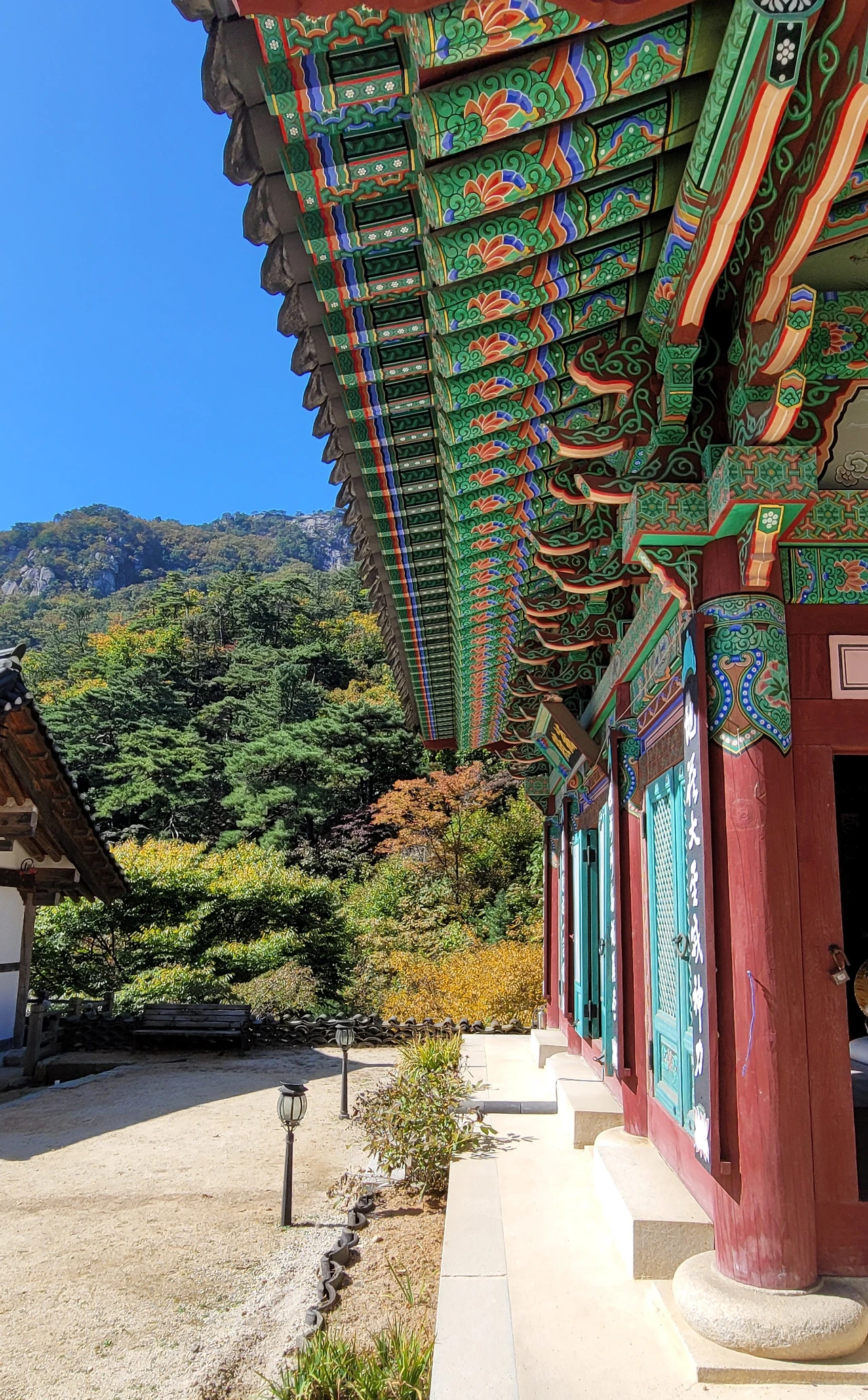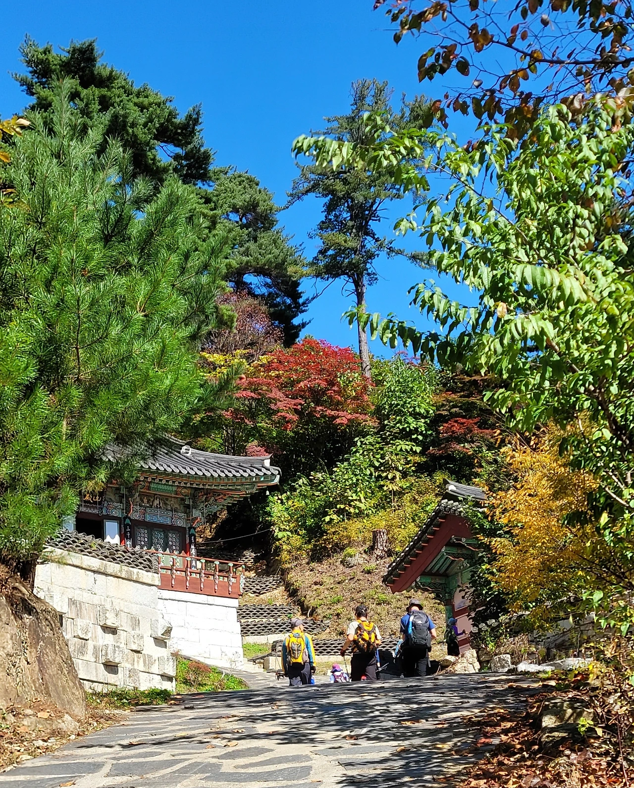반대편 길로 하산을 하면서 현등사에도 들렀다. 신라 법흥왕 때 창건된 절이라고 하지만 1829년에 전소하여 중건과 개축이 이루어져 오래된 느낌이 별로 없었다. 하지만 맑고 푸른 가을 하늘 아래 소나무와 가람의 화려한 단청과 단풍이 어우러진 정경은 눈이 부셨다. 가람 입구에 붉은 자줏빛을 머금고 개화한 꽃향유가 방문객을 반겼다.