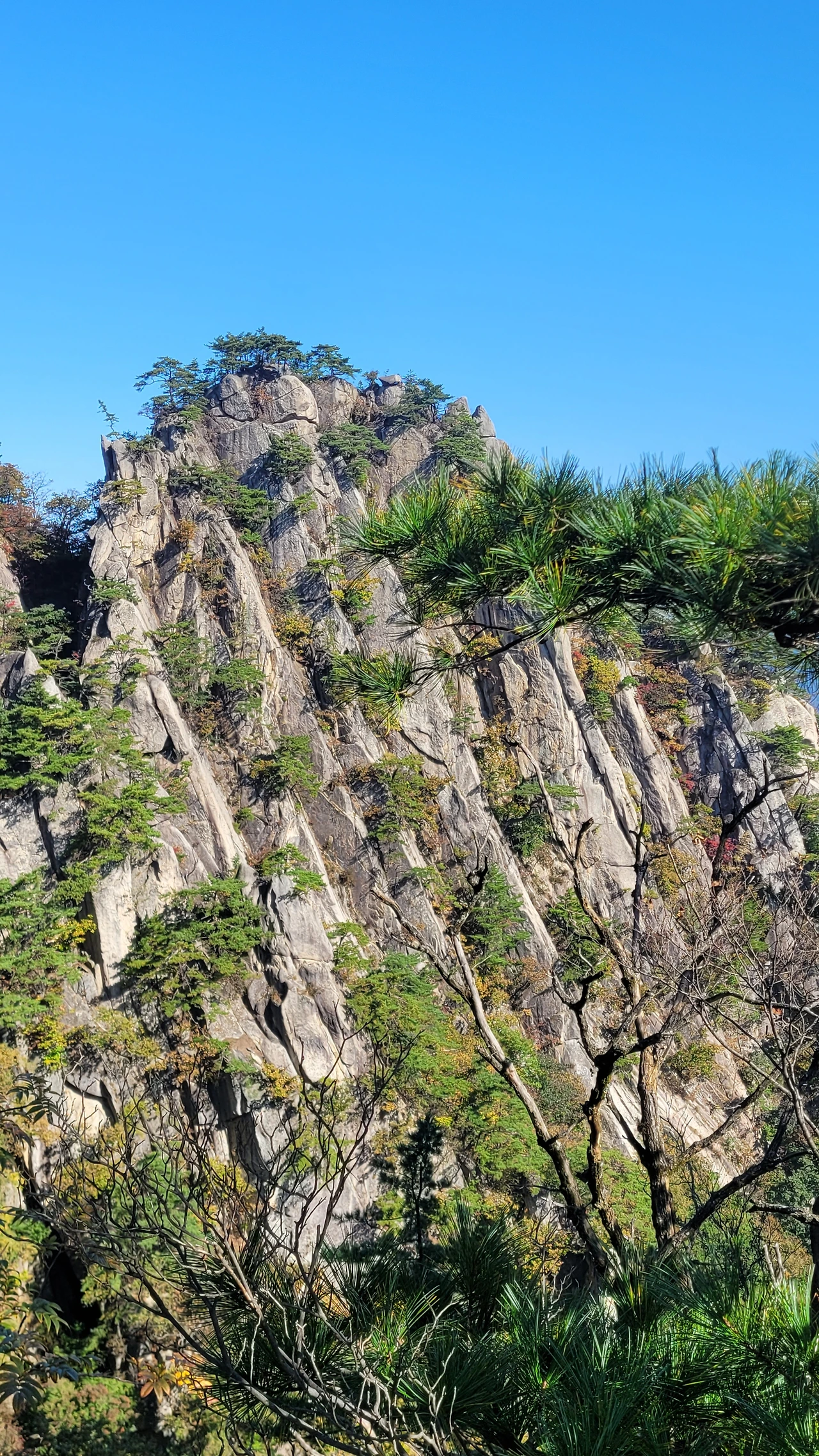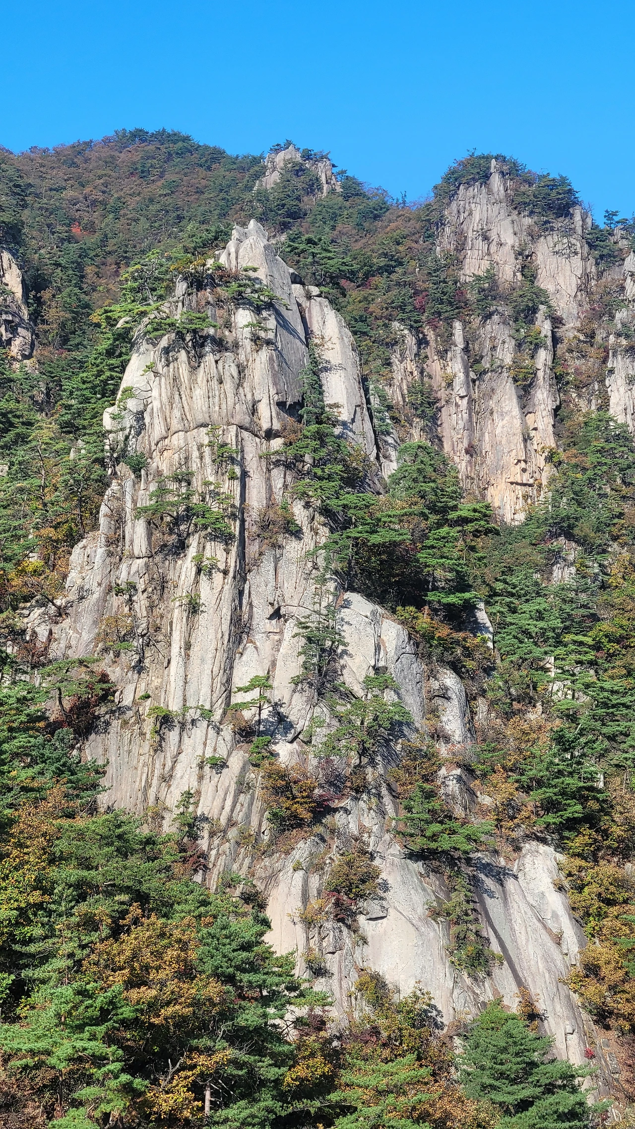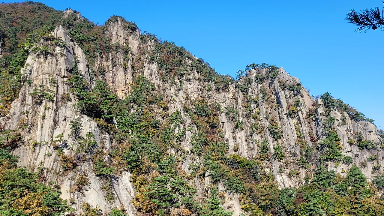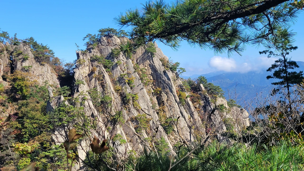 헉헉거리며 산을 올라 하늘에 가까이 갈수록 기암의 위용이 드러난다. 가로로 그어놓은 듯한 돌출된 암벽들이 물결치듯 이어져 있고 장식처럼 소나무가 군데군데 자라나서 묵으로 그린 고서화의 아취가 풍긴다.