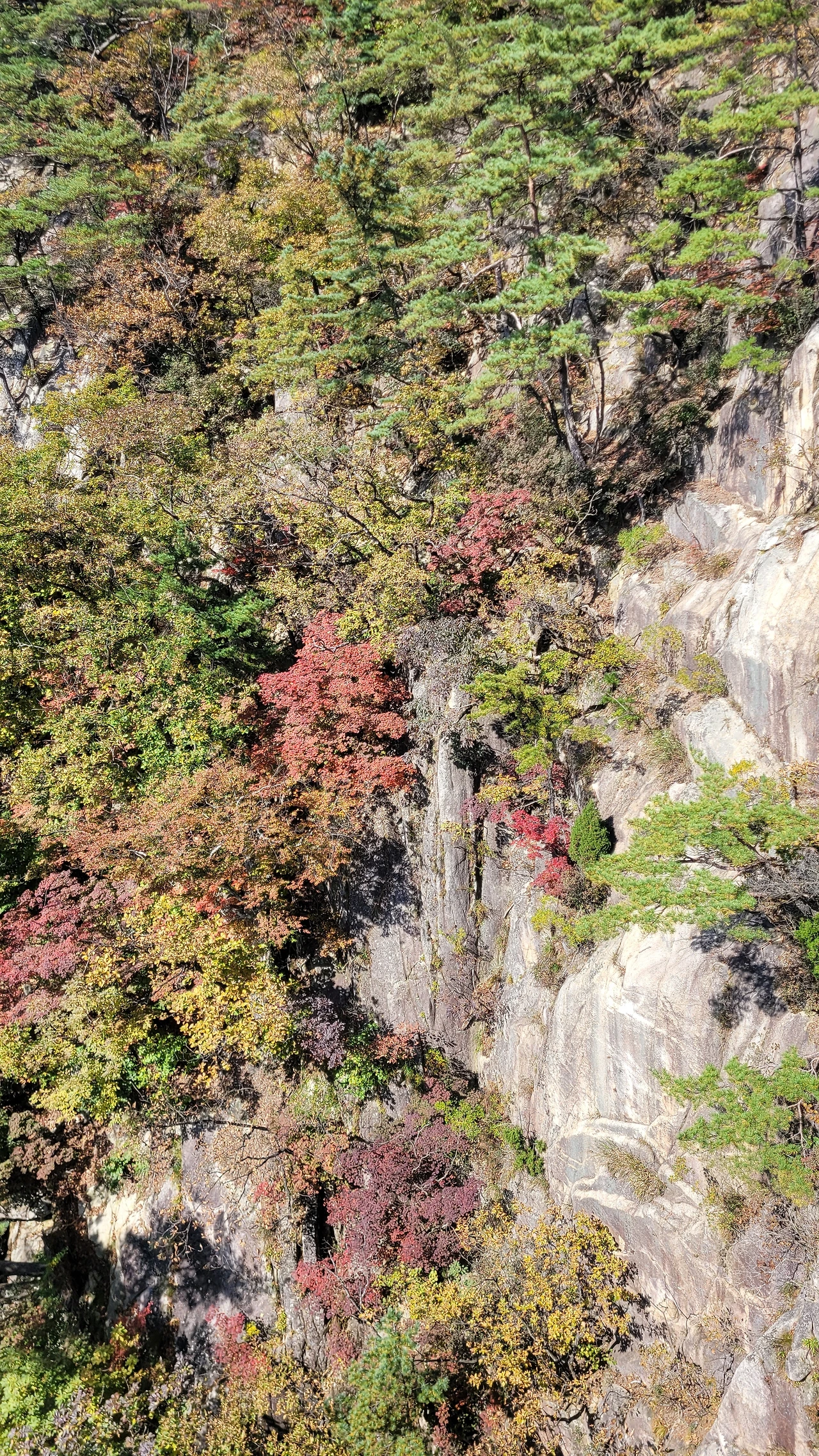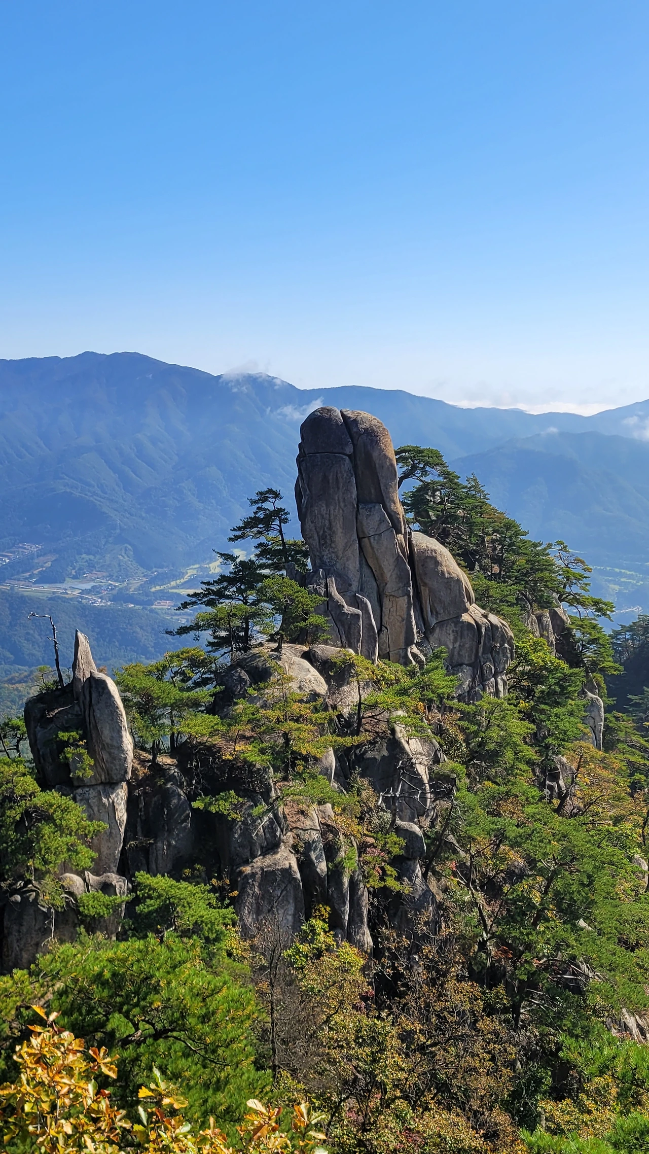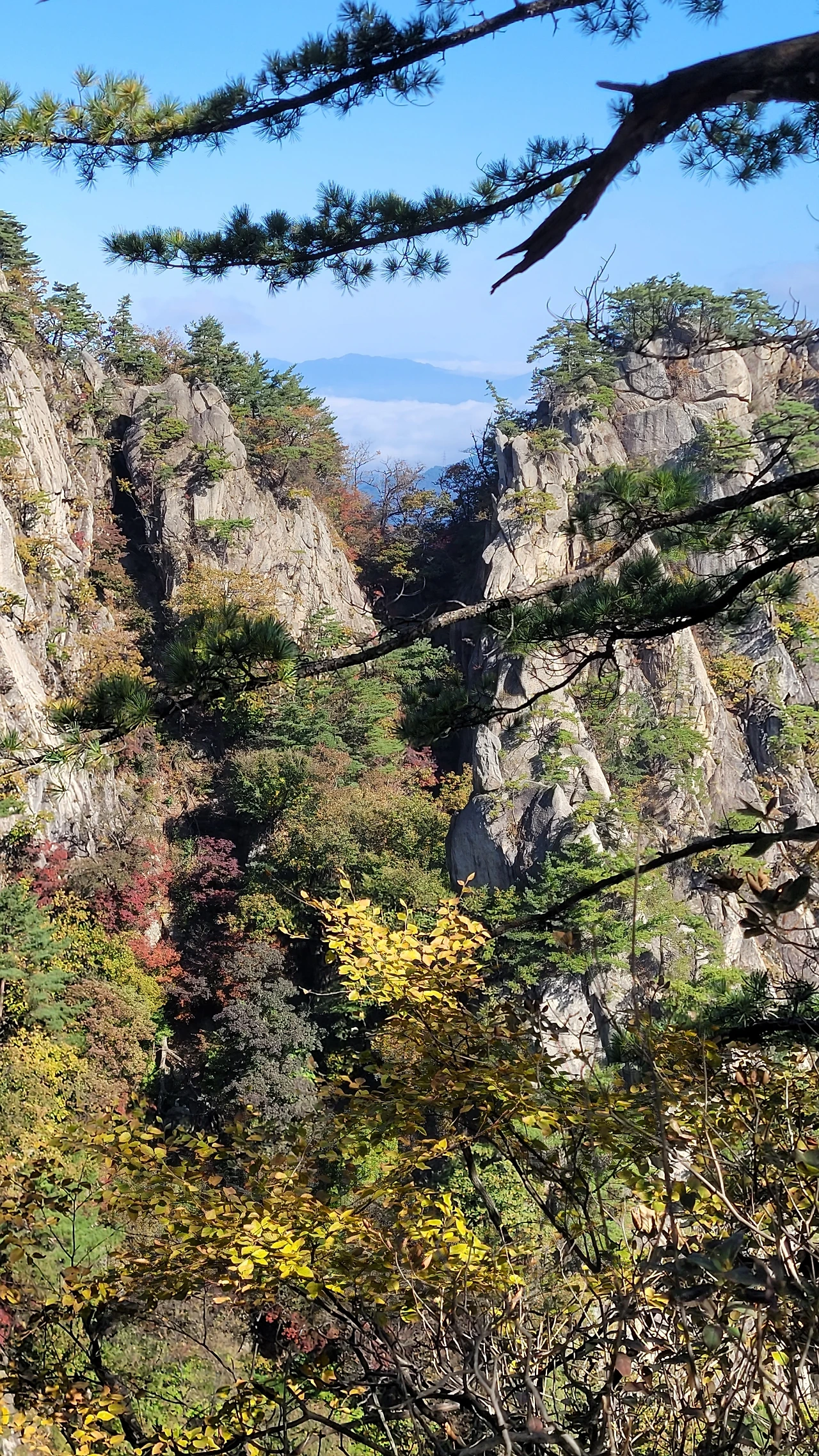 헉헉거리며 산을 올라 하늘에 가까이 갈수록 기암의 위용이 드러난다. 가로로 그어놓은 듯한 돌출된 암벽들이 물결치듯 이어져 있고 장식처럼 소나무가 군데군데 자라나서 묵으로 그린 고서화의 아취가 풍긴다.
