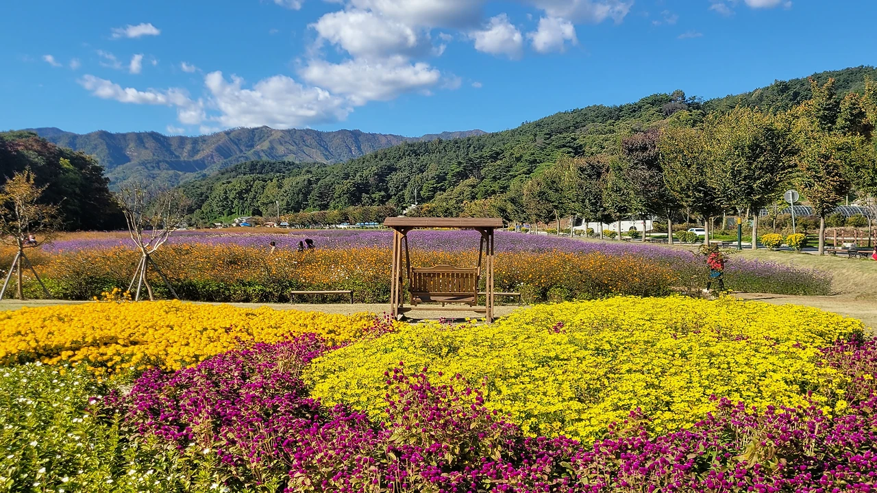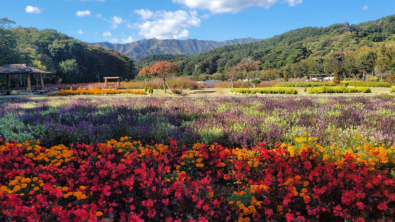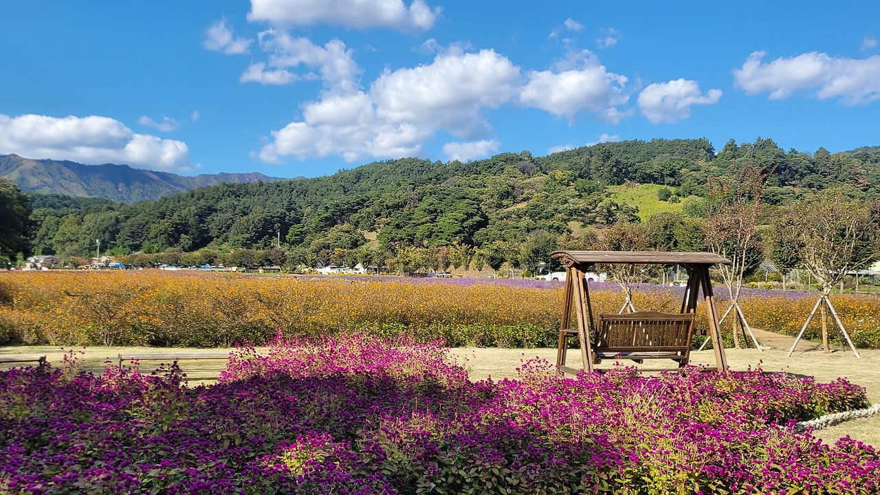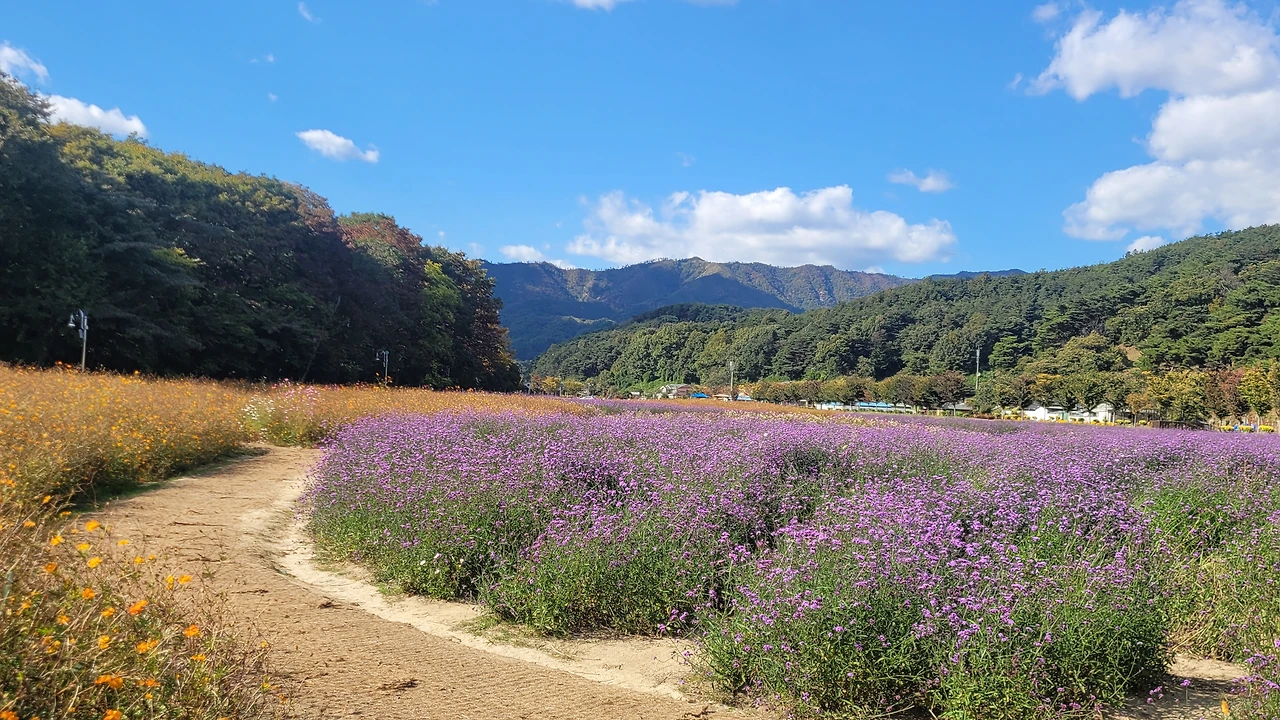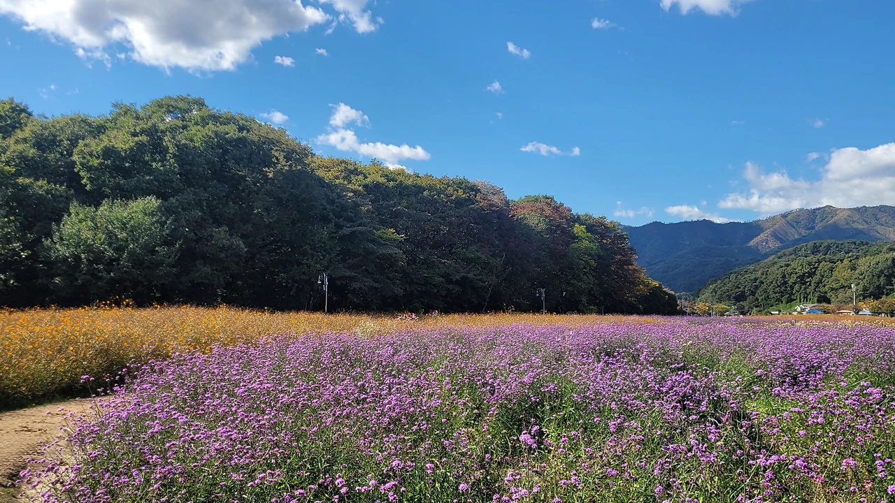 상림 숲 옆 광활한 터가 꽃들의 세상이다. 비록 노랑코스모스는 거의 다 졌지만 그 곁에 작은 꽃송이들이 수없이 달려있는 버들마편초가 만발한 들판은 온통 보라색으로 물들었다. 이뿐만이 아니다. 검붉은 빅베고니아와 노란 메리골드 그리고 안젤로니아, 숙근사루비아가 공간을 가득 채워 명랑한 원색이 일렁인다.