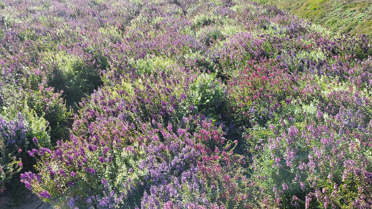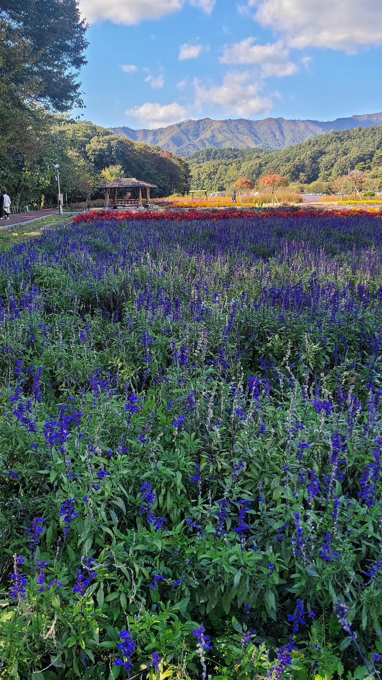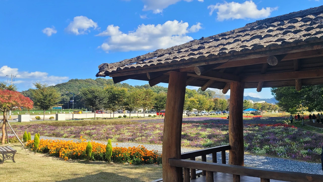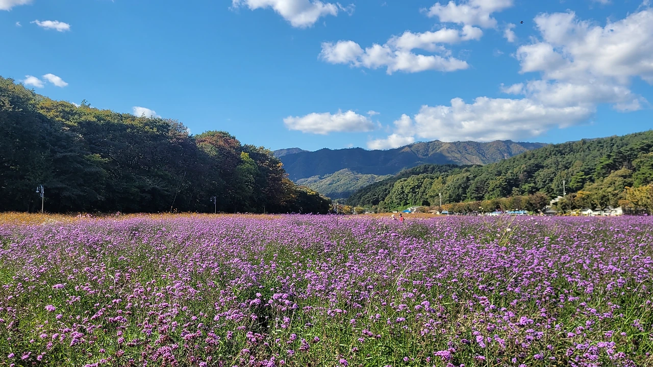 상림 숲 옆 광활한 터가 꽃들의 세상이다. 비록 노랑코스모스는 거의 다 졌지만 그 곁에 작은 꽃송이들이 수없이 달려있는 버들마편초가 만발한 들판은 온통 보라색으로 물들었다. 이뿐만이 아니다. 검붉은 빅베고니아와 노란 메리골드 그리고 안젤로니아, 숙근사루비아가 공간을 가득 채워 명랑한 원색이 일렁인다.