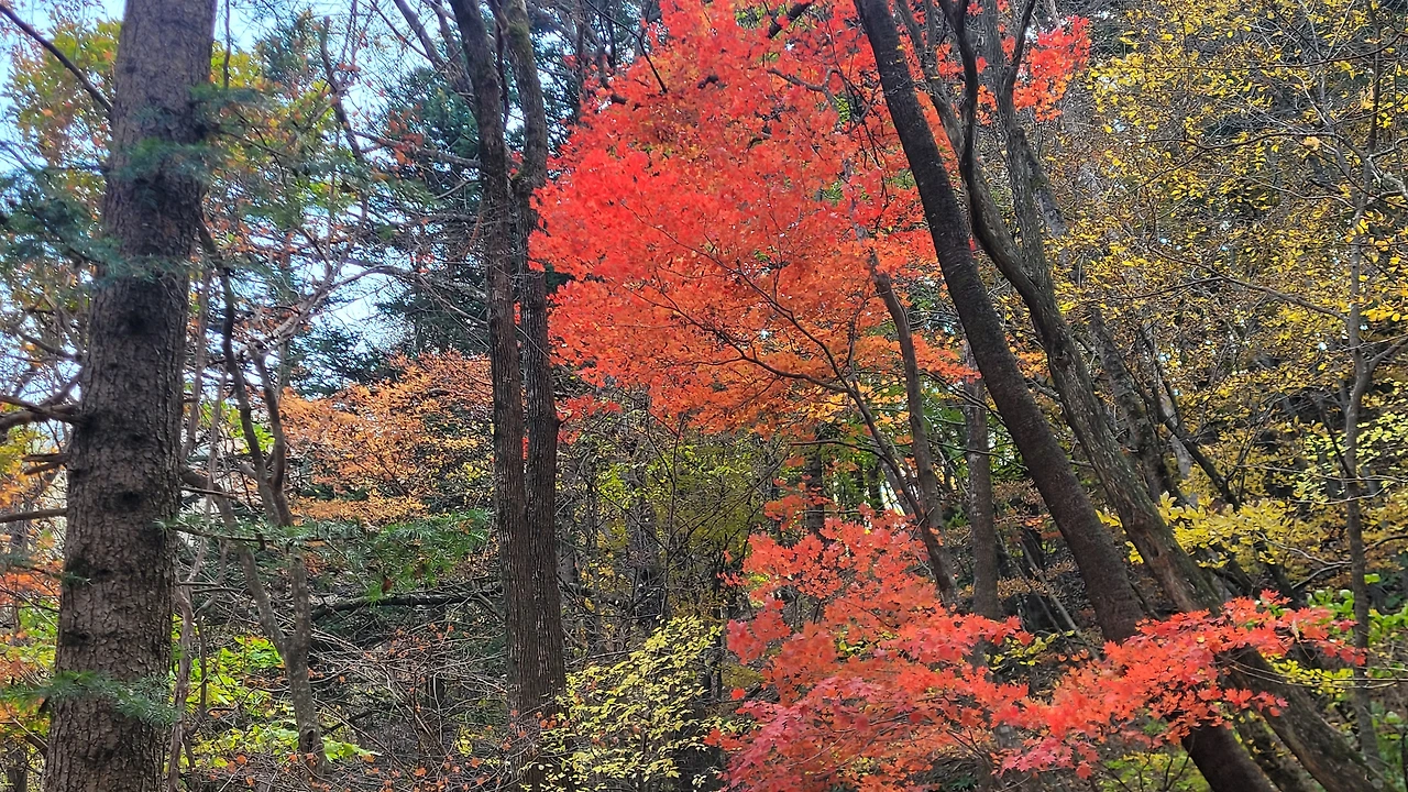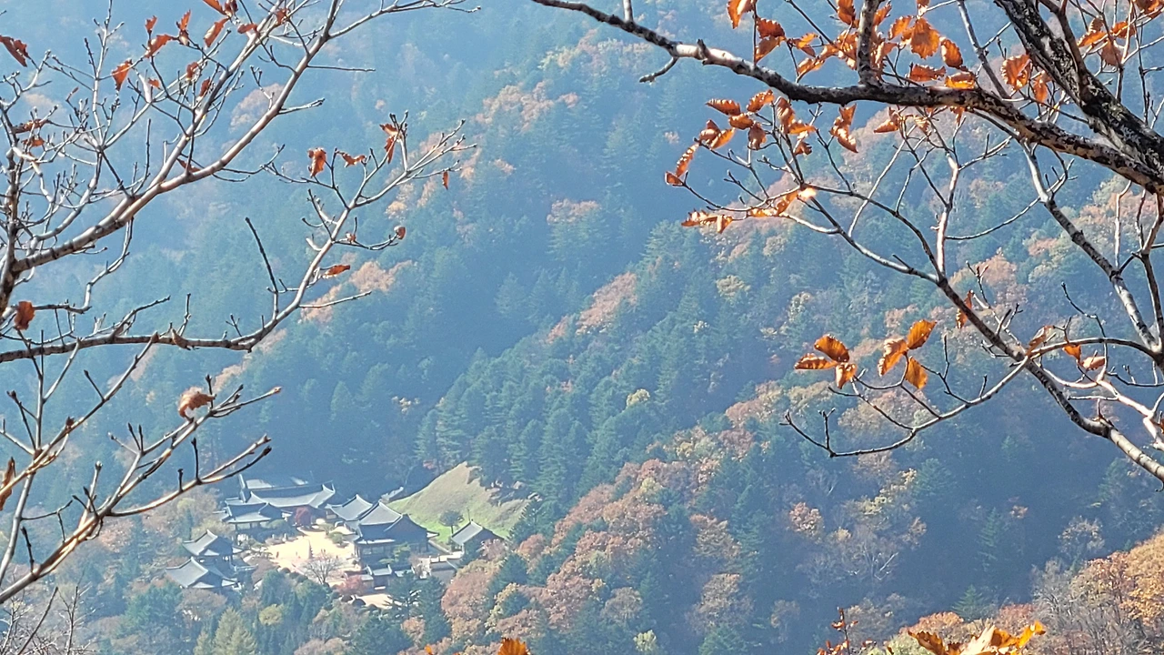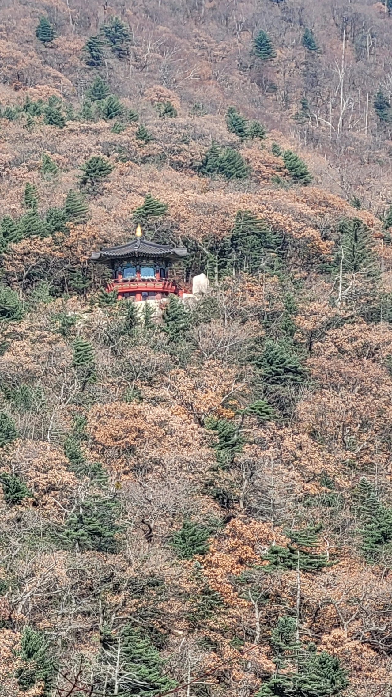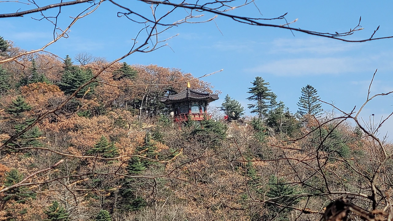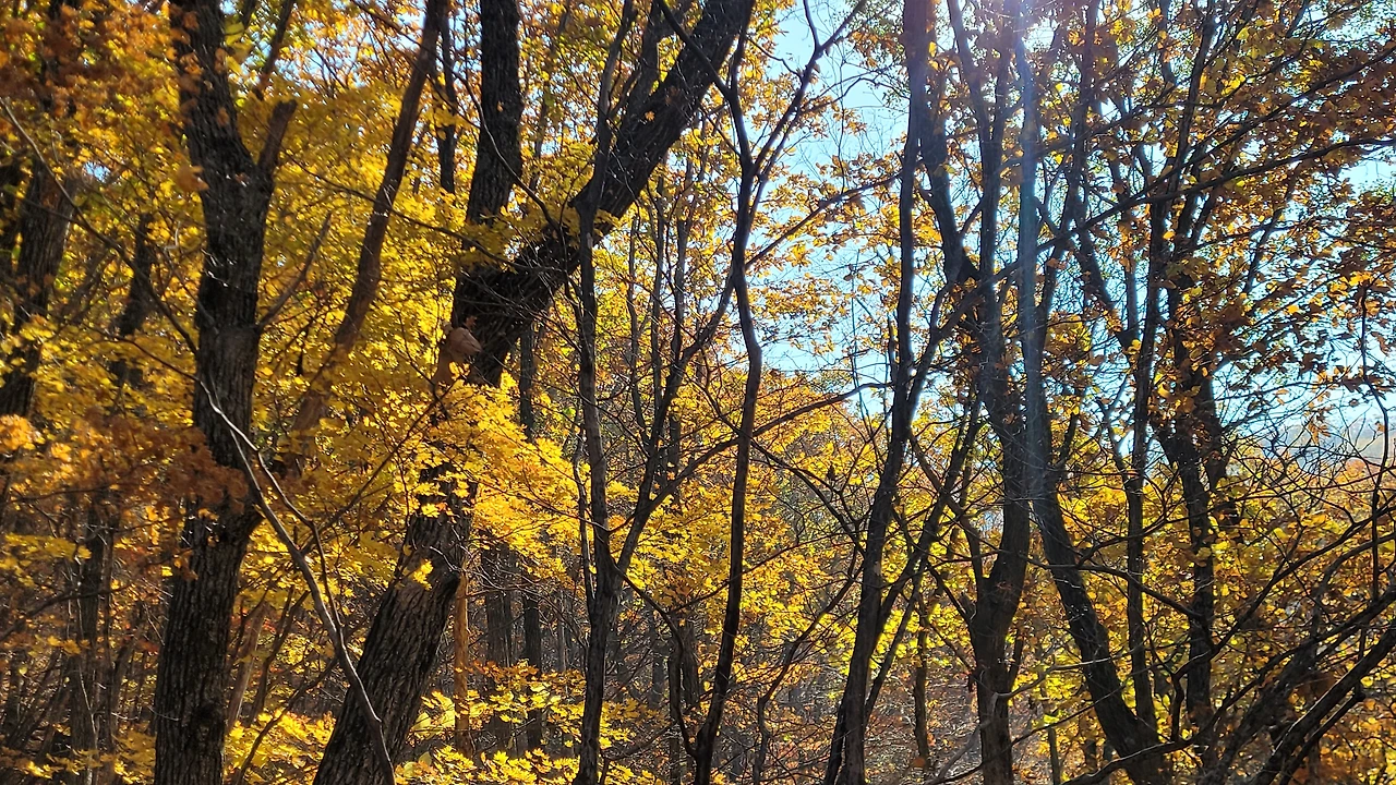 테크로 조성된 길은 상당히 가파르다. 숲의 나무들은 대다수 참나무 종류로 신갈나무와 갈참나무인데 잎들이 대부분 주황빛으로 물들었다. 빨간 단풍은 거의 눈에 띄지 않는다. 아쉽게도 올가을 단풍의 절정이 지난 듯 보인다.