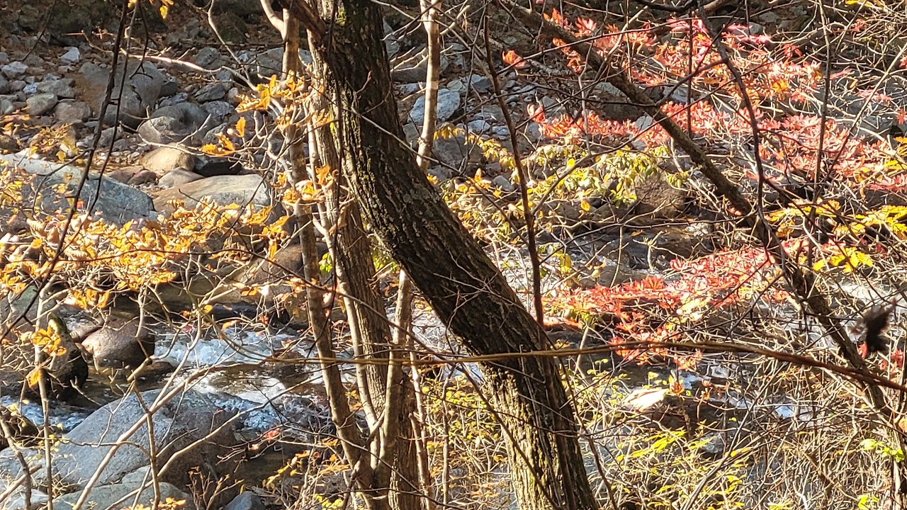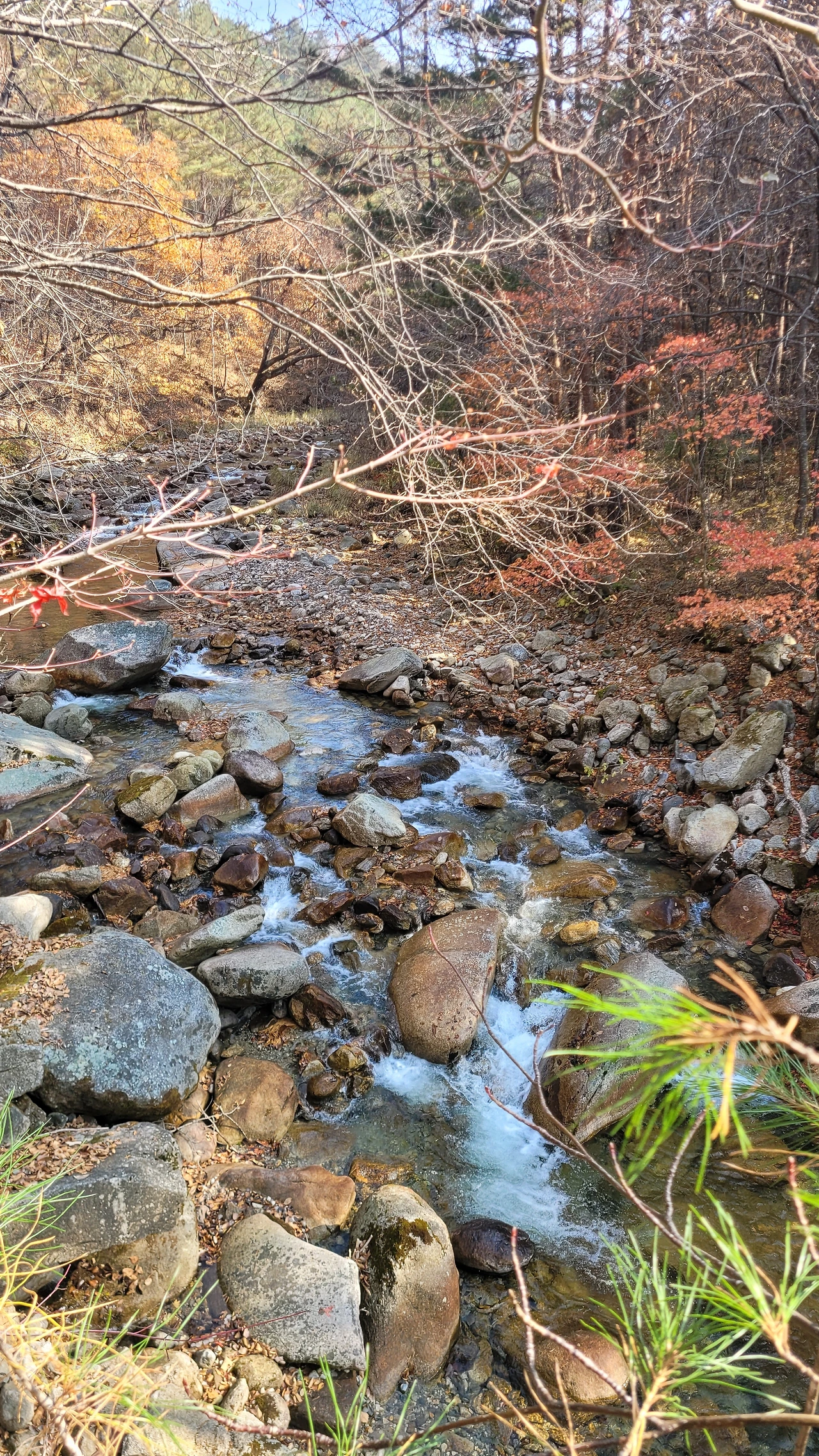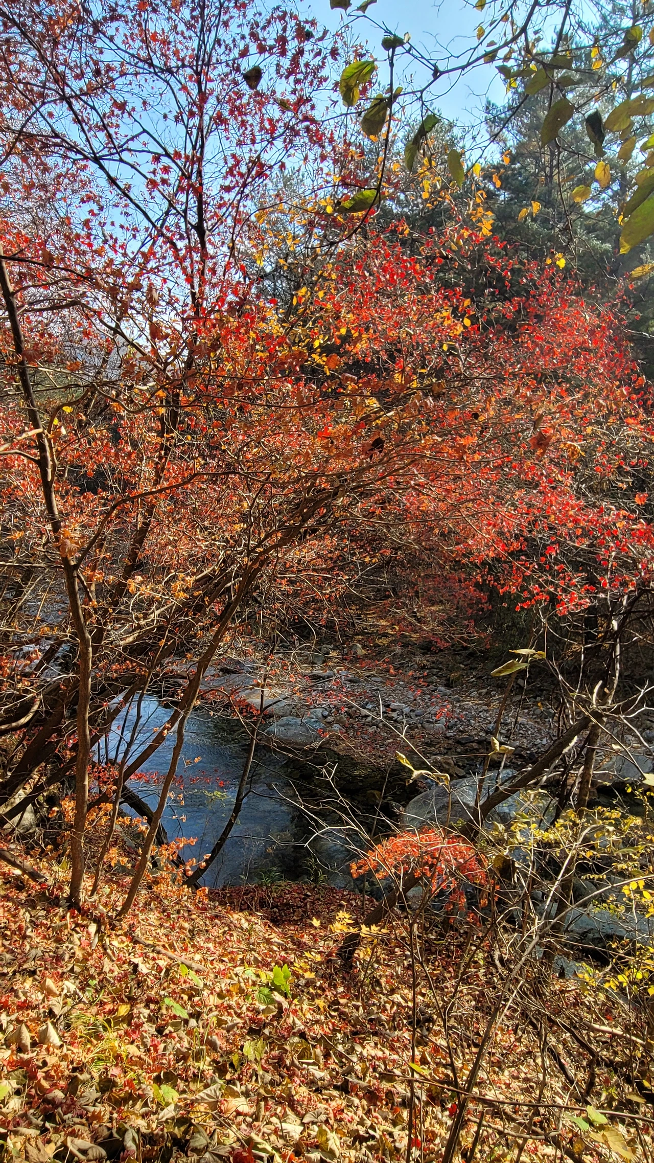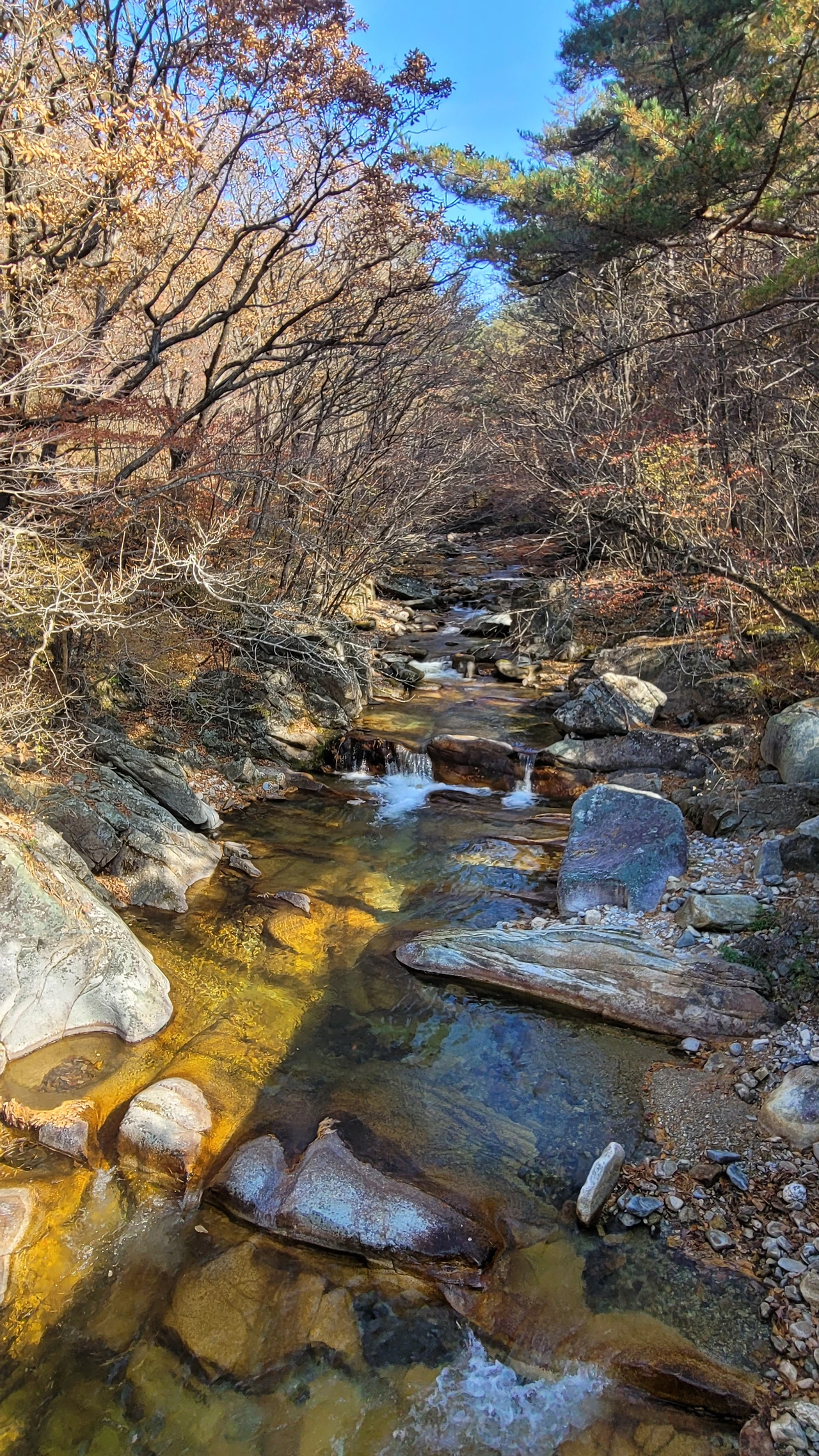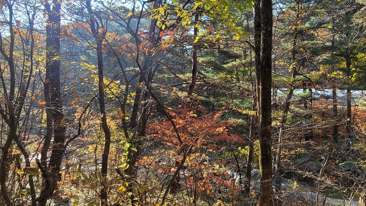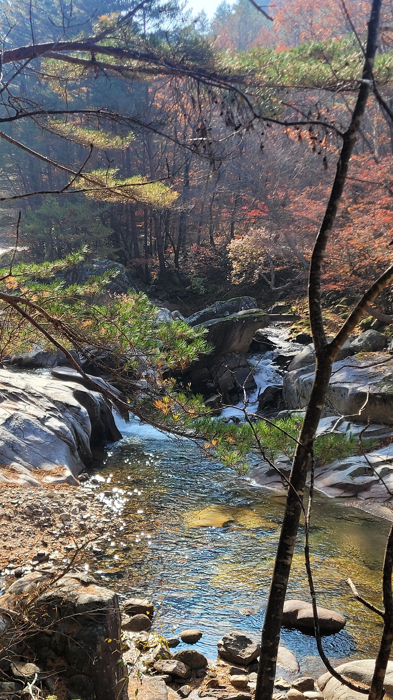 오르는 길 내내 계곡이 이어져 있다. 나무들이 우거져 숨은 계류가 시야가 확보되는 곳에서는 감추어둔 비경을 꺼내 보여준다. 물든 단풍이 어우러진 물길은 잘 그려놓은 풍경화 한 폭이다. 물 웅덩이에 아침햇살이 쏟아져 윤슬이 반짝대 가슴도 덩달아 뛴다. 시간이 허락한다면 그 자리에 머물러 오래도록 풍경과 물소리에 푹 젖고 싶다.