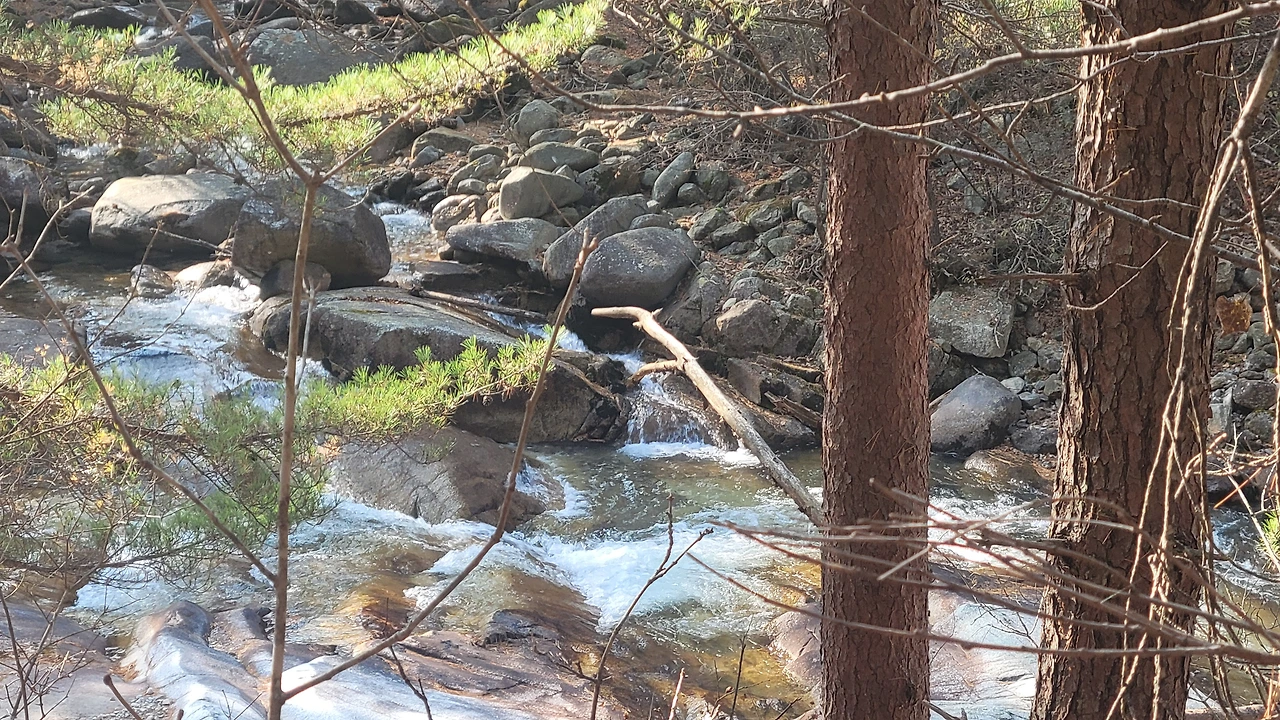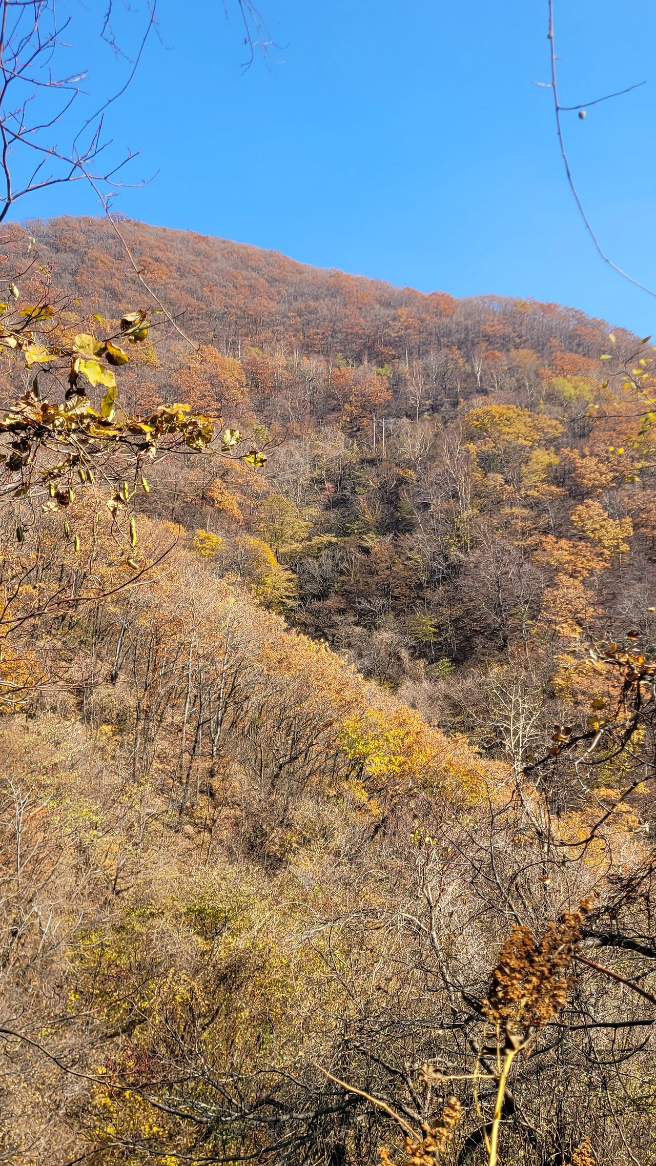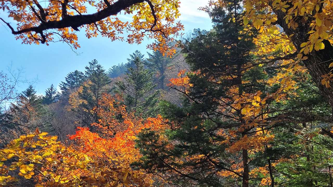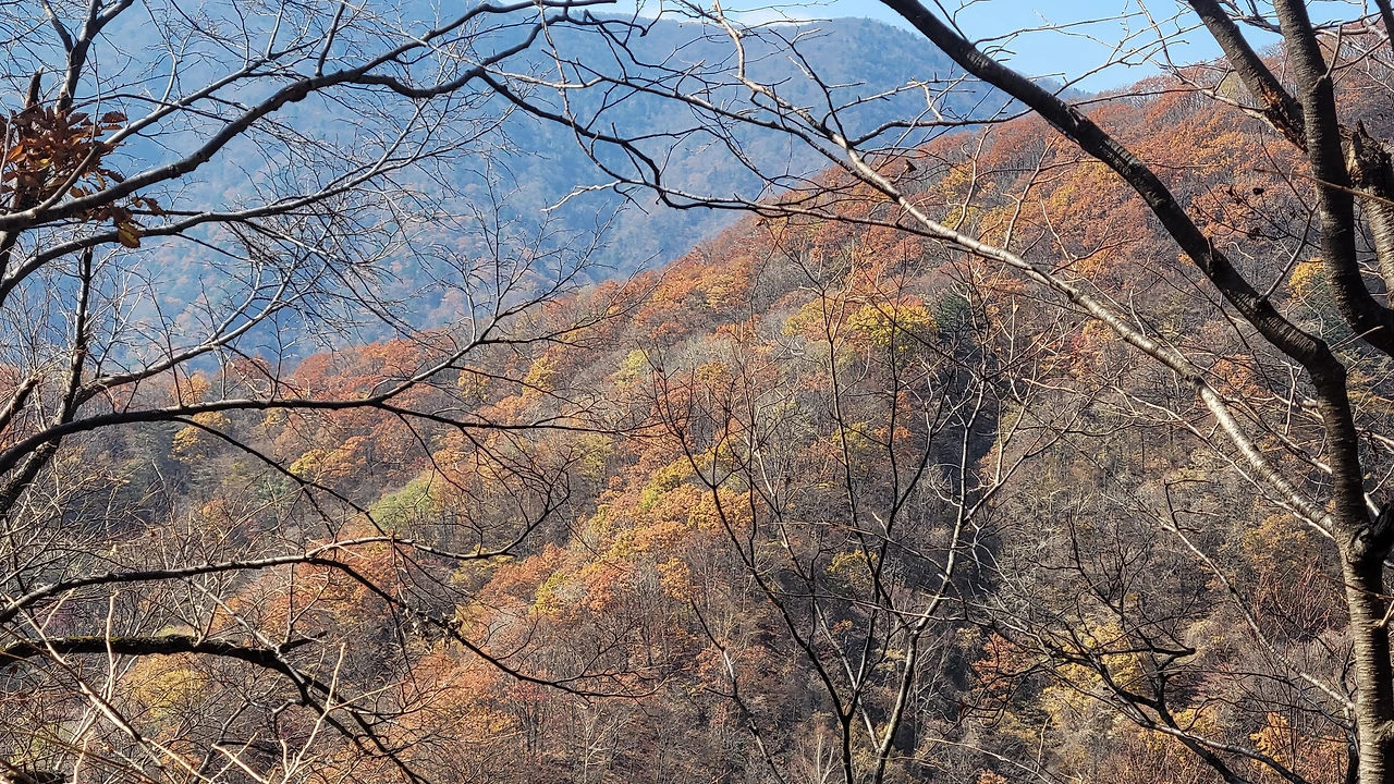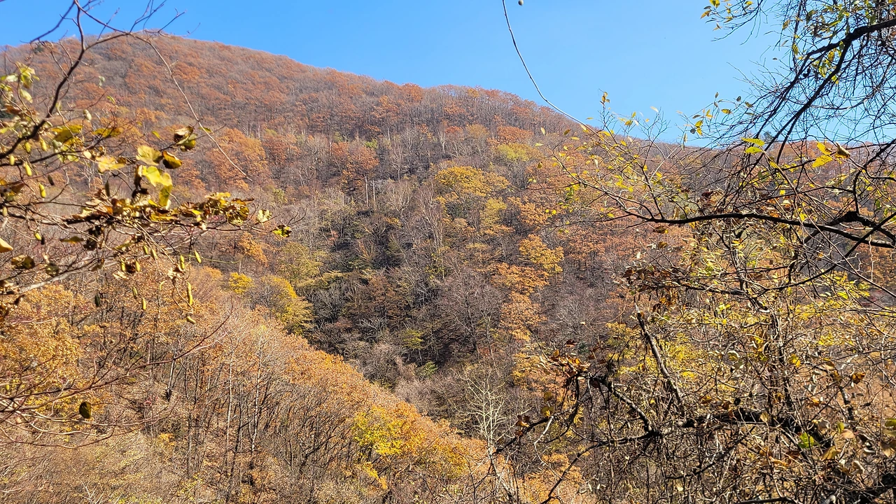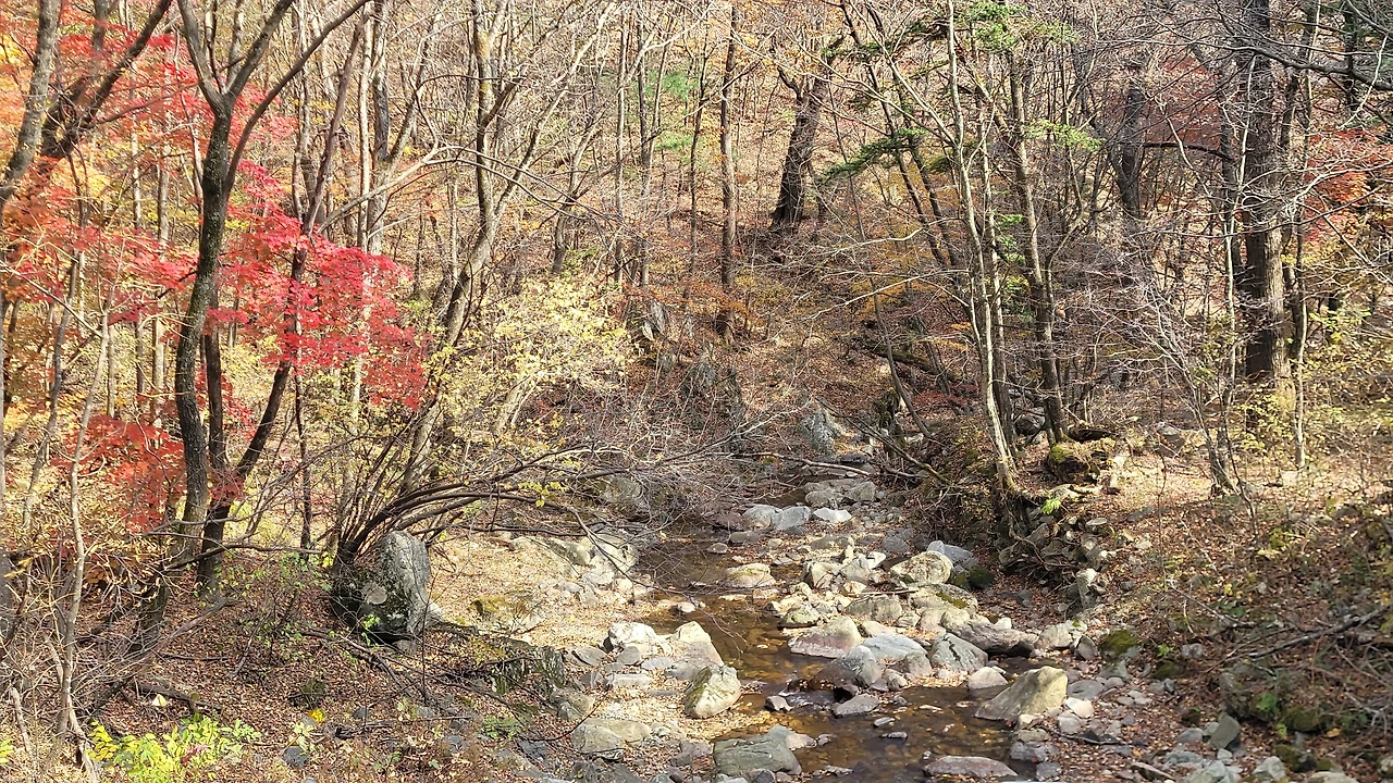 오르는 길 내내 계곡이 이어져 있다. 나무들이 우거져 숨은 계류가 시야가 확보되는 곳에서는 감추어둔 비경을 꺼내 보여준다. 물든 단풍이 어우러진 물길은 잘 그려놓은 풍경화 한 폭이다. 물 웅덩이에 아침햇살이 쏟아져 윤슬이 반짝대 가슴도 덩달아 뛴다. 시간이 허락한다면 그 자리에 머물러 오래도록 풍경과 물소리에 푹 젖고 싶다.