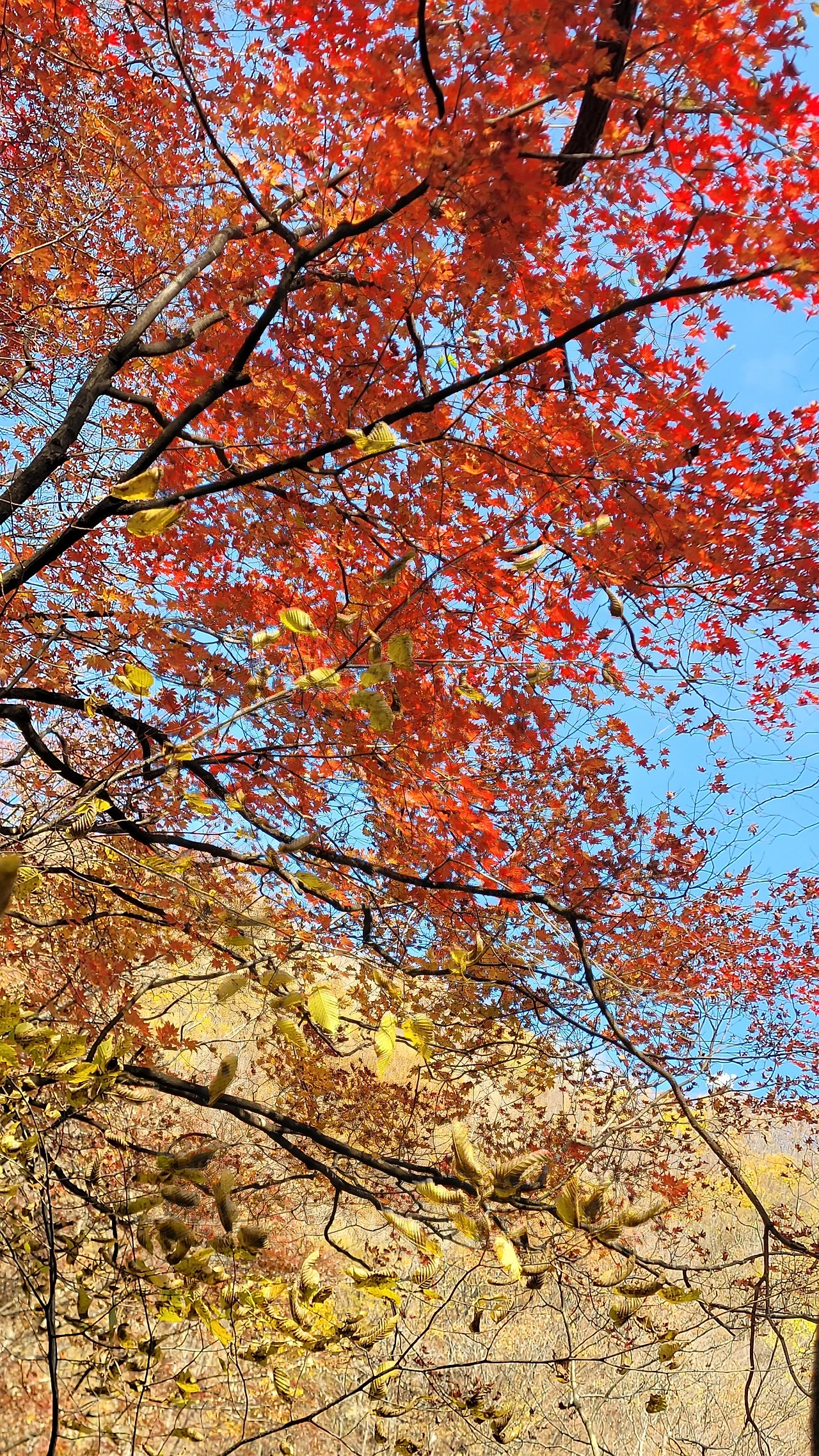 상원사 가까이 내려가는 길에서 붉은 단풍을 만난다. 높은 곳의 단풍은 지고 고도가 낮은 곳은 한창인 것이다. 제대로 된 단풍에 들뜸과 반가움이 교차된다.