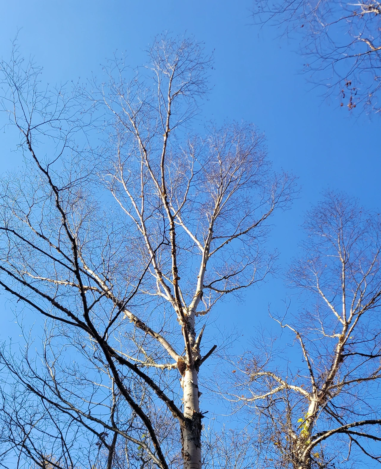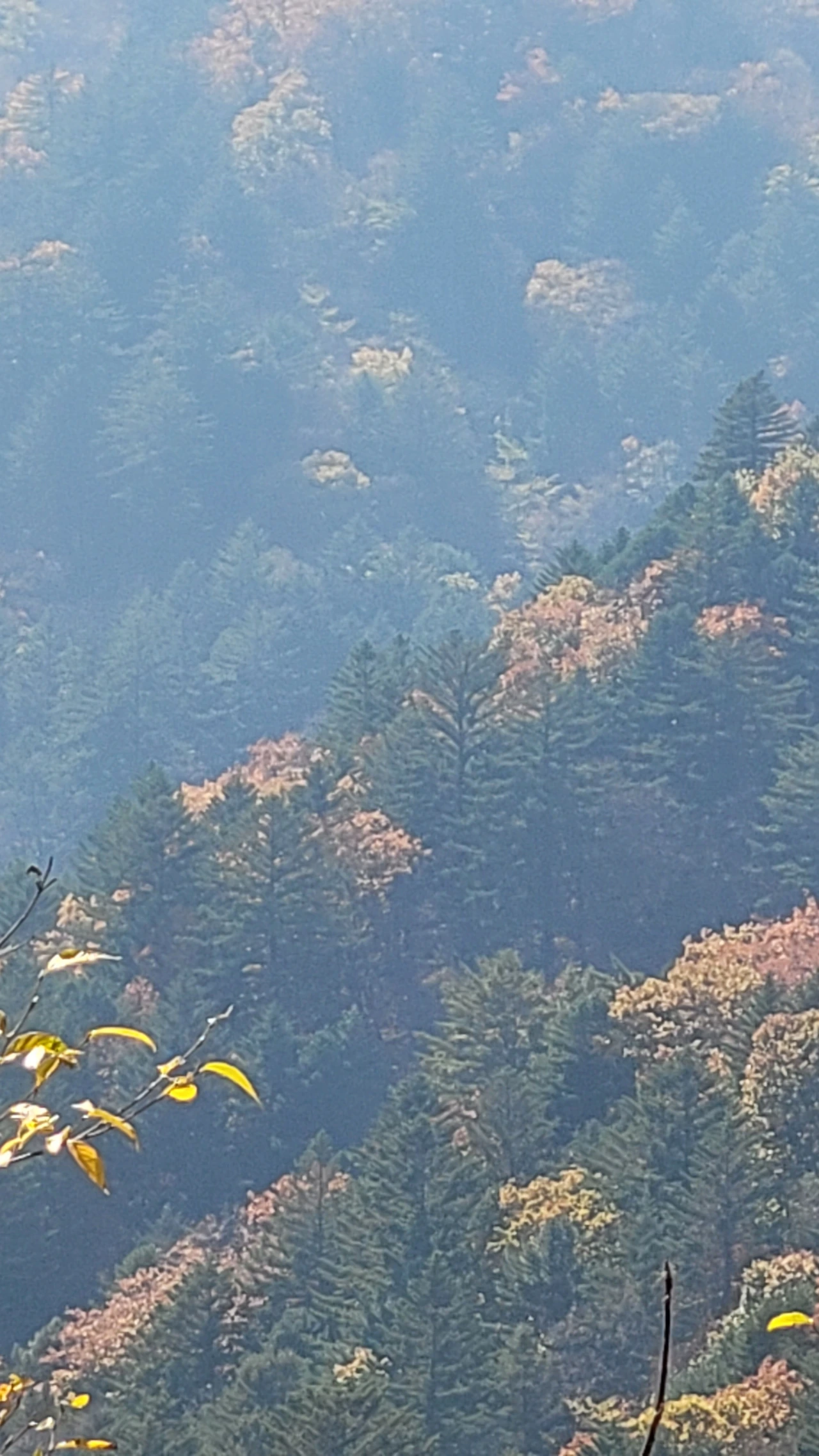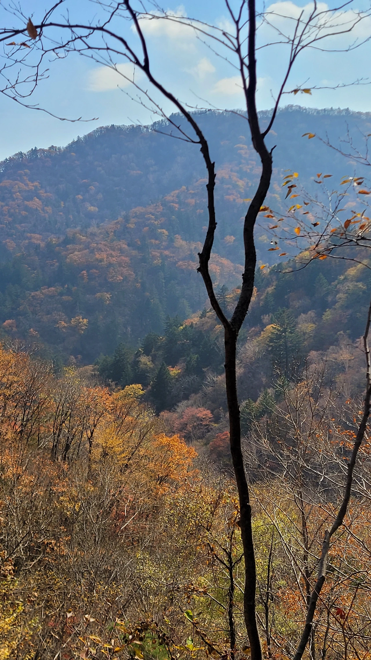 도중에 나옹대로 빠져 만족스러운 조망은 아니지만 막힘없는 전망을 보며 조금은 필요를 채울 수 있었다. 오대산이 여타 산과 다른 점은 전나무가 자생한다는 점이다. 참나무가 주황빛 단풍으로 물들 때 그 사이로 늘 푸른 전나무가 섞여 색의 대비를 이룬다.거기에 더하여 자작나무도 자리를 잡고 새하얀 수피로 특별한 경치를 만든다.