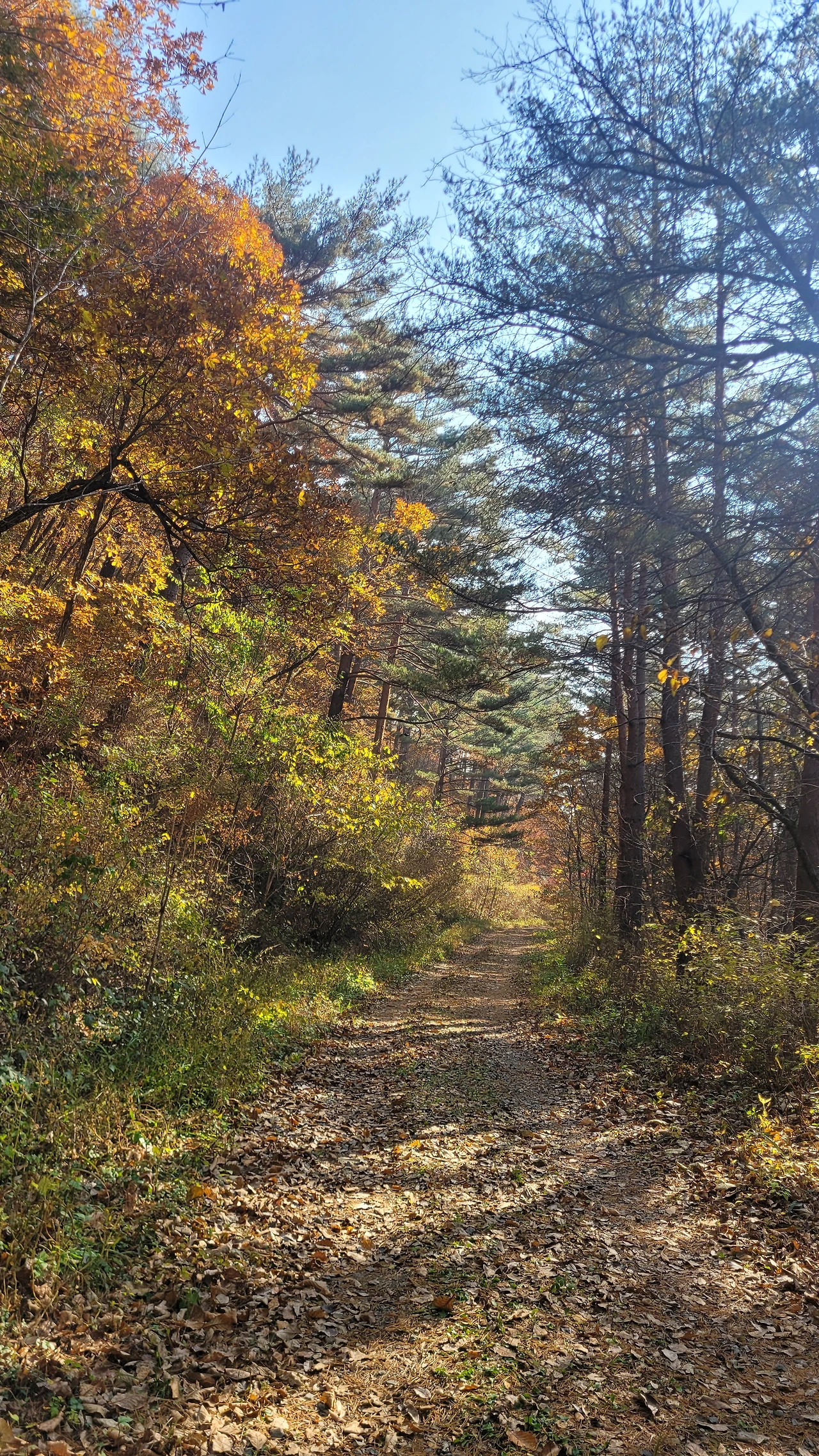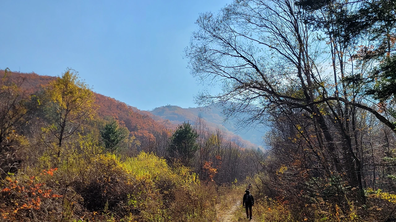 걷기의 출발점이 임도라 길이 넓어서 걷기가 편하다. 길가에는 벌써 잎들을 떨군 나무들이 많이 보인다. 일행들과 같이 가는 길이지만 자연의 친구들이 동행하며 함께 걷는다. 계곡의 시원한 물소리가 하나고 발걸음마다 바스락 거리는 낙엽 소리가 나머지 주인공이다.