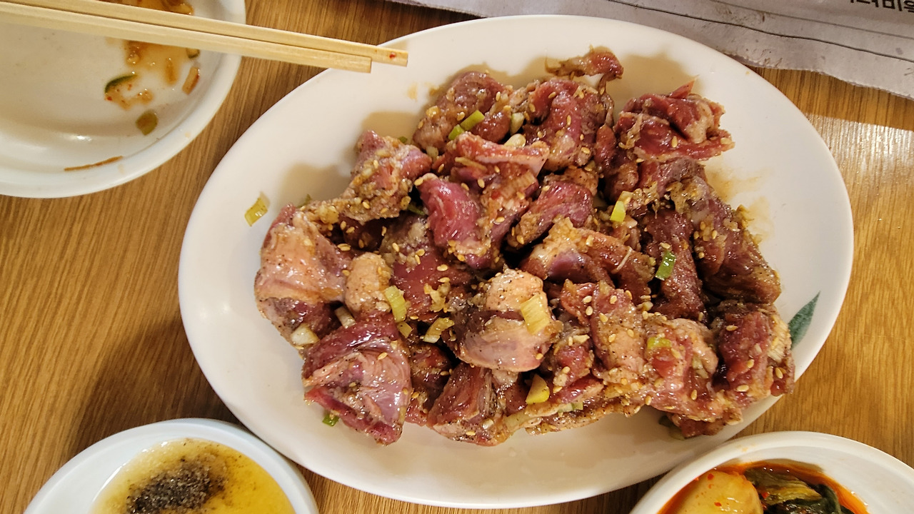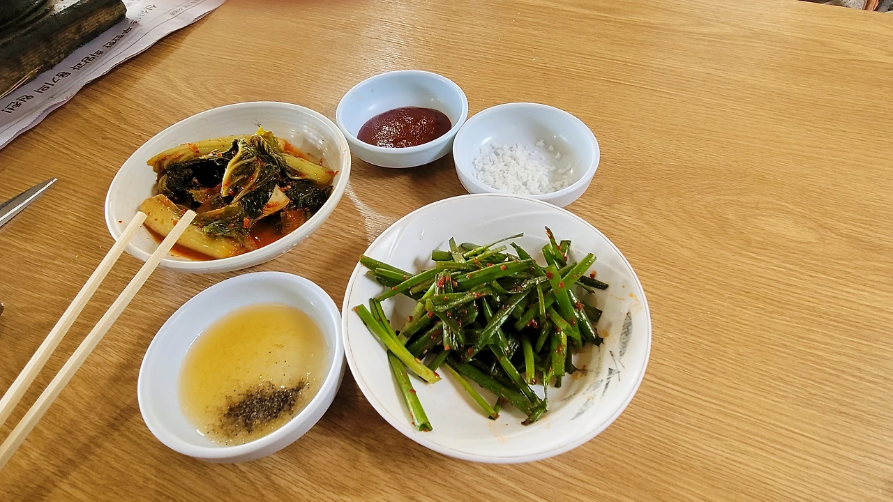 기본 찬이 나왔다. 얼갈이배추김치와 쪽파무침에 기름장과 고추장 그리고 마늘이 전부인 소박한 구성이었다. 주문은 양념 갈매기살을 시켰는데 고기가 모자라 부득이하게 1인당 1인분만 시킬 수 있었다. 마음에 차지는 않았지만 그만큼 귀한 고기를 맛보는 것이라는 생각에 더 큰 기대를 가졌다. 그리고 도토리묵과 손두부 그리고 순두부도 있어서 함께 주문하려 했더니 두부는 1시간이 지나야 된다고 해서 도토리묵만 시켰다. 쪽파무침을 먹어보니 질박한 모습과 다르게 입맛을 끌었다. 얼갈이배추김치도 그랬다. 도토리묵도 오이와 상추가 들어간 묵무침이 아니라 묵만 덩그러니 담은 접시와 양념장이 전부였다. 단순한 음식이었지만 맛은 단순하지 않았다.
