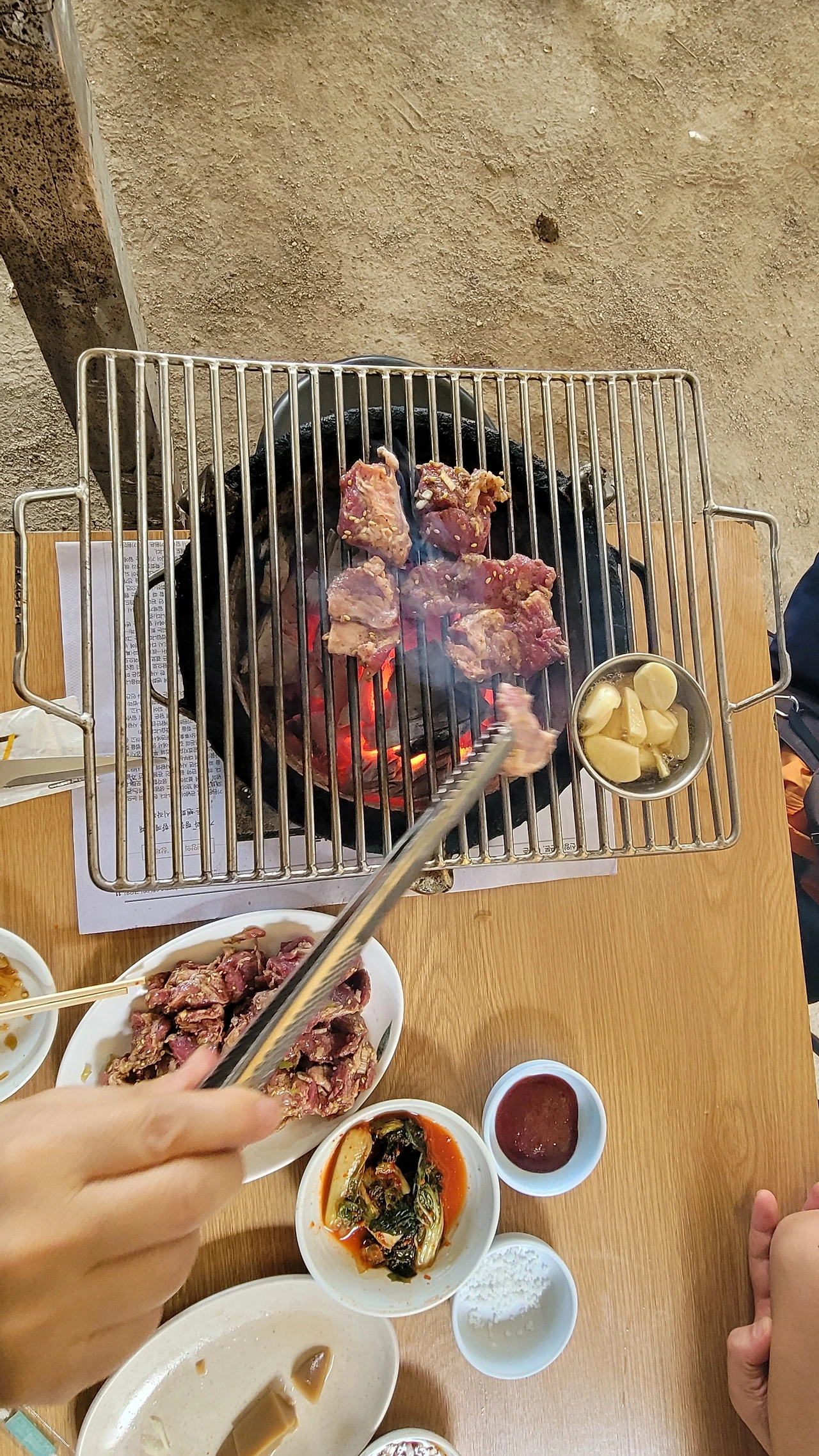 가장 특이한 것은 고기를 굽는 화로였다. 일본에서 고기를 구워 먹을 때 나오는 1인용 보다는 더 큰 화로에 참숯으로 불이 붙어 있었다. 여기에 석쇠를 얹어 고기를 구워 먹는 것이다. 옛날 양반들이 탁족을 즐기며 맥적을 구워 먹는 기분이 들었다. 마침내 양념한 갈매기살이 나왔다. 접시에 담긴 고기가 보기에도 특별했다. 윤기가 흐르고 양념 옷을 적당히 입어 영롱한 고기의 자태가 군침을 돌게 했다.