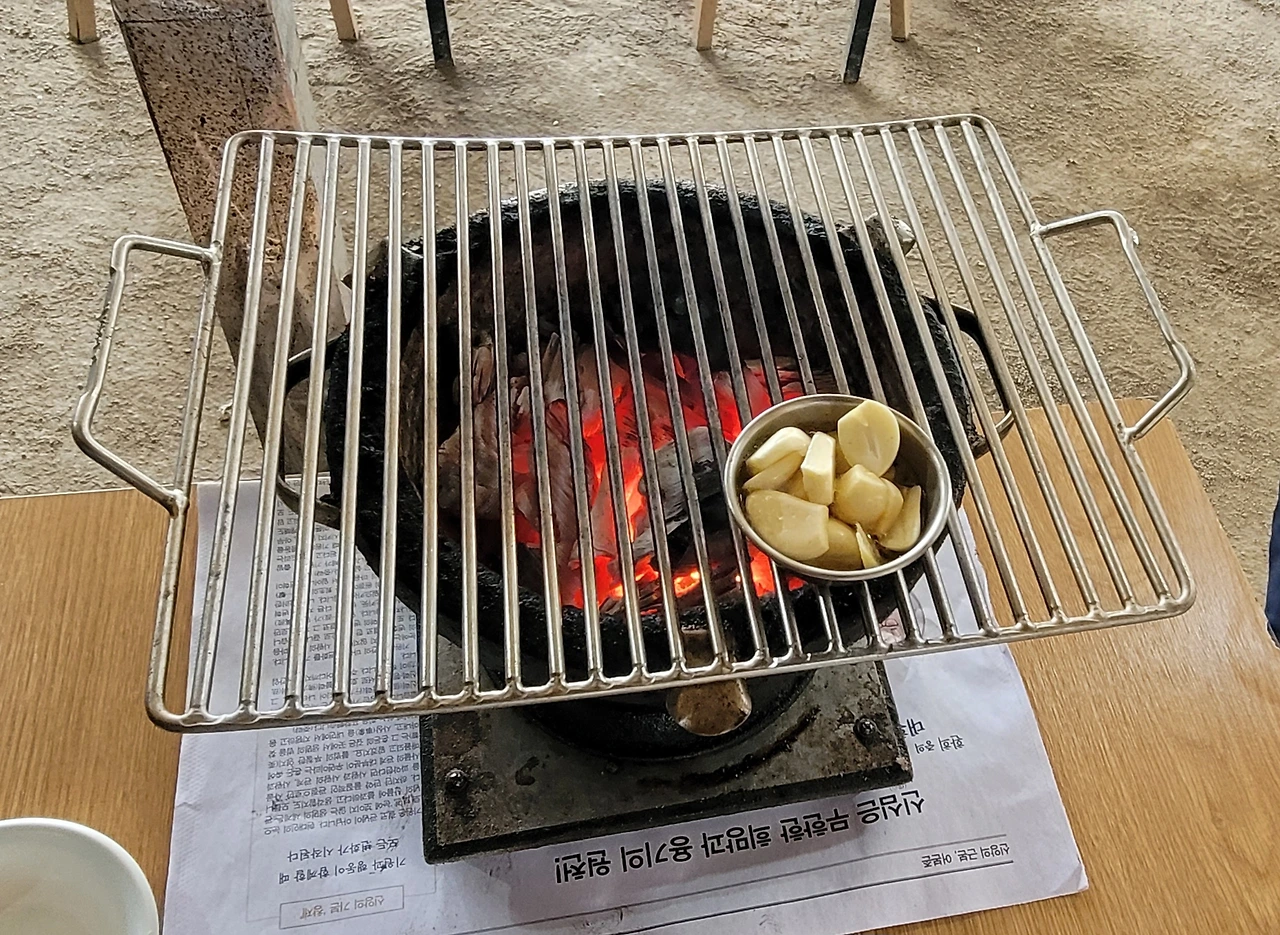 이곳은 국립공원 안에 있는 사유지라고 한다. 12시가 되기 전에 갔음에도 식당의 외양과 다르게 이미 대기고객이 세 팀이나 있었다. 식사하는 장소는 간이 천막이었고 좌석도 많지 않았다. 눈길을 끄는 또 다른 한 가지는 두부를 직접 만들고 있는 장면이었다. 커다란 아궁이가 걸린 솥에 콩물을 삶는 중이었다. 거기에 산악 운반용 지게도 서있어서 여러모로 흥미를 끄는 식당이었다.