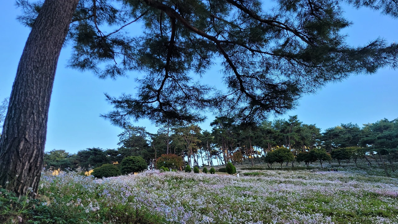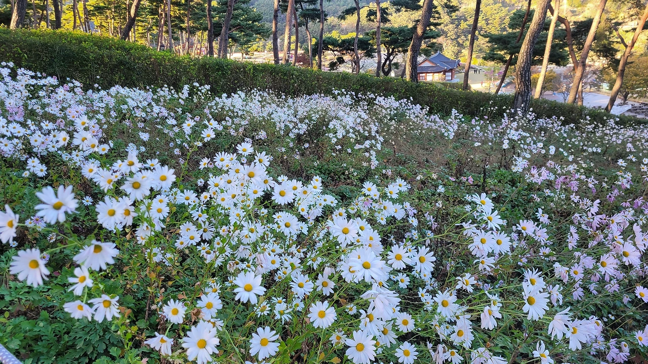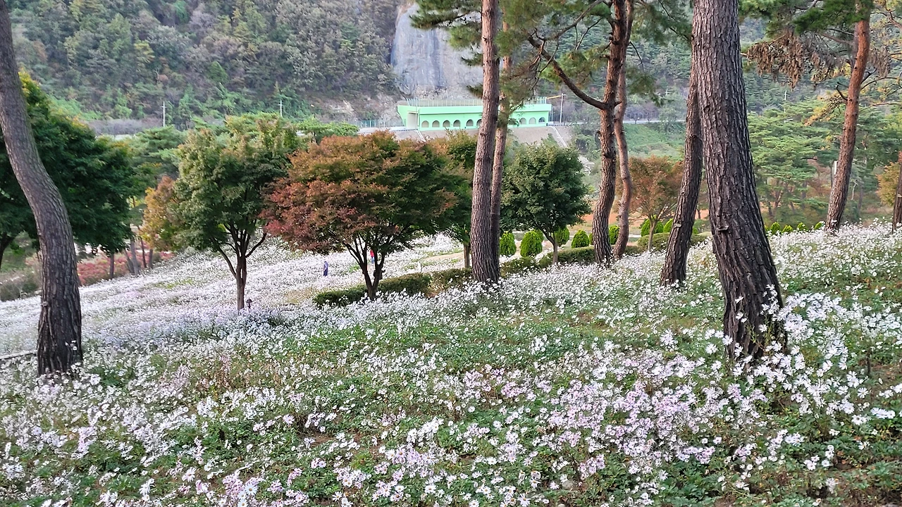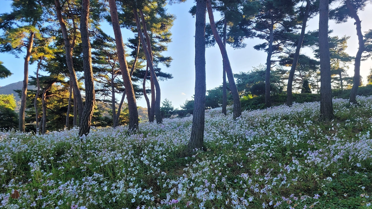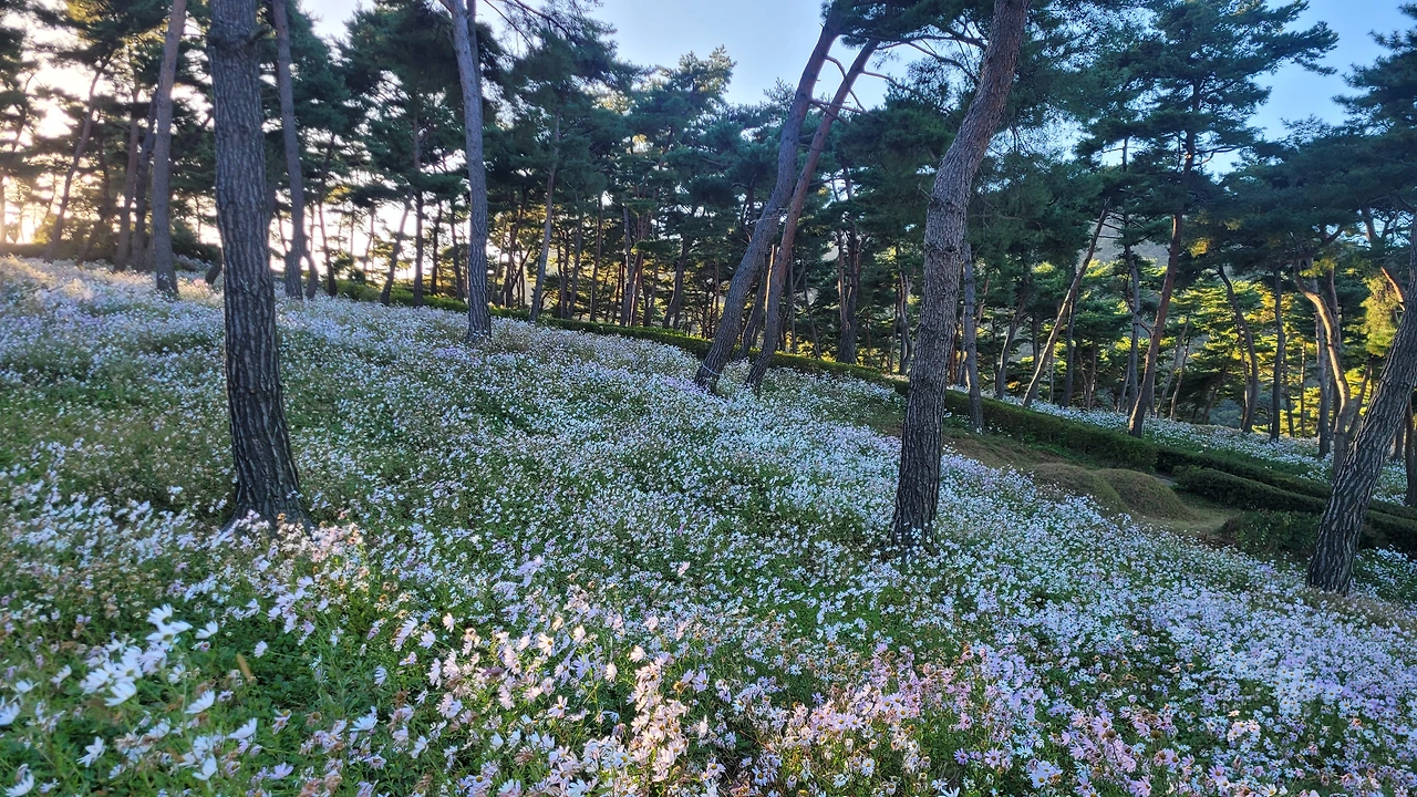 입구에 있는 전망대를 단숨에 올라갔다. 자태가 수려한 소나무들이 자라는 숲자락을 온통 구절초 꽃들이 뒤덮고 있었다. 해가 기우는 시각이어서 산에는 그늘이 드리웠지만 순백의 꽃빛은 오히려 더 선명해 보였다. 이효석의 메밀꽃 필 무렵 묘사처럼 비록 달빛은 없어도 흐드러진 꽃들에 '숨이 막힐 지경'이었다.