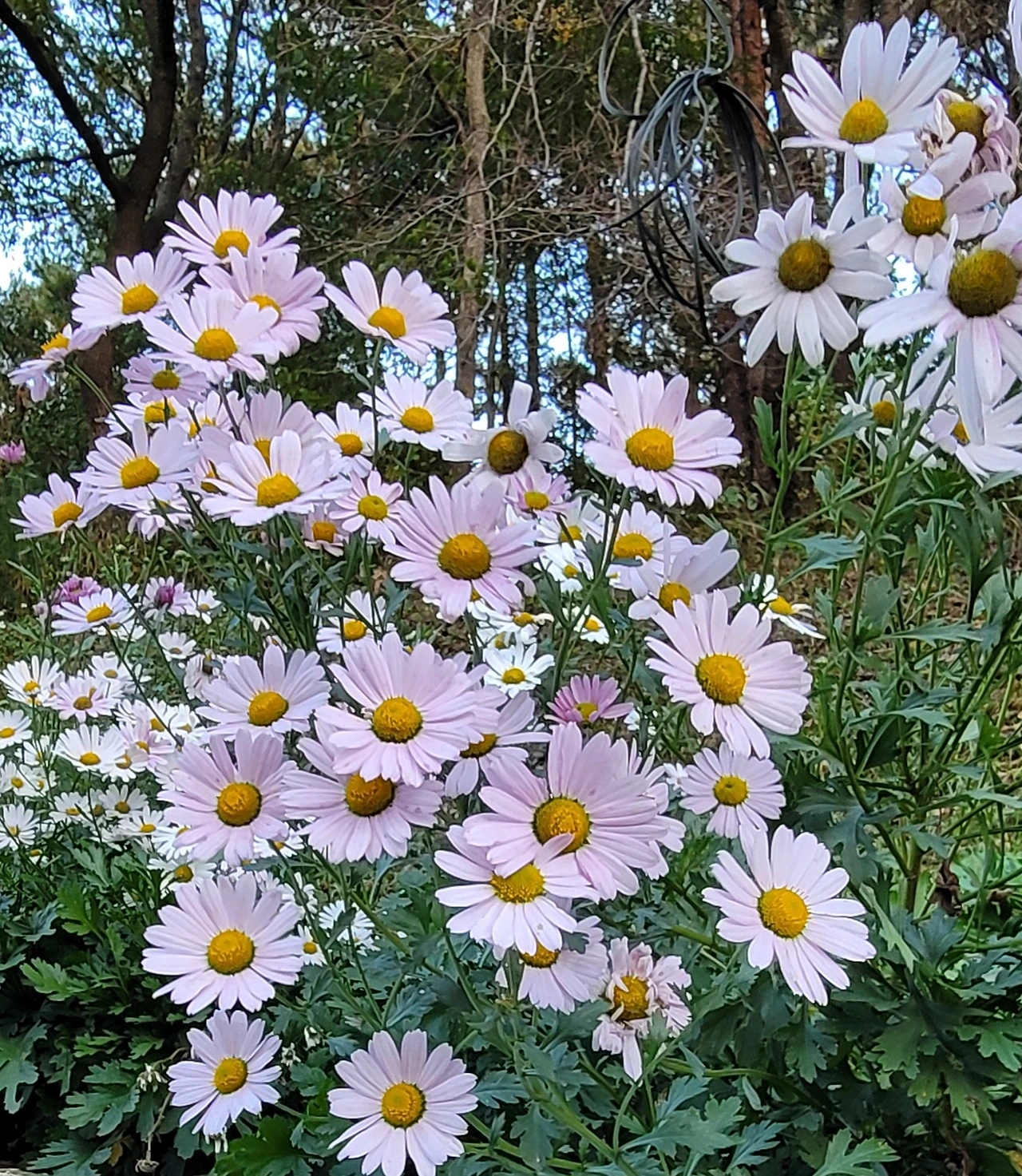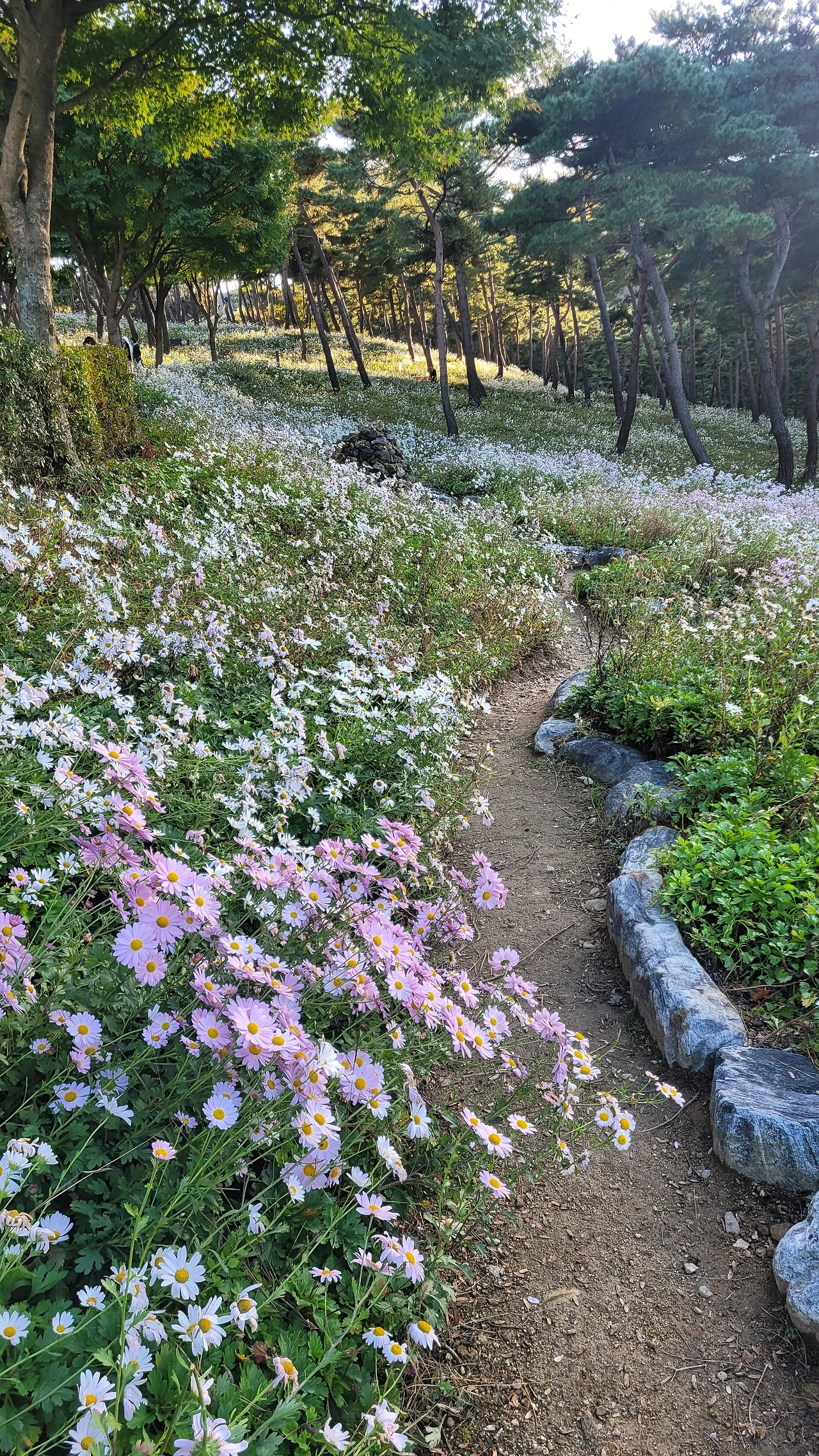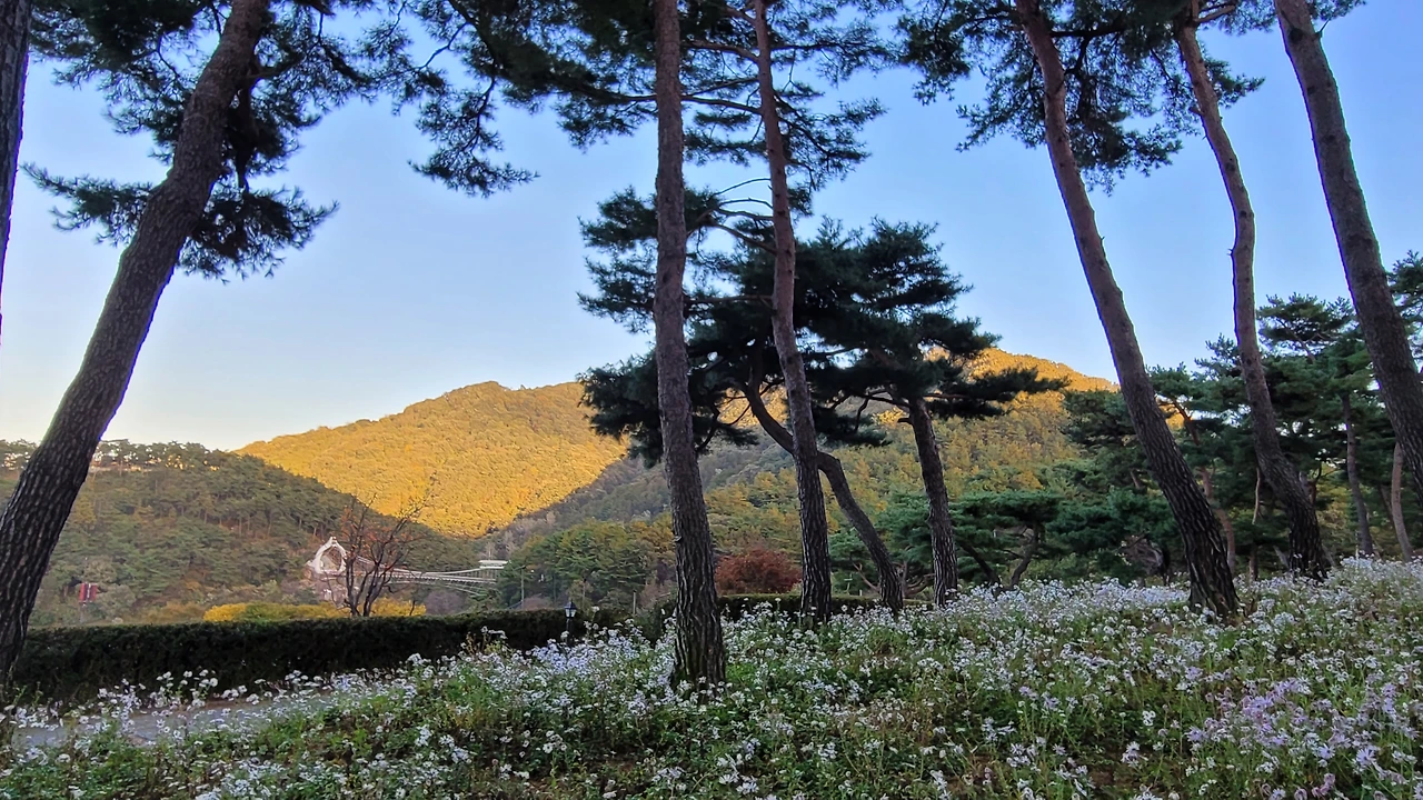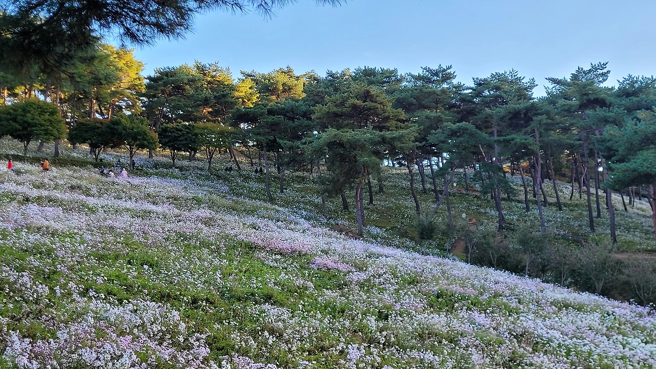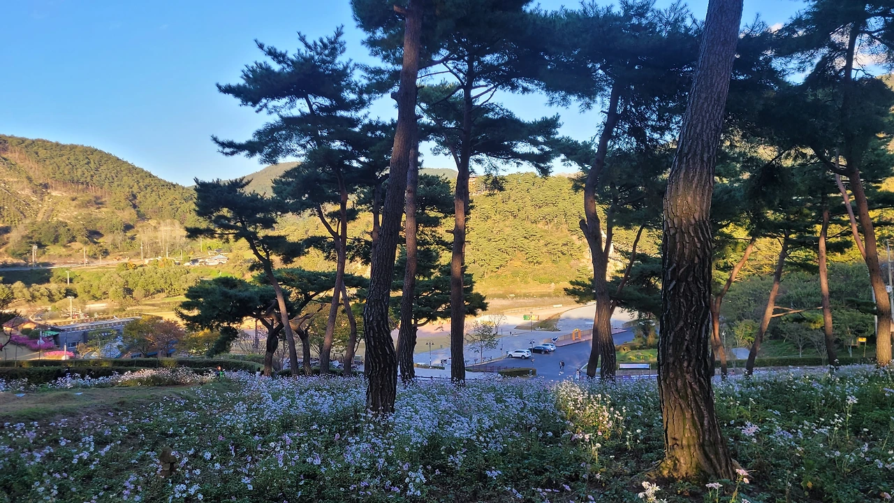 입구에 있는 전망대를 단숨에 올라갔다. 자태가 수려한 소나무들이 자라는 숲자락을 온통 구절초 꽃들이 뒤덮고 있었다. 해가 기우는 시각이어서 산에는 그늘이 드리웠지만 순백의 꽃빛은 오히려 더 선명해 보였다. 이효석의 메밀꽃 필 무렵 묘사처럼 비록 달빛은 없어도 흐드러진 꽃들에 '숨이 막힐 지경'이었다.