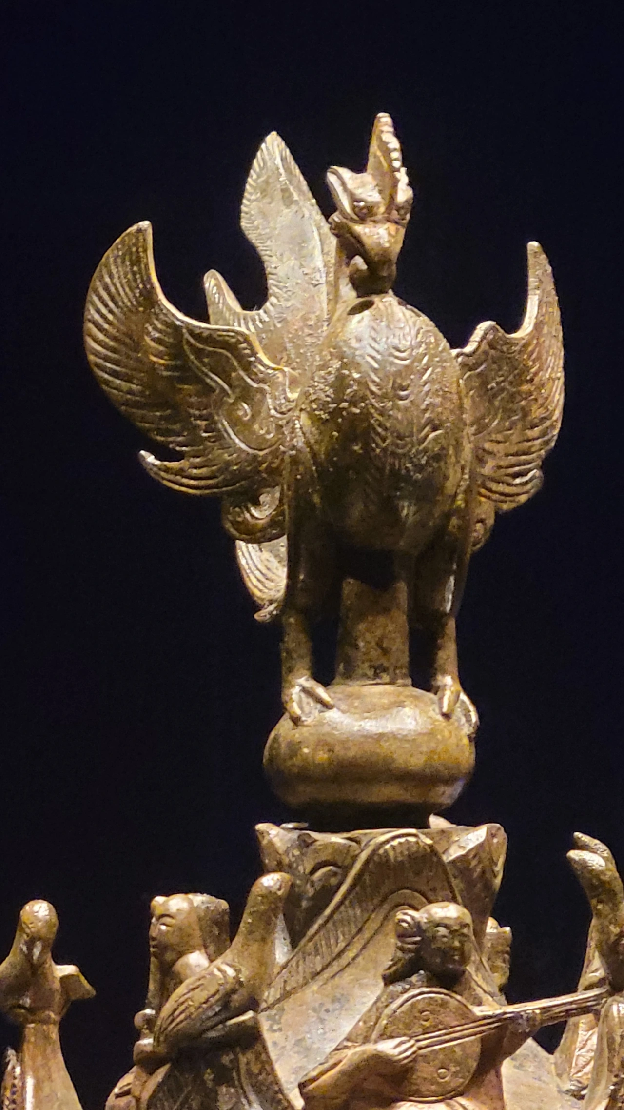 백제금동대향로는 멀리서 보면 불꽃이 타오르는 이미지가 연상된다. 응집한 불꽃이 하늘로 솟구치는 순간을 보는 듯하다. 가까이에서 보면 느낌이 달라진다. 화려하게 활짝 핀 한 떨기 꽃이다. 하단부부터 생동감이 넘친다. 다섯 발톱을 지닌 용이 물을 차고 비상하는 웅혼함의 기세가 대단하다. 안정감을 부여하면서도 용틀임 속에서 뿜어져 나오는 기운이 힘차다. 위로는 벌어진 연꽃잎들이 산을 이루며 피어나는 빼어난 자태도 견줄 수 없는 아름다움을 보여준다. 꽃잎 하나하나에 새겨진 문양들도 다채롭다. 하나하나 독특하고 신비롭다. 정상의 악기 연주자들은 천상의 음악을 들려주는 듯하다. 화룡점정으로 꼭대기에 앉은 봉황은 도도하면서 우아하다.