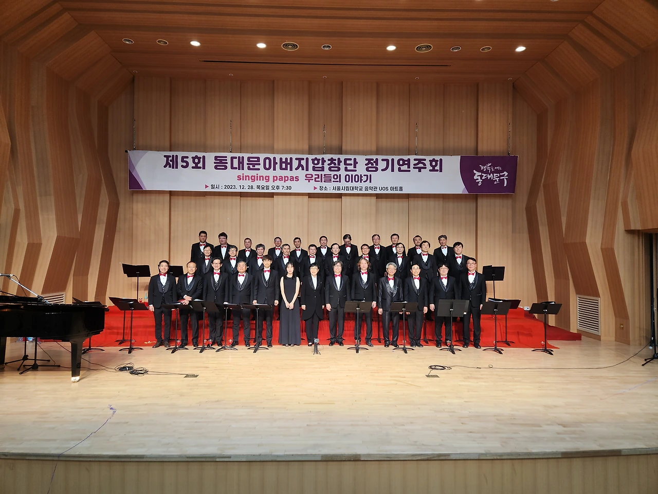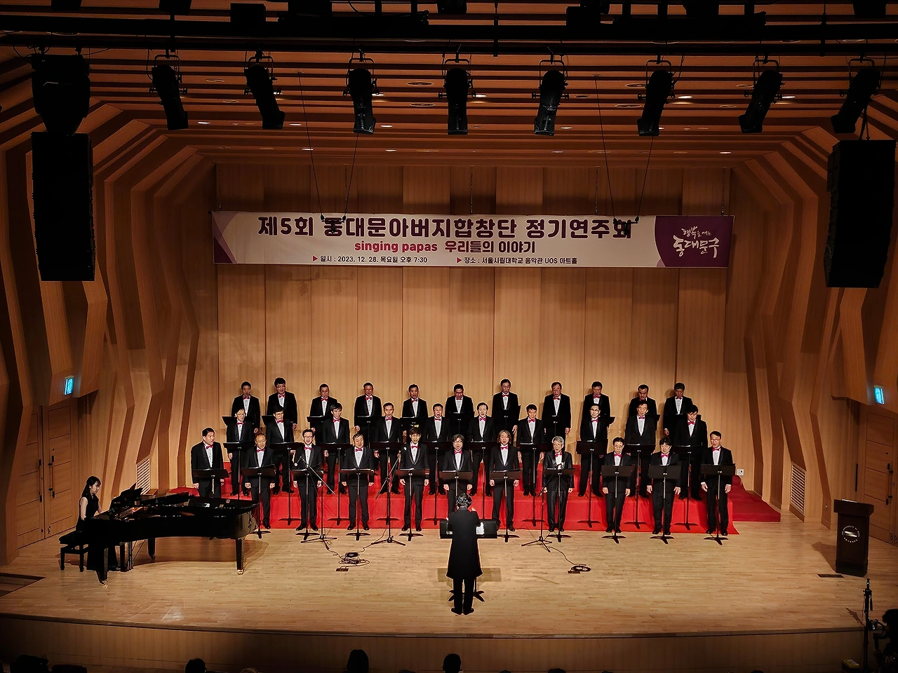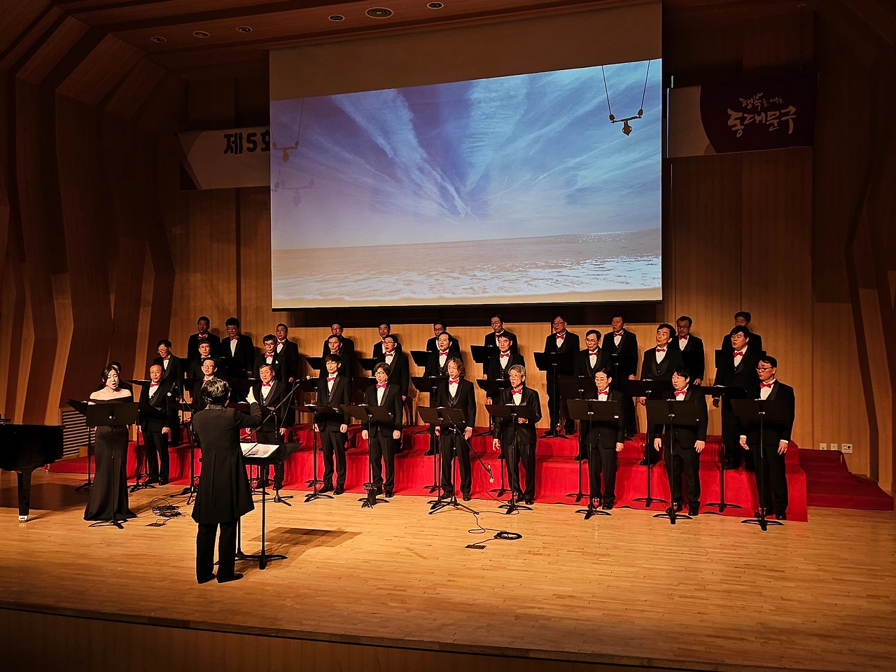 지휘자님을 비롯해 단원들이 속속 도착했다. 반갑게 인사를 나누며 빨간 넥타이를 매주기도 하면서 복장을 서로 다듬어 준다. 하나같이 근사한 모습이다. 바로 리허설에 들어갔다. 그간 갈고닦았던 노래를 정식 무대에서 복장을 완전히 갖추고 하게 되어 가벼운 흥분이 인다. 32명이 모인 꽉 찬 무대다. 한 곡 한곡을 부를 때마다 지휘자님은 엄지 척이다. 격려가 힘이 된다. 이에 자신감이 더해져 단원들은 노래에 더욱몰입이 깊어진다.