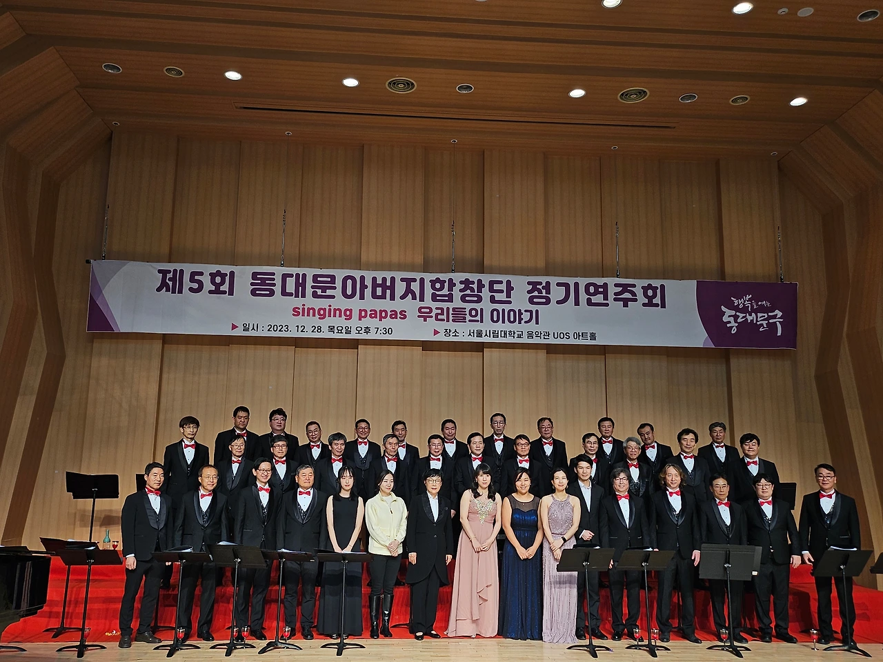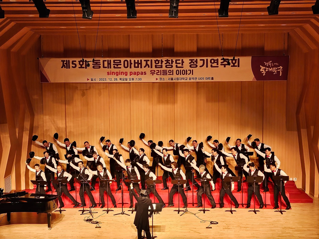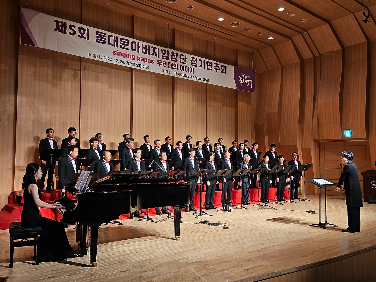 지휘자님을 비롯해 단원들이 속속 도착했다. 반갑게 인사를 나누며 빨간 넥타이를 매주기도 하면서 복장을 서로 다듬어 준다. 하나같이 근사한 모습이다. 바로 리허설에 들어갔다. 그간 갈고닦았던 노래를 정식 무대에서 복장을 완전히 갖추고 하게 되어 가벼운 흥분이 인다. 32명이 모인 꽉 찬 무대다. 한 곡 한곡을 부를 때마다 지휘자님은 엄지 척이다. 격려가 힘이 된다. 이에 자신감이 더해져 단원들은 노래에 더욱몰입이 깊어진다.