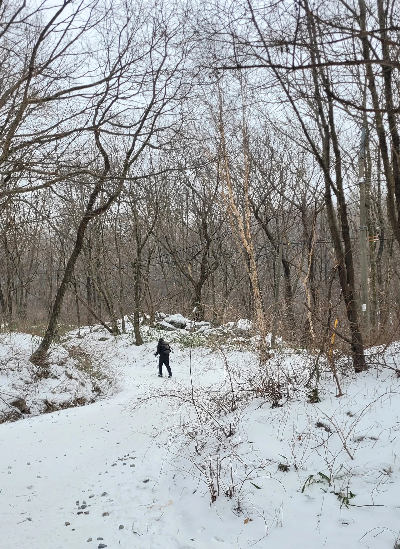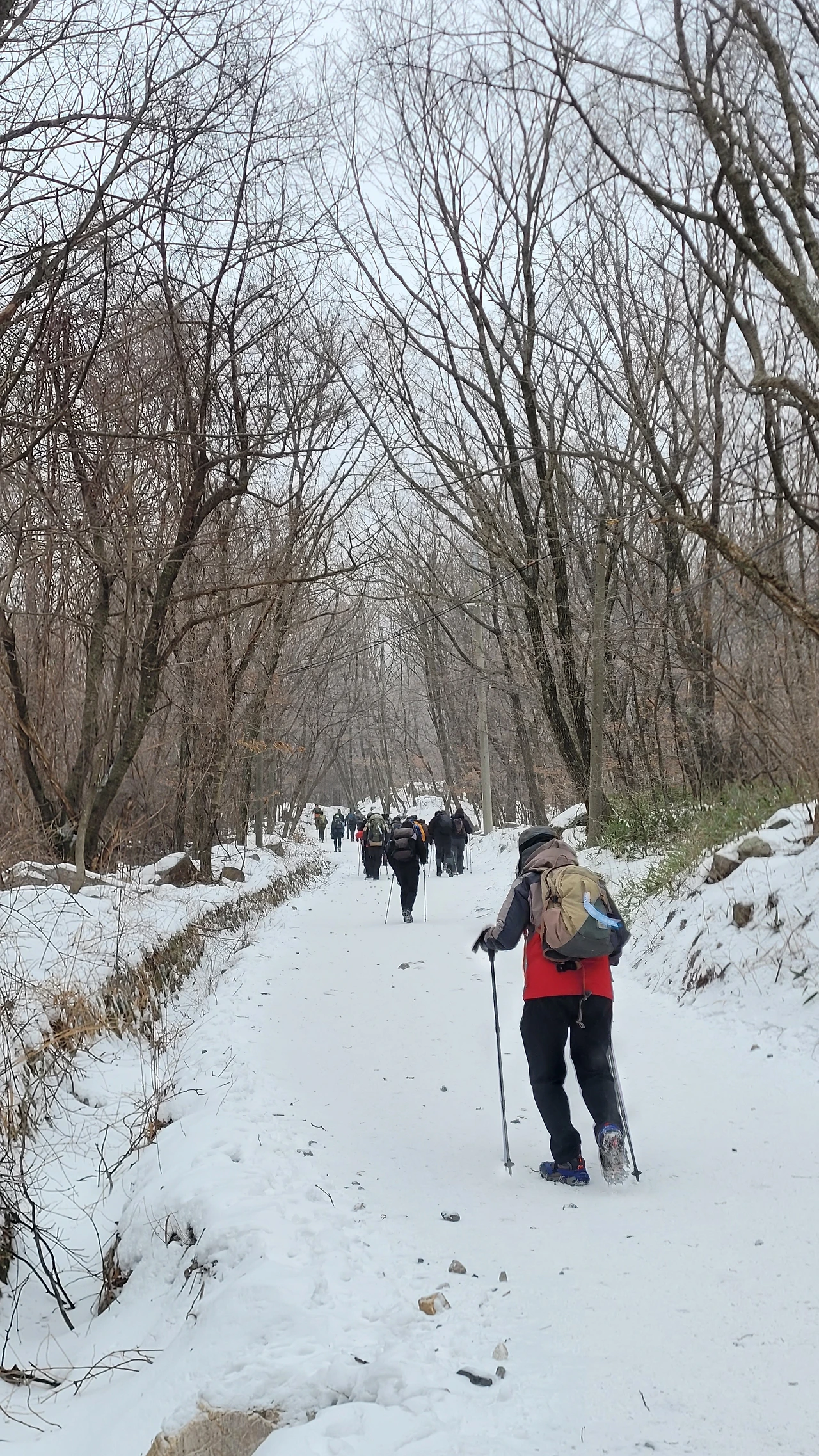 날씨는 잔뜩 흐렸다. 하늘에서 눈이 금방 쏟아질 것 같았다.나목이 옹위한 산 자락에는 눈이 깔려있었다. 계속 오르막 길이 이어진다. 그래도 좀 수월하게 오르는 것은 연초부터 하고 있던 계단 오르기 덕분이다. 매일 21층 계단을 세 번을 반복해서 걷기 중인데 오르는 산길이 마치 계단을 오르는 느낌과 같았다. 상당한 거리를 올라야 했기에 아마도 평소 걷던 계단 오르기보다 강도가 심한 운동이 될 것이다. 그렇게 마음을 먹으니 몸도 가볍다.