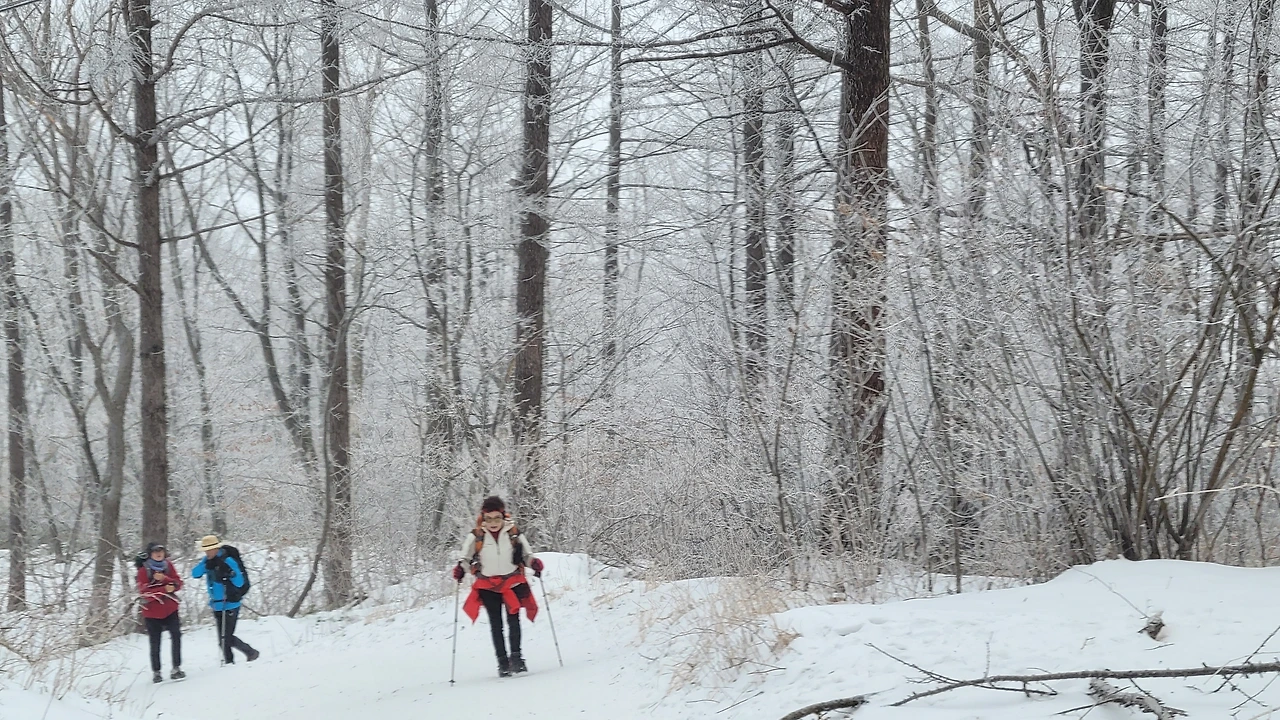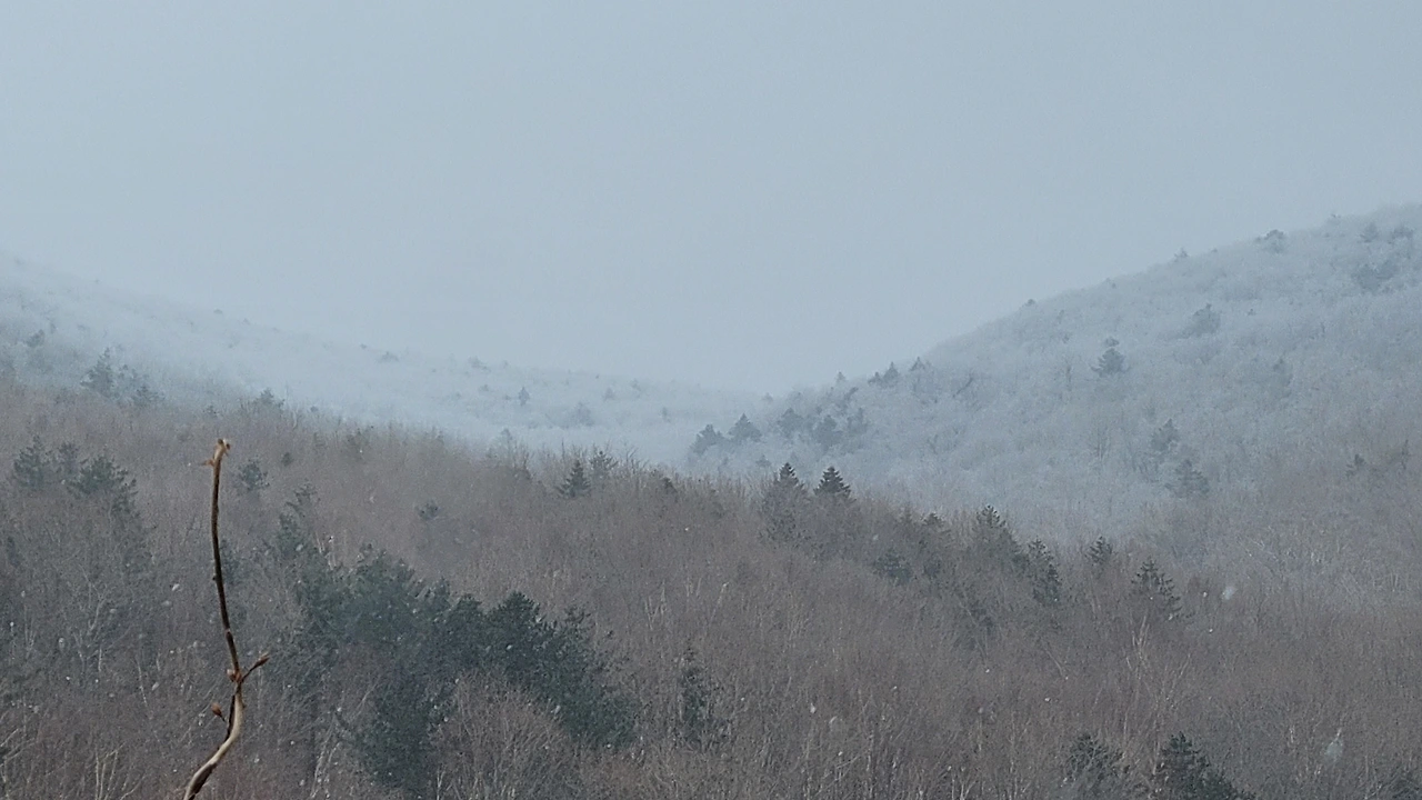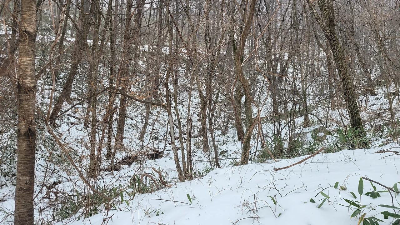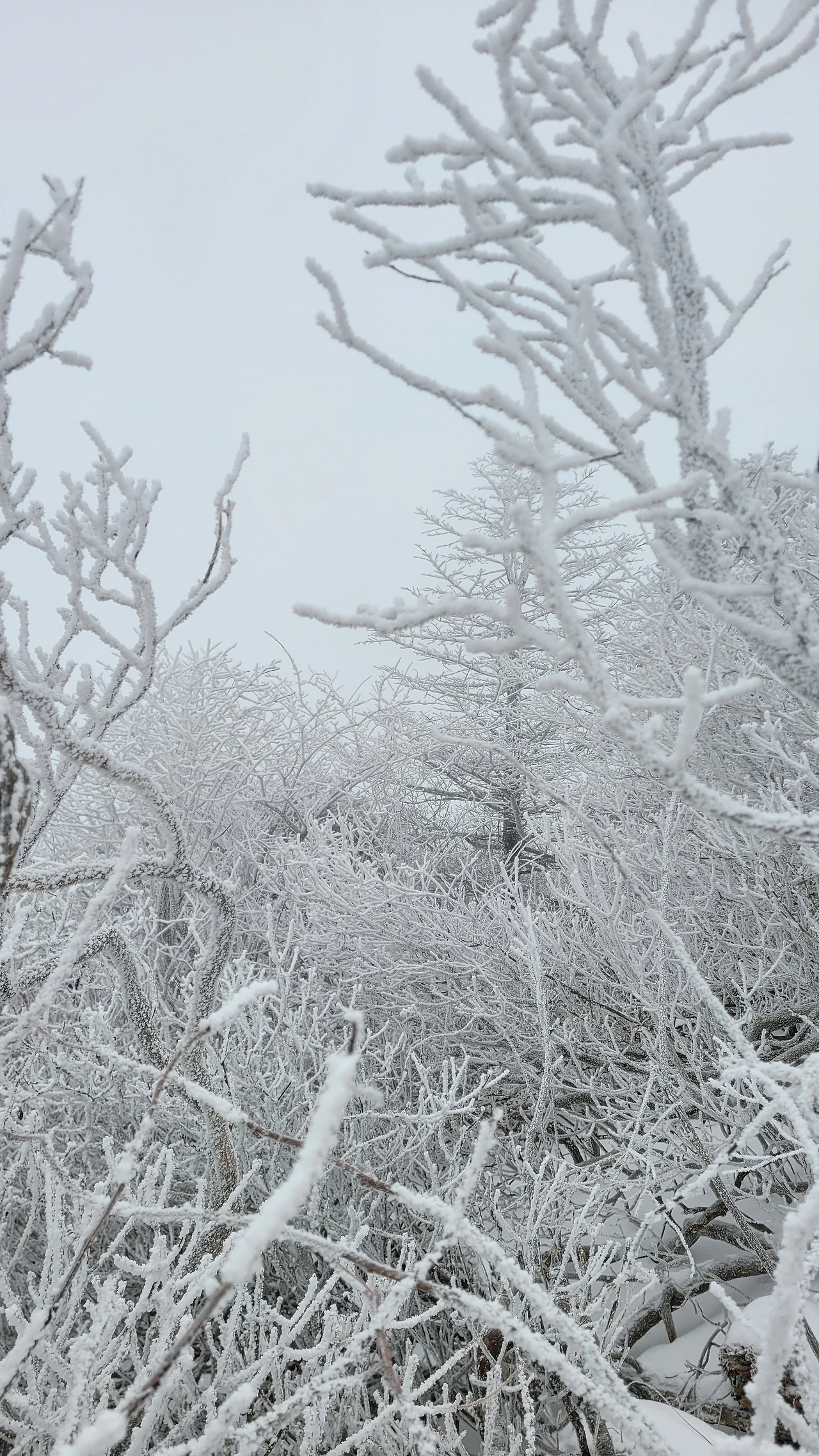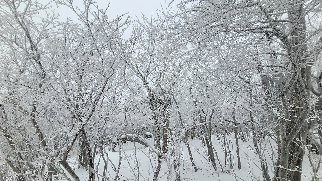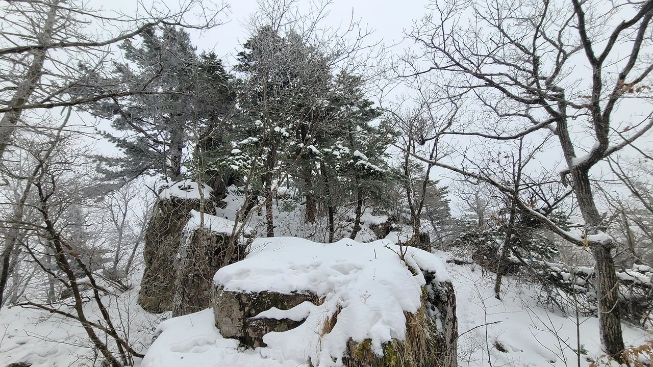 산을 올라갈수록 나뭇가지에도 성에가 어렸다. 대부분 낙엽이 진 나무들로 간혹 소나무와 주목이 간간이 보였지만 온통 헐벗은 나무뿐이다. 나무들이 산을 빽빽하게 채우고 있어서 나목들만 보여도 스산하지 않고 눈을 배경으로 편안하고 정갈한 풍경이다.