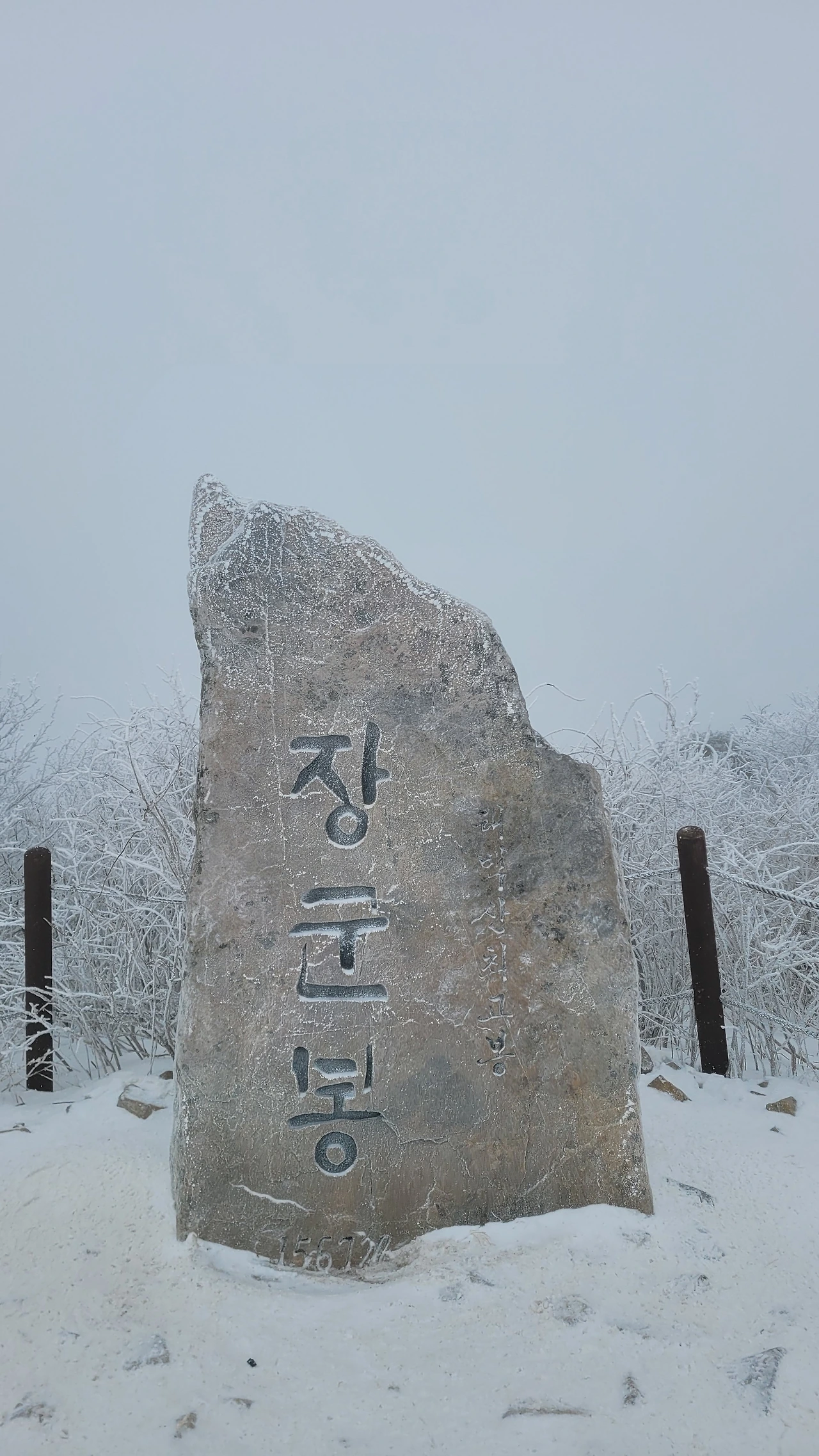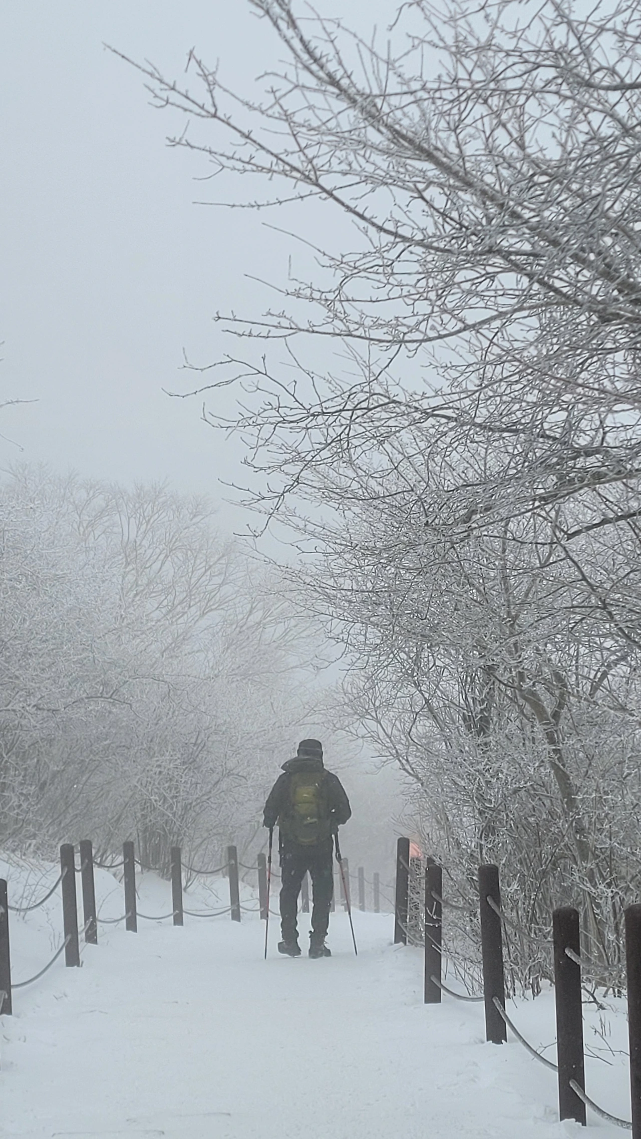 마침내 장군봉에 올랐다. 눈보라로 앞은 보이지 않고 주변만 보인다. 많은 이들이 걸은 길이지만 눈보라에 흔적은 없다. 마치 처음 발을 내딛는 기분이다. 선경에 빠져 일행과 뒤쳐진다. 인적이 보이질 않아 이 세상에 나 혼자인것 같다. 큰 나무는 거의 보이지 않고 잡목들만 눈 속에 파묻혀 숨 죽이고 있다. 지나온 길도 앞으로 가야 할 길도 끝없는 순백의 눈길이다.마치 영원으로 들어서는 문 같다.