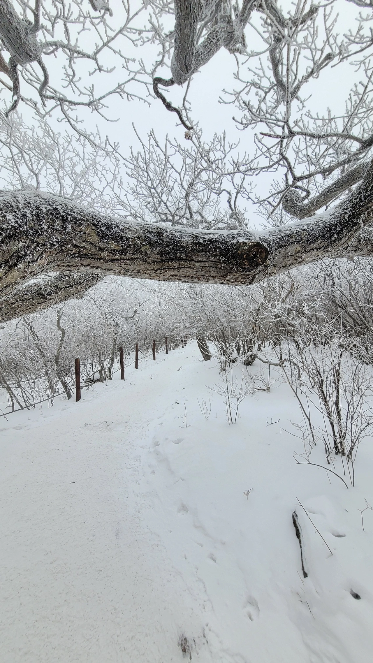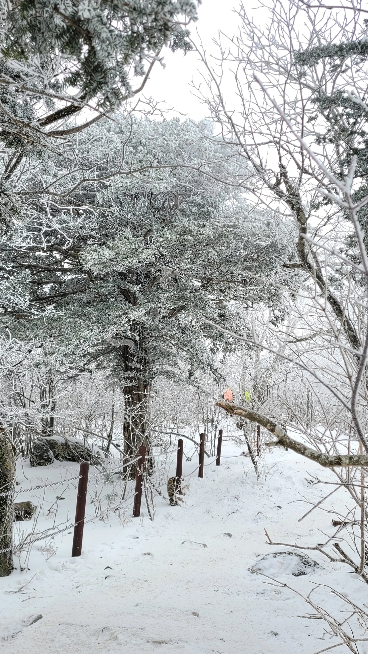 계속 올라가는 산길이 힘겨워진다. 고도가 높아질수록 눈이 빚어내는 풍경도 달라진다. 눈이 올 것으로 생각했는데 날씨가 흐려 시야는 잘 보이지 않는다. 바닥에만 남았던 눈이 이제는 나뭇가지에도 어려있다.