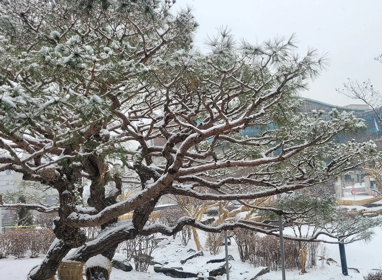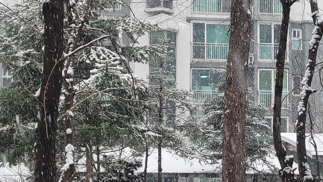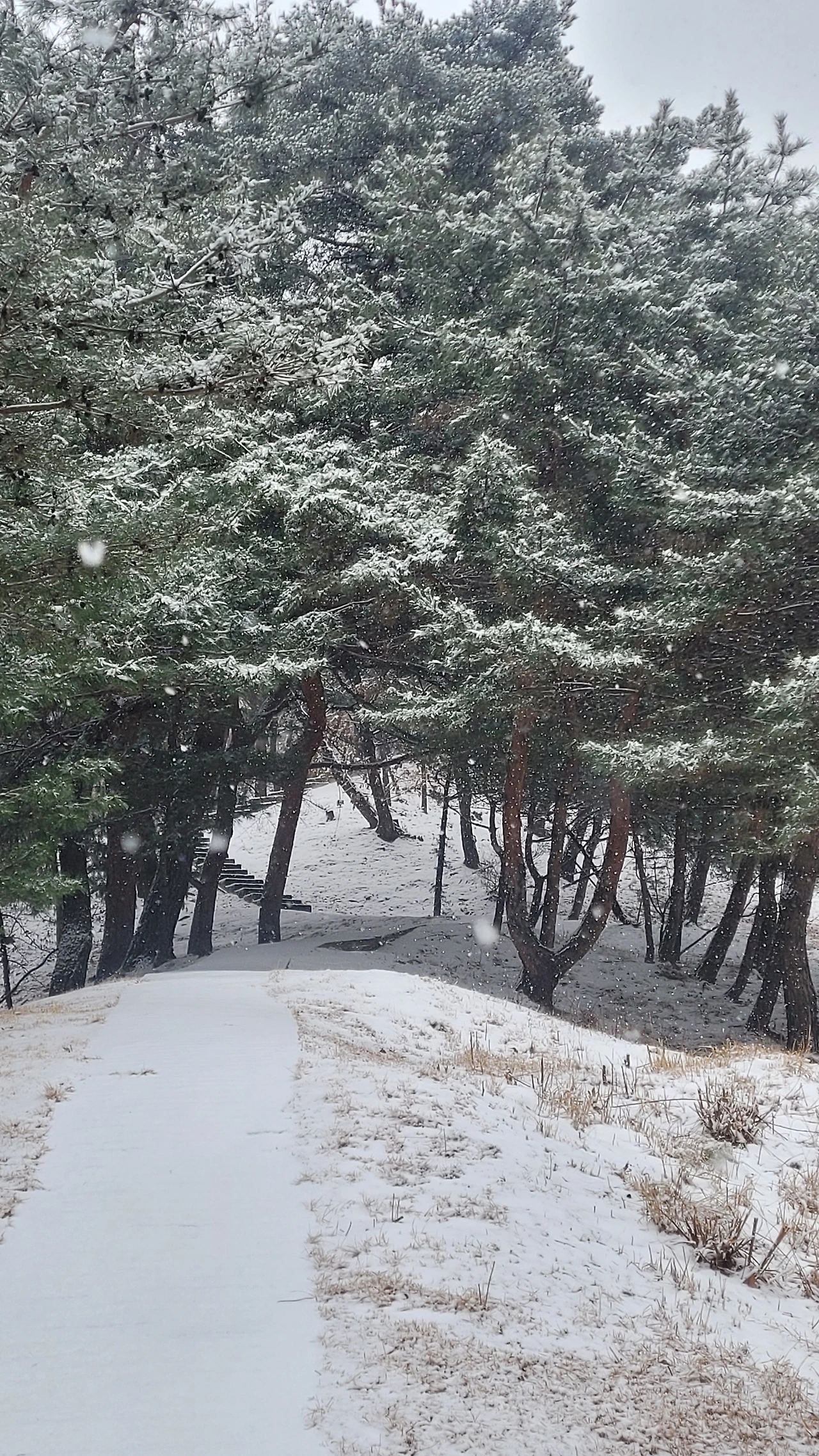 늘어지려는 게으른 마음을 다잡고 오리털 파카에 등산복과 등산화를 신고 가까운 천장산으로 산책을 나섰다. 풍경 사진을 찍으려면 장갑이 불편하지만 손이 시릴까 봐 두툼한 장갑도 꼈다. 강아지가 자기도 데려가 달라고 애처로운 눈빛을 보낸다. 그러나 젖은 땅에다 홀로 여유를 즐기려 따가운 시선을 뒤로한 채 미안한 마음을 품고 나간다. 아파트를 나서니 눈으로 덮인 나무들이 반갑게 인사를 전한다. 하늘에서는 마치 방앗간에서 빻은 쌀가루처럼 흰 눈송이가 춤추듯 날리고 있다. 눈에 젖을까 봐 모자를 뒤집어썼다. 시야가 좁아져 답답하지만 어쩔 수 없다. 중무장을 해서인지 하나도 춥지 않고 되려 신선하다.