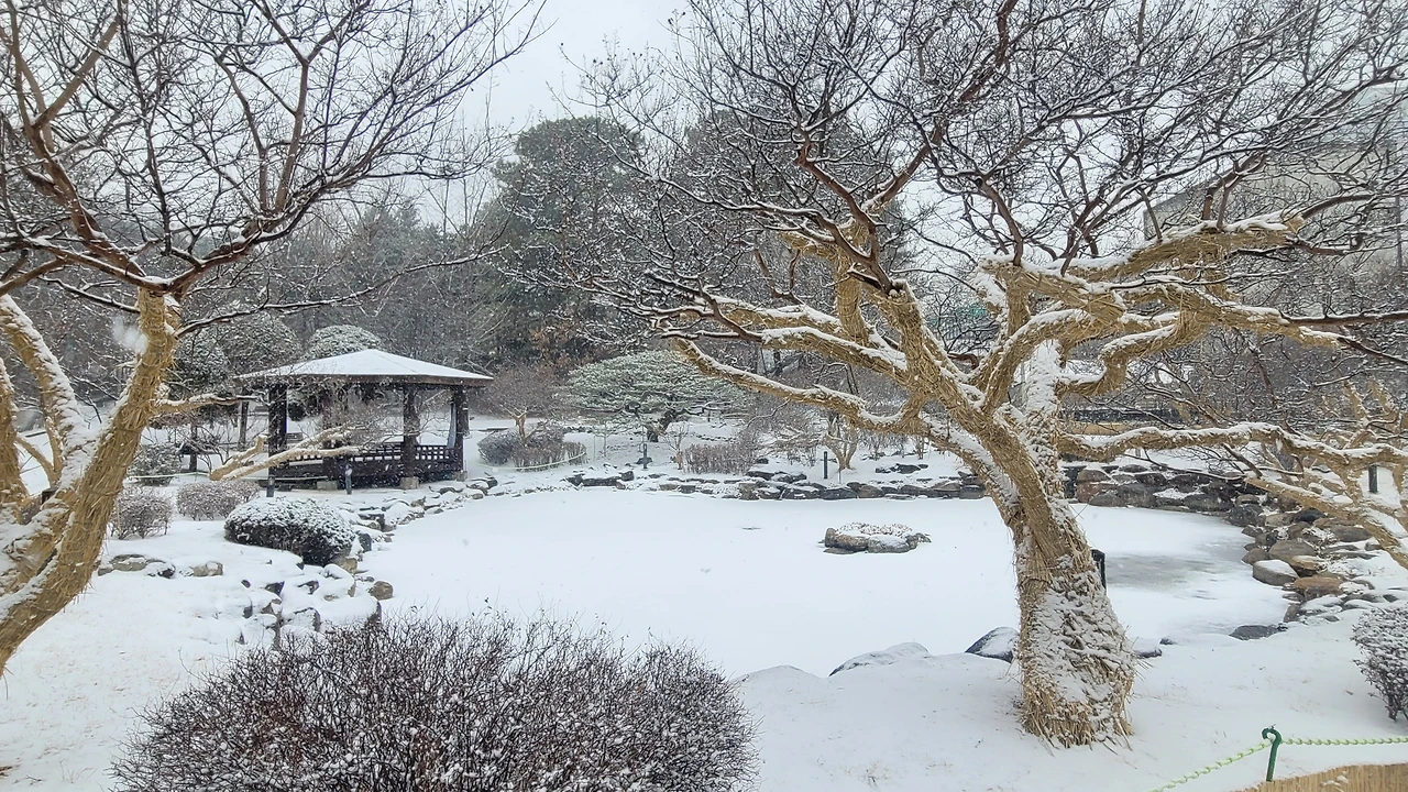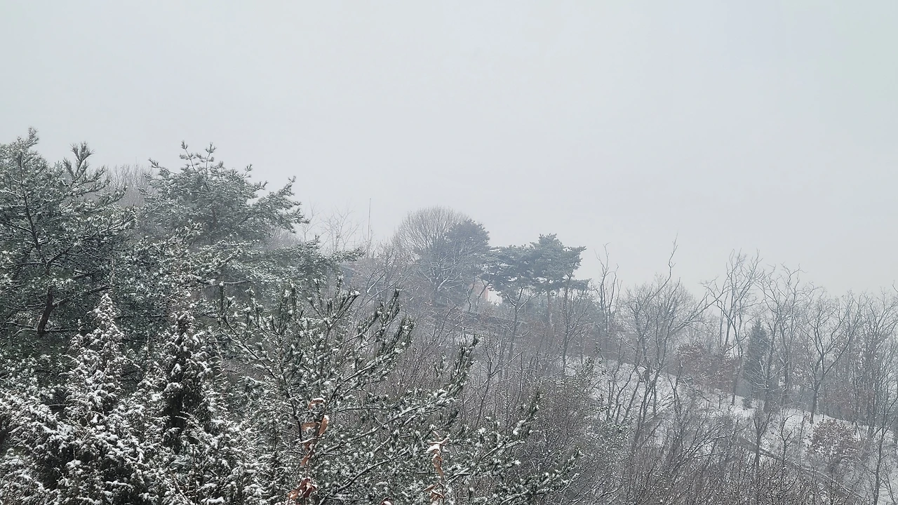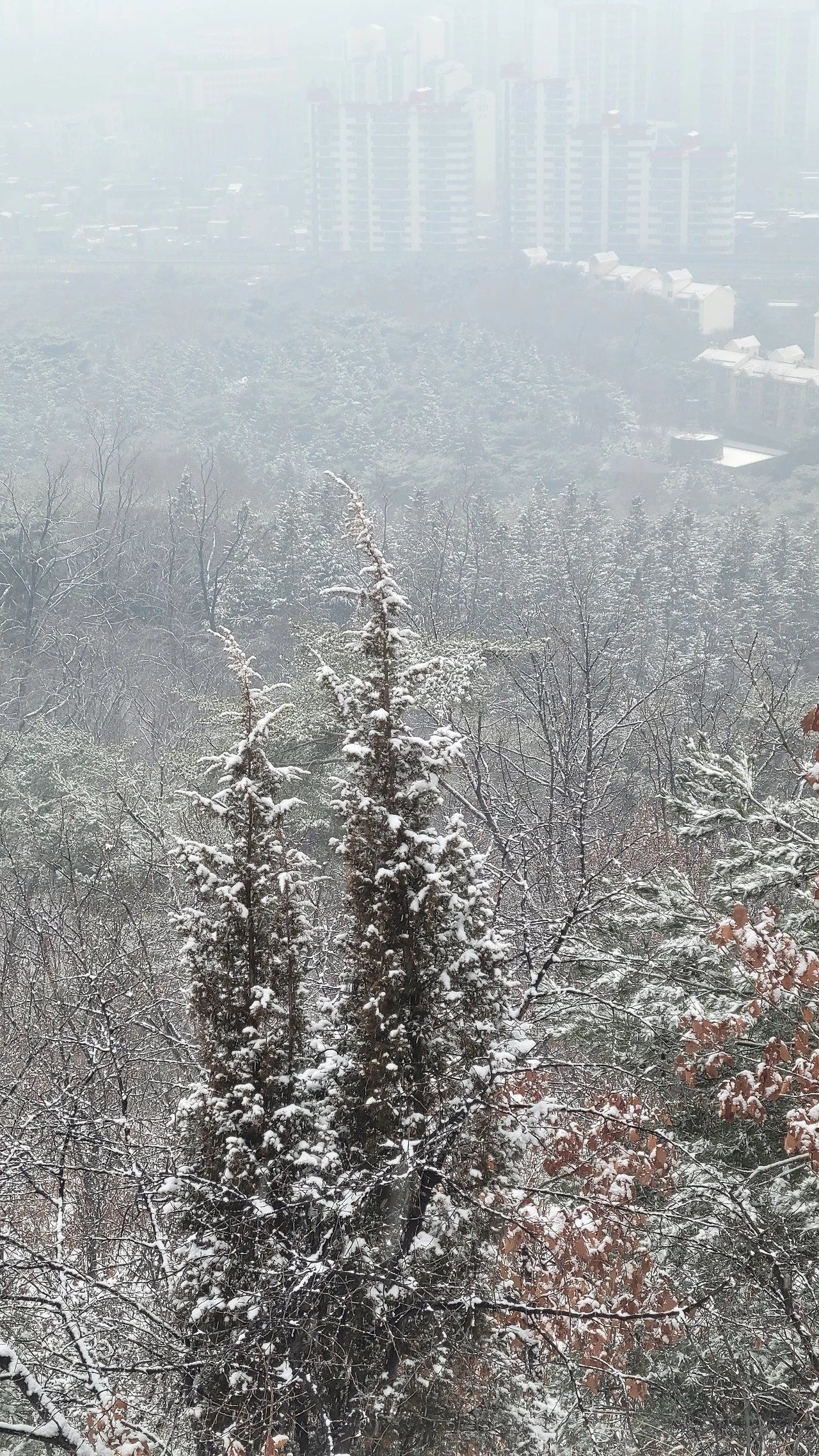 늘어지려는 게으른 마음을 다잡고 오리털 파카에 등산복과 등산화를 신고 가까운 천장산으로 산책을 나섰다. 풍경 사진을 찍으려면 장갑이 불편하지만 손이 시릴까 봐 두툼한 장갑도 꼈다. 강아지가 자기도 데려가 달라고 애처로운 눈빛을 보낸다. 그러나 젖은 땅에다 홀로 여유를 즐기려 따가운 시선을 뒤로한 채 미안한 마음을 품고 나간다. 아파트를 나서니 눈으로 덮인 나무들이 반갑게 인사를 전한다. 하늘에서는 마치 방앗간에서 빻은 쌀가루처럼 흰 눈송이가 춤추듯 날리고 있다. 눈에 젖을까 봐 모자를 뒤집어썼다. 시야가 좁아져 답답하지만 어쩔 수 없다. 중무장을 해서인지 하나도 춥지 않고 되려 신선하다.