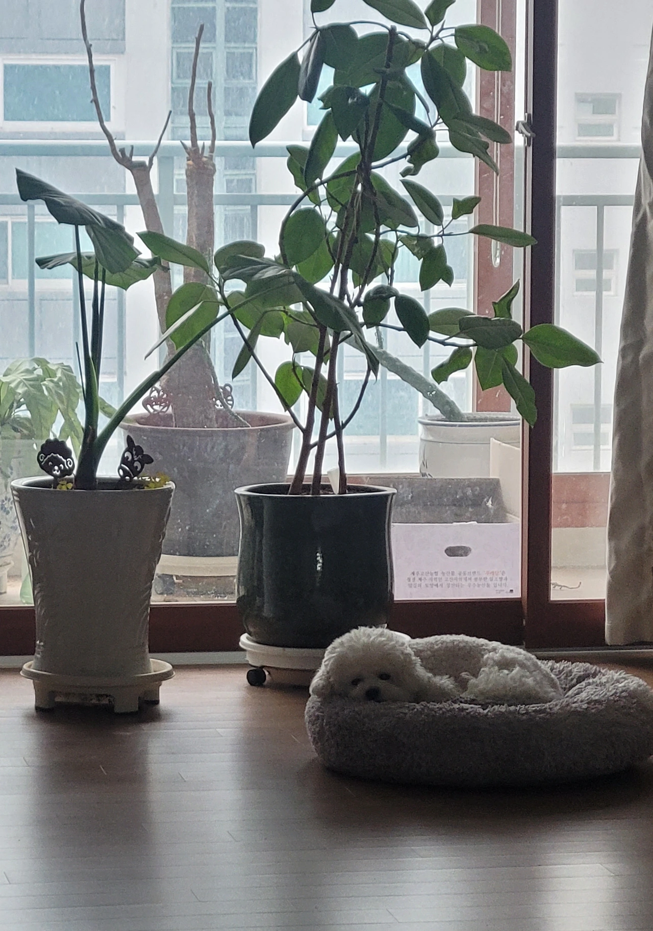 지난밤을 설쳐서 꽤 피곤한 오전이다. 글쓰기 챌린지로 새벽에 기상해서 글을 쓰고는 다시 누워 잠을 청했다. 여전히 잠이 오질 않아 그냥 일어났다. 아침이 한참 지난 시각에 거실에 나왔더니 베란다 창밖으로 눈발이 날린다. 따뜻하고 푹신한 소파에 자리 잡은 반려견 쁨이는 쿨쿨 숙면 중이다.