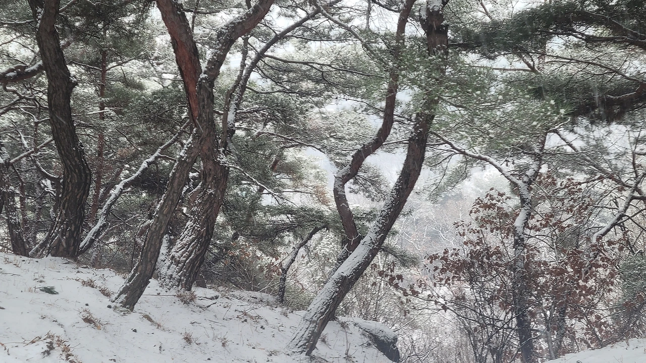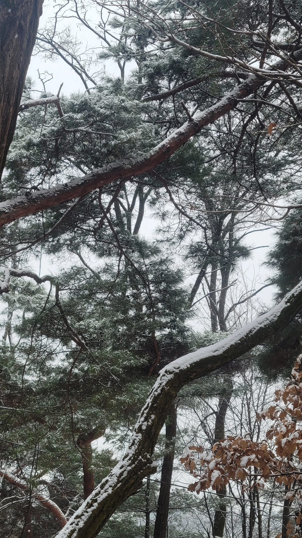 들어선 산길에도 눈이 제법 쌓였다. 하늘을 가득 수놓으며 눈은 하염없이 내린다. 빈 산길을 홀로 걷는다. 미끄러질까 봐 조심조심 걷지만 숲은 미동도 없이 고요하다. 옷을 잔뜩 껴입기도 했지만 기온도 그다지 낮지 않아 나무 등걸이나 가지에 쌓인 눈이 추워 보이지 않고 포근한 느낌이다. 솜옷을 두툼하게 입고 밖에서 신나게 뛰노는 어린아이들의 모습 같다.