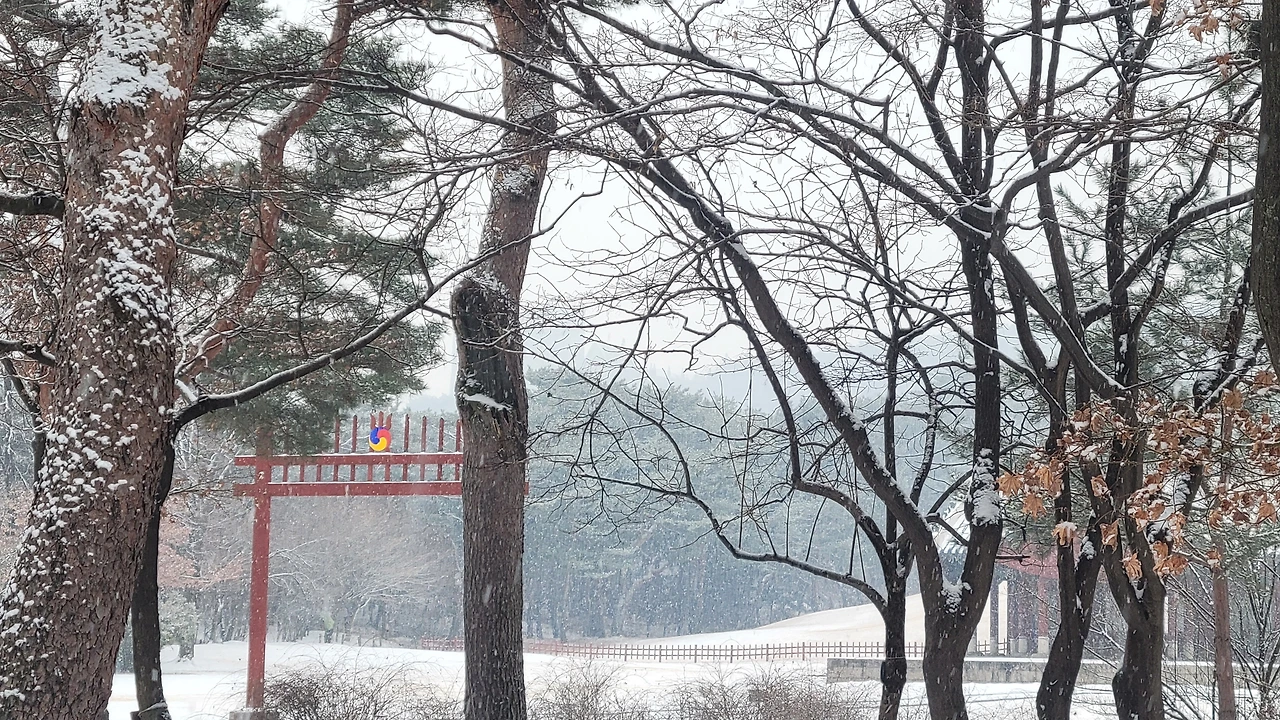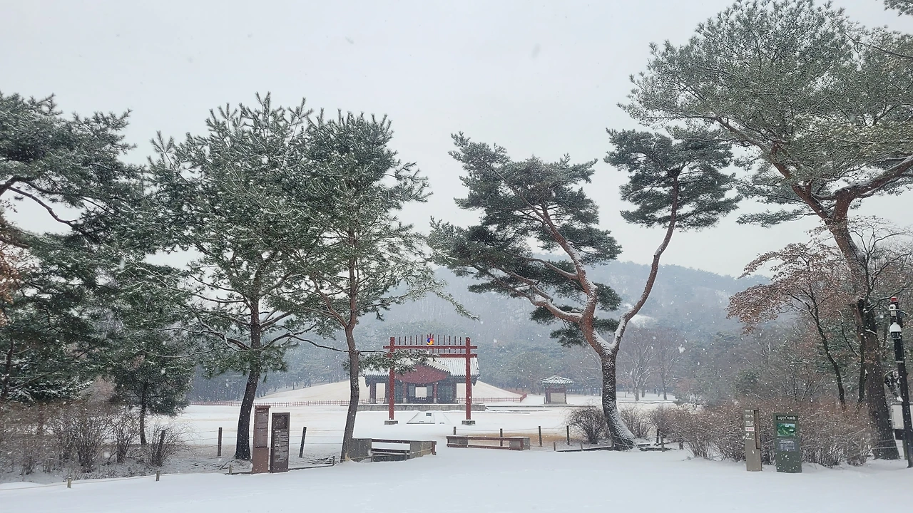 평소에도 의릉은 조신한 분위기지만 오늘은 유독 더 차분하다. 깨끗한 순백이 빚는 고요함이 더해서일까? 입구의 소나무도 더 의젓해 보인다. 조용한 경치가 마음에 들어와 자리를 잡는다.