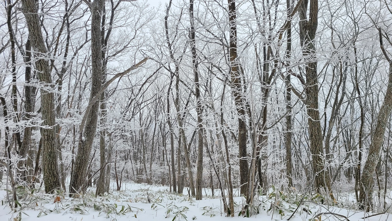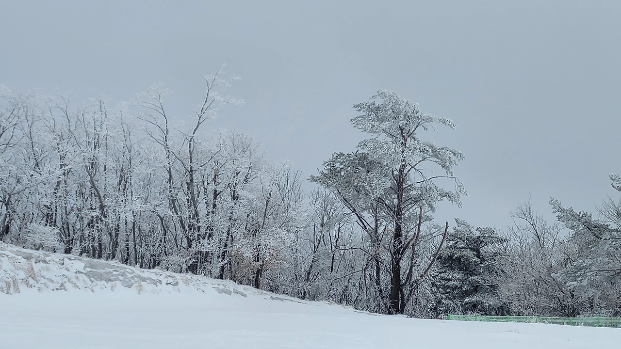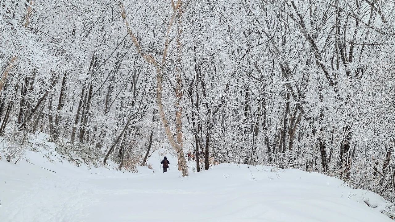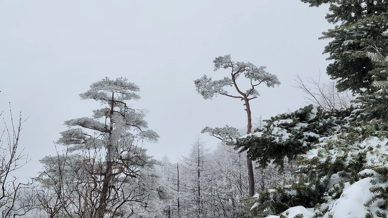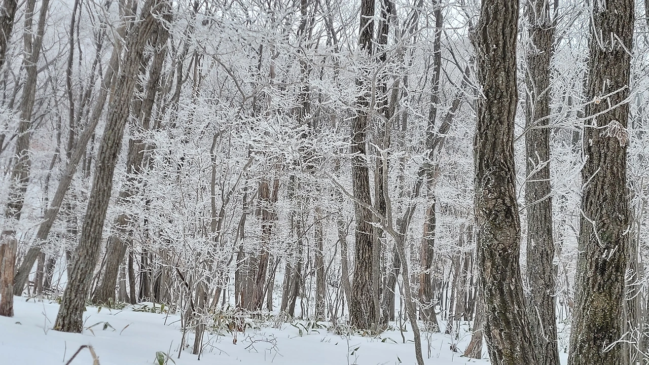 순백으로 덮인 관목의 여리고 촘촘한 가지가 세심하게 조각하고 다듬은 공예품처럼 숲을 빛낸다. 가을 숲에서 볼 수 없었던 숨겨진 매력이다. 잣나무와 소나무의 솔잎에도 크리스털 장식으로 한껏 치장을 했다. 순수한 자연에 젖어 마음도 하얗게 물든다.