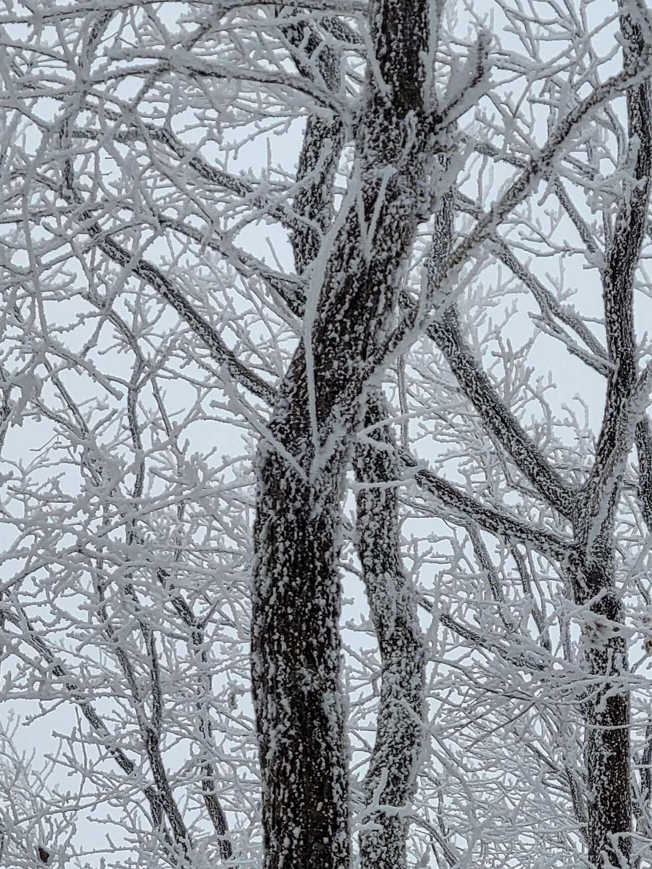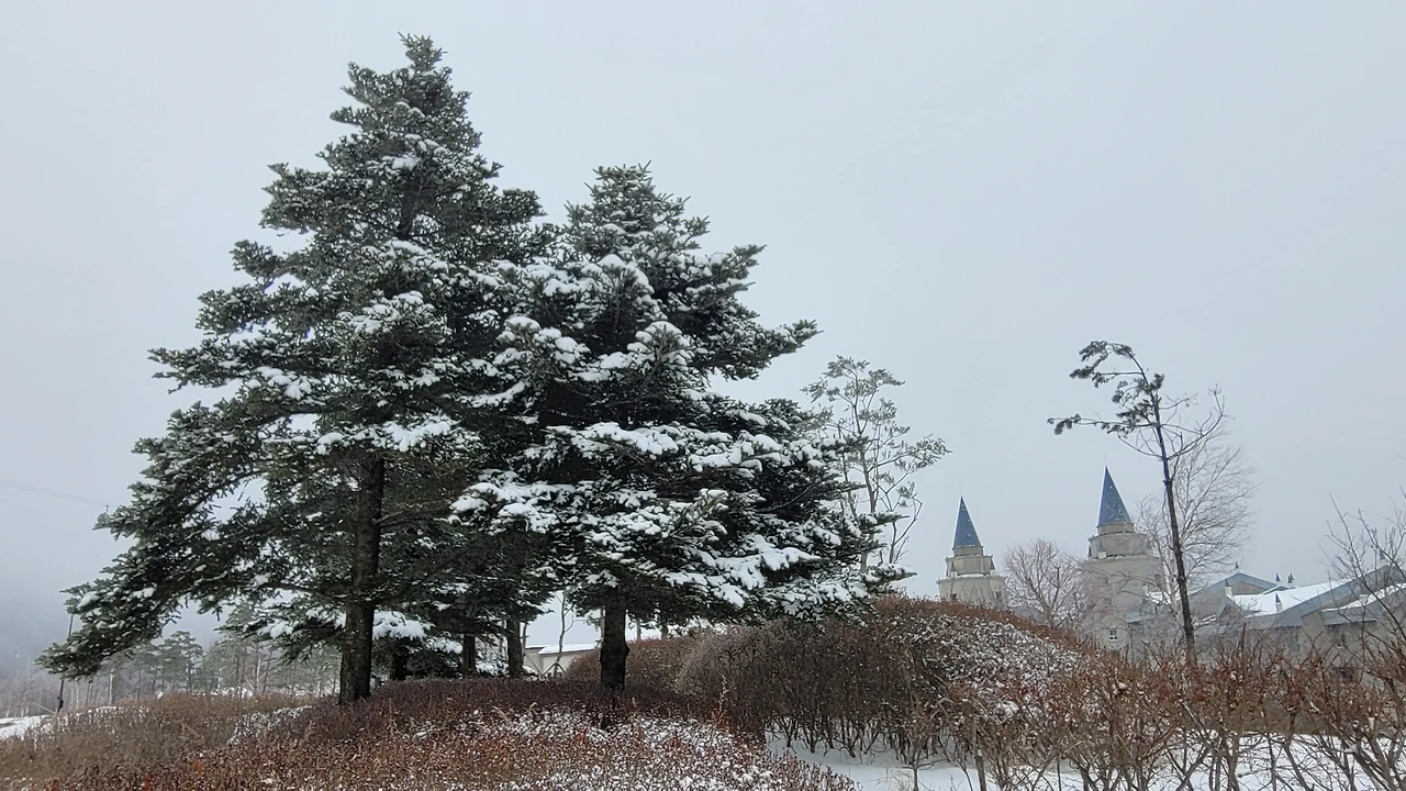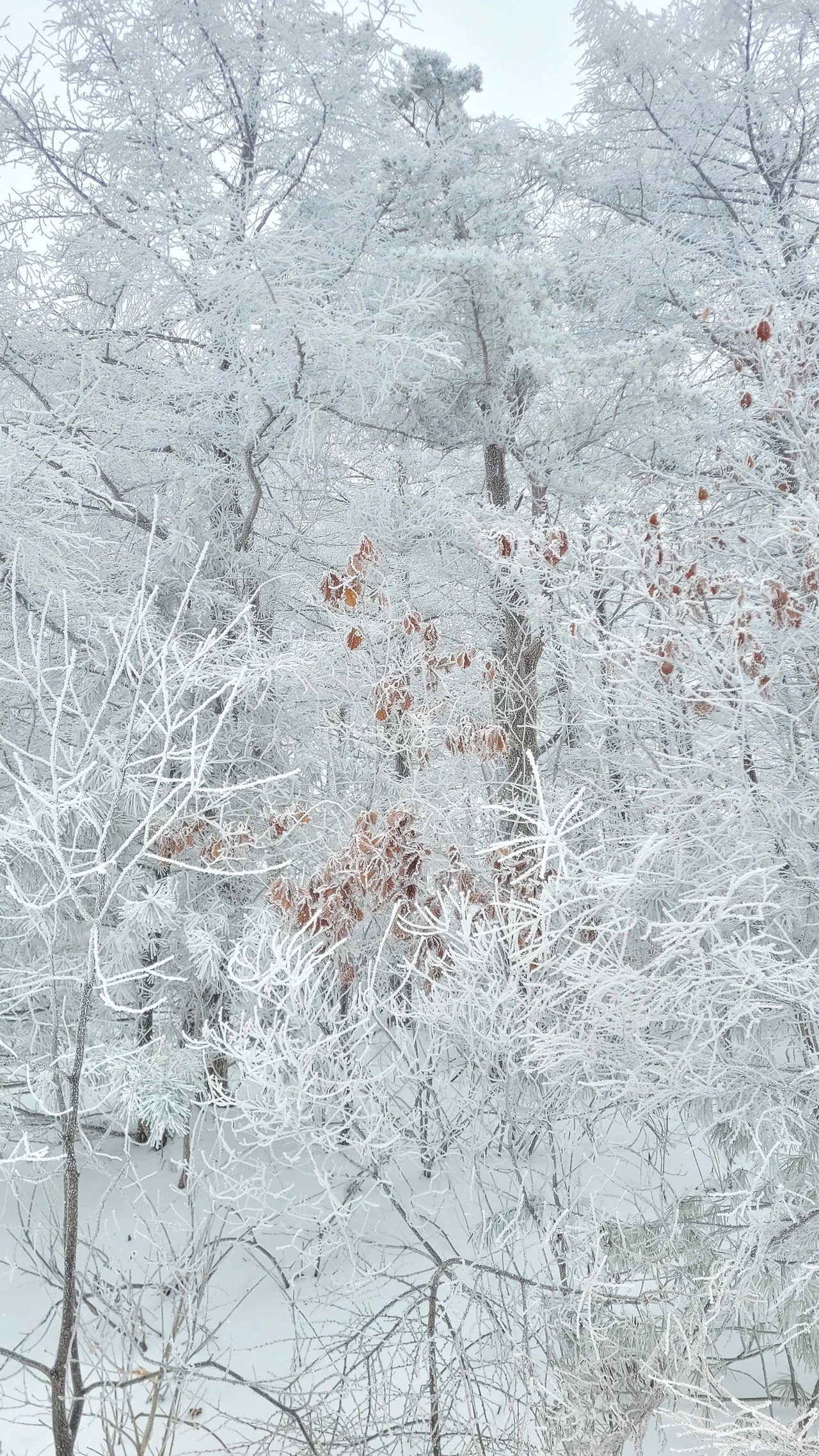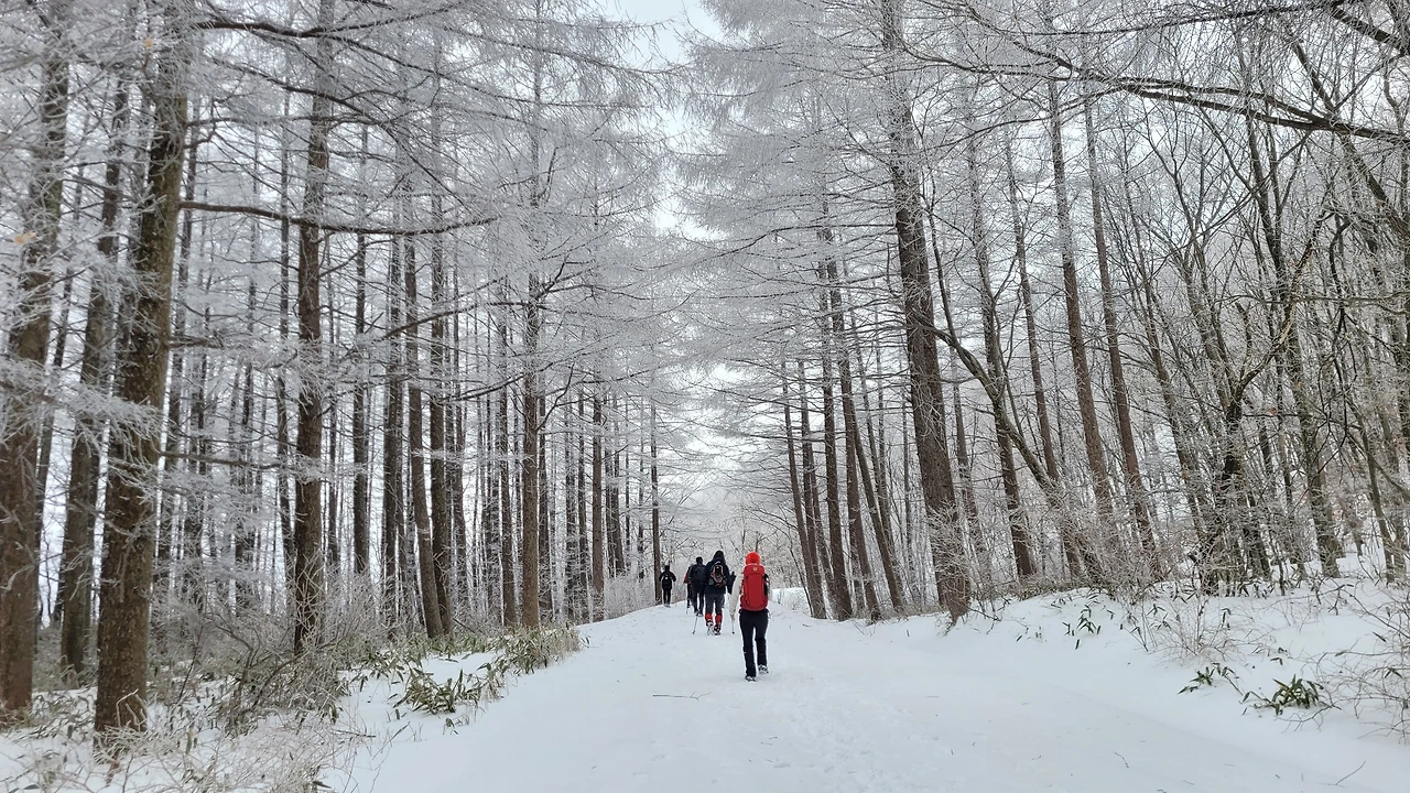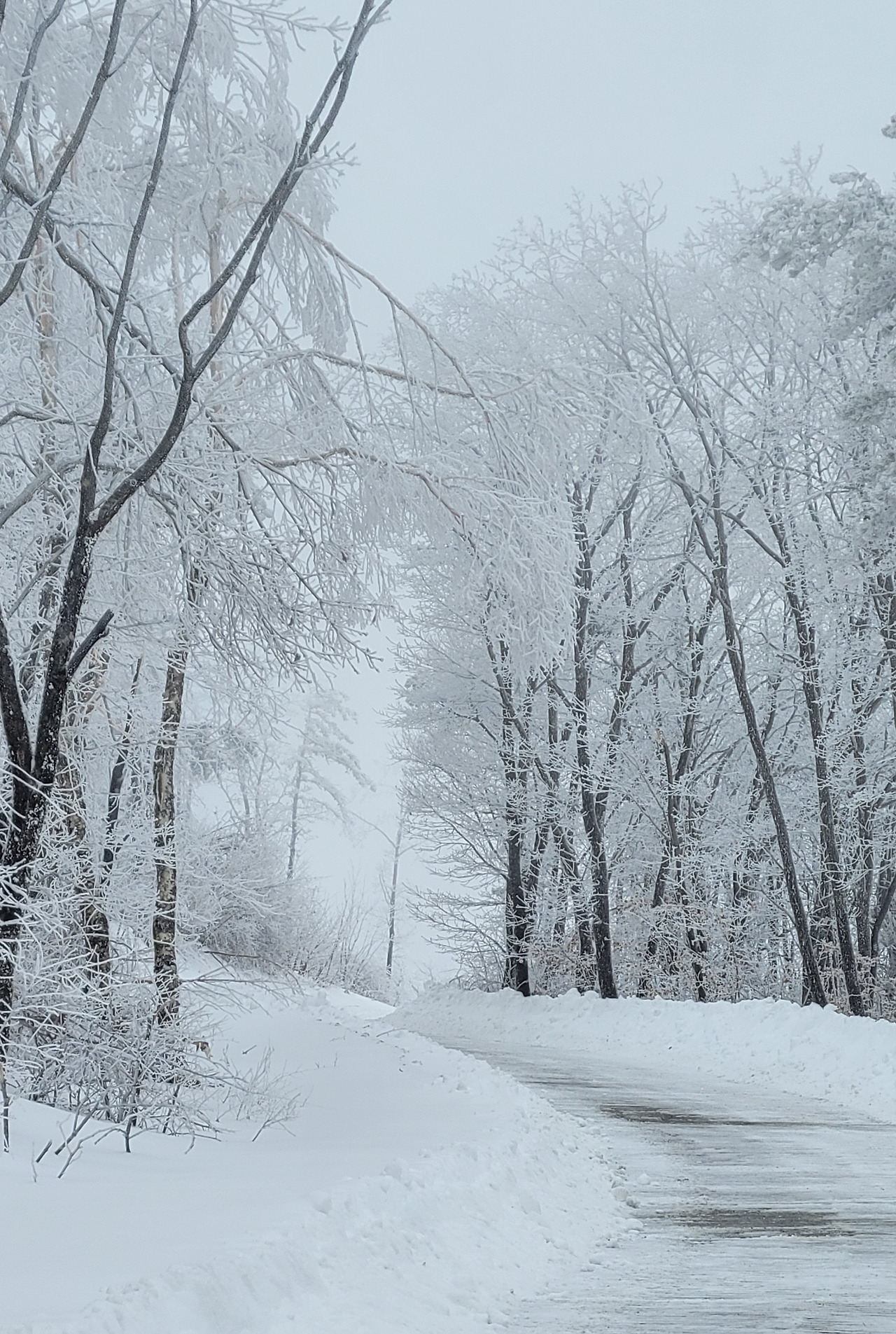 순백으로 덮인 관목의 여리고 촘촘한 가지가 세심하게 조각하고 다듬은 공예품처럼 숲을 빛낸다. 가을 숲에서 볼 수 없었던 숨겨진 매력이다. 잣나무와 소나무의 솔잎에도 크리스털 장식으로 한껏 치장을 했다. 순수한 자연에 젖어 마음도 하얗게 물든다.